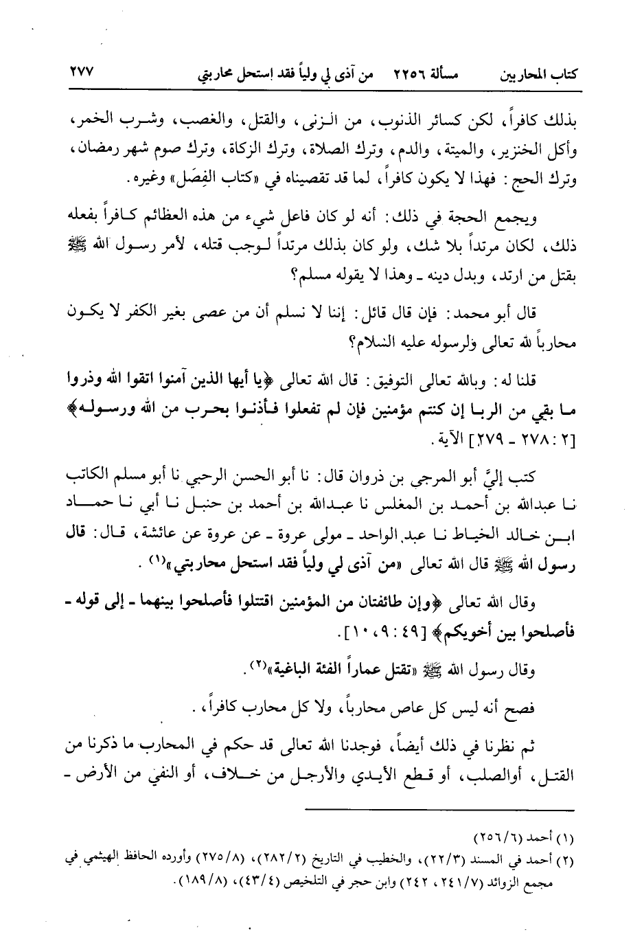 بِذَلِكَ كَافِرًا، لَكِنْ كَسَائِرِ الذُّنُوبِ، مِنْ الزِّنَا، وَالْقَتْلِ، وَالْغَصْبِ، وَشُرْبِ الْخَمْرِ، وَأَكْلِ الْخِنْزِيرِ، وَالْمَيْتَةِ، وَالدَّمِ، وَتَرْكِ الصَّلَاةِ، وَتَرْكِ الزَّكَاةِ، وَتَرْكِ صَوْمِ شَهْرِ رَمَضَانَ، وَتَرْكِ الْحَجِّ: فَهَذَا لَا يَكُونُ كَافِرًا، لِمَا قَدْ تَقَصَّيْنَاهُ فِي " كِتَابِ الْفَصْلِ " وَغَيْرِهِ. وَيَجْمَعُ الْحُجَّةَ فِي ذَلِكَ: أَنَّهُ لَوْ كَانَ فَاعِلُ شَيْءٍ مِنْ هَذِهِ الْعَظَائِمِ كَافِرًا بِفِعْلِهِ ذَلِكَ، لَكَانَ مُرْتَدًّا بِلَا شَكٍّ، وَلَوْ كَانَ بِذَلِكَ مُرْتَدًّا لَوَجَبَ قَتْلُهُ، لِأَمْرِ رَسُولِ اللَّهِ - صَلَّى اللَّهُ عَلَيْهِ وَسَلَّمَ - بِقَتْلِ مَنْ ارْتَدَّ، وَبَدَّلَ دِينَهُ - وَهَذَا لَا يَقُولُهُ مُسْلِمٌ قَالَ أَبُو مُحَمَّدٍ: فَإِنْ قَالَ قَائِلٌ: إنَّنَا لَا نُسَلِّمُ أَنَّ مَنْ عَصَى بِغَيْرِ الْكُفْرِ لَا يَكُونُ مُحَارِبًا لِلَّهِ تَعَالَى وَلِرَسُولِهِ - عَلَيْهِ السَّلَامُ - قُلْنَا لَهُ: وَبِاَللَّهِ تَعَالَى التَّوْفِيقُ: قَالَ اللَّهُ تَعَالَى {يَا أَيُّهَا الَّذِينَ آمَنُوا اتَّقُوا اللَّهَ وَذَرُوا مَا بَقِيَ مِنَ الرِّبَا إِنْ كُنْتُمْ مُؤْمِنِينَ - فَإِنْ لَمْ تَفْعَلُوا فَأْذَنُوا بِحَرْبٍ مِنَ اللَّهِ وَرَسُولِهِ} [البقرة: 278 - 279] الْآيَةَ. كَتَبَ إلَيَّ أَبُو الْمُرَجَّى بْنُ ذَرْوَانَ قَالَ: نا أَبُو الْحَسَنِ الرَّحَبِيُّ نا أَبُو مُسْلِمٍ الْكَاتِبُ نا عَبْدُ اللَّهِ بْنُ أَحْمَدَ بْنِ الْمُغَلِّسِ نا عَبْدُ اللَّهِ بْنُ أَحْمَدَ بْنِ حَنْبَلٍ نا أَبِي نا حَمَّادُ بْنُ خَالِدٍ الْخَيَّاطُ نا عَبْدُ الْوَاحِدِ - مَوْلَى عُرْوَةَ - عَنْ عُرْوَةَ عَنْ عَائِشَةَ، قَالَتْ: قَالَ رَسُولُ اللَّهِ - صَلَّى اللَّهُ عَلَيْهِ وَسَلَّمَ - «قَالَ اللَّهُ تَعَالَى مَنْ آذَى لِي وَلِيًّا فَقَدْ اسْتَحَلَّ مُحَارَبَتِي» . وَقَالَ اللَّهُ تَعَالَى {وَإِنْ طَائِفَتَانِ مِنَ الْمُؤْمِنِينَ اقْتَتَلُوا فَأَصْلِحُوا بَيْنَهُمَا} [الحجرات: 9] إلَى قَوْلِهِ {فَأَصْلِحُوا بَيْنَ أَخَوَيْكُمْ} [الحجرات: 10] . وَقَالَ رَسُولُ اللَّهِ - صَلَّى اللَّهُ عَلَيْهِ وَسَلَّمَ - «تَقْتُلُ عَمَّارًا الْفِئَةُ الْبَاغِيَةُ» فَصَحَّ أَنَّهُ لَيْسَ كُلُّ عَاصٍ مُحَارِبًا، وَلَا كُلُّ مُحَارِبٍ كَافِرًا، ثُمَّ نَظَرْنَا فِي ذَلِكَ أَيْضًا، فَوَجَدْنَا اللَّهَ تَعَالَى قَدْ حَكَمَ فِي الْمُحَارِبِ مَا ذَكَرْنَا مِنْ الْقَتْلِ، أَوْ الصَّلْبِ، أَوْ قَطْعِ الْأَيْدِي وَالْأَرْجُلِ مِنْ خِلَافٍ، أَوْ النَّفْيِ مِنْ الْأَرْضِ -