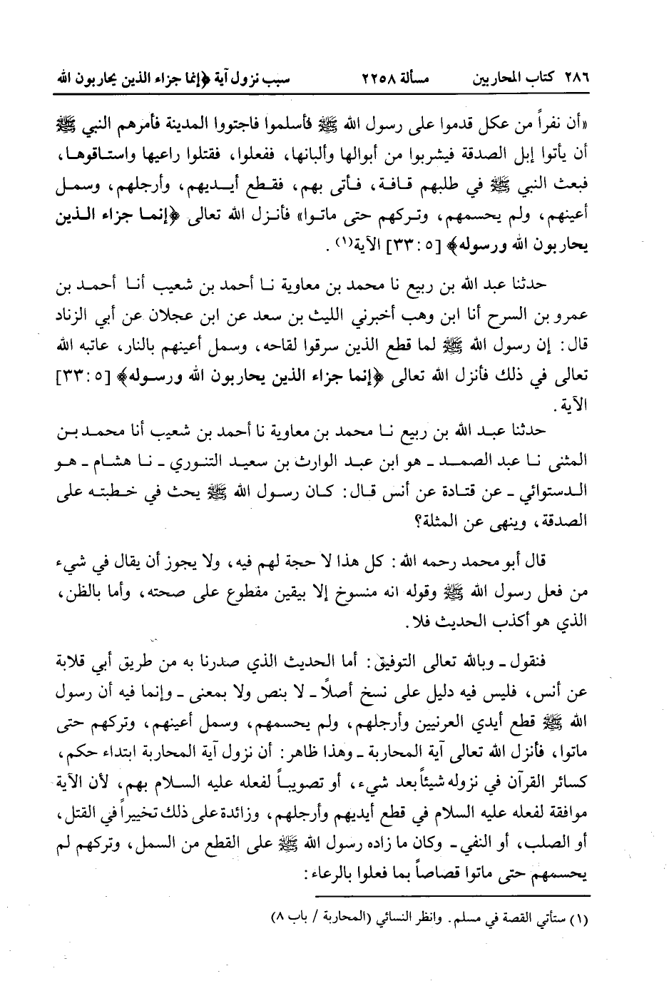 الْآيَةَ. حَدَّثَنَا عَبْدُ اللَّهِ بْنُ رَبِيعٍ نا مُحَمَّدُ بْنُ مُعَاوِيَةَ نا أَحْمَدُ بْنُ شُعَيْبٍ أَنَا أَحْمَدُ بْنُ عَمْرِو بْنِ السَّرْحِ أَنَا ابْنُ وَهْبٍ أَخْبَرَنِي اللَّيْثُ بْنُ سَعْدٍ عَنْ ابْنِ عَجْلَانَ عَنْ أَبِي الزِّنَادِ قَالَ: «إنَّ رَسُولَ اللَّهِ - صَلَّى اللَّهُ عَلَيْهِ وَسَلَّمَ - لَمَّا قَطَعَ الَّذِينَ سَرَقُوا لِقَاحَهُ، وَسَمَلَ أَعْيُنَهُمْ بِالنَّارِ، عَاتَبَهُ اللَّهُ تَعَالَى فِي ذَلِكَ فَأَنْزَلَ اللَّهُ تَعَالَى {إِنَّمَا جَزَاءُ الَّذِينَ يُحَارِبُونَ اللَّهَ وَرَسُولَهُ} [المائدة: 33] الْآيَةَ» حَدَّثَنَا عَبْدُ اللَّهِ بْنُ رَبِيعٍ نا مُحَمَّدُ بْنُ مُعَاوِيَةَ نا أَحْمَدُ بْنُ شُعَيْبٍ أَنَا مُحَمَّدُ بْنُ الْمُثَنَّى نا عَبْدُ الصَّمَدِ - هُوَ ابْنُ عَبْدِ الْوَارِثِ بْنِ سَعِيدٍ التَّنُّورِيُّ - نا هِشَامٌ - هُوَ الدَّسْتُوَائِيُّ - عَنْ قَتَادَةَ عَنْ أَنَسٍ قَالَ: كَانَ رَسُولُ اللَّهِ - صَلَّى اللَّهُ عَلَيْهِ وَسَلَّمَ - يَحُثُّ فِي خُطْبَتِهِ عَلَى الصَّدَقَةِ، وَيَنْهَى عَنْ الْمُثْلَةِ قَالَ أَبُو مُحَمَّدٍ - رَحِمَهُ اللَّهُ -: كُلُّ هَذَا لَا حُجَّةَ لَهُمْ فِيهِ، وَلَا يَجُوزُ أَنْ يُقَالَ فِي شَيْءٍ مِنْ فِعْلِ رَسُولِ اللَّهِ - صَلَّى اللَّهُ عَلَيْهِ وَسَلَّمَ - وَقَوْلِهِ إنَّهُ مَنْسُوخٌ إلَّا بِيَقِينٍ مَقْطُوعٍ عَلَى صِحَّتِهِ، وَأَمَّا بِالظَّنِّ، الَّذِي هُوَ أَكْذَبُ الْحَدِيثِ فَلَا. فَنَقُولُ - وَبِاَللَّهِ تَعَالَى التَّوْفِيقُ: أَمَّا الْحَدِيثُ الَّذِي صَدَّرْنَا بِهِ مِنْ طَرِيقِ أَبِي قِلَابَةَ عَنْ أَنَسٍ، فَلَيْسَ فِيهِ دَلِيلٌ عَلَى نَسْخٍ أَصْلًا - لَا بِنَصٍّ وَلَا بِمَعْنًى - وَإِنَّمَا فِيهِ أَنَّ رَسُولَ اللَّهِ - صَلَّى اللَّهُ عَلَيْهِ وَسَلَّمَ - قَطَعَ أَيْدِي الْعُرَنِيِّينَ وَأَرْجُلَهُمْ، وَلَمْ يَحْسِمْهُمْ، وَسَمَلَ أَعْيُنَهُمْ، وَتَرَكَهُمْ حَتَّى مَاتُوا، فَأَنْزَلَ اللَّهُ تَعَالَى آيَةَ الْمُحَارَبَةِ - وَهَذَا ظَاهِرٌ: أَنَّ نُزُولَ آيَةِ الْمُحَارَبَةِ ابْتِدَاءُ حُكْمٍ، كَسَائِرِ الْقُرْآنِ فِي نُزُولِهِ شَيْئًا بَعْدَ شَيْءٍ، أَوْ تَصْوِيبًا لِفِعْلِهِ - عَلَيْهِ السَّلَامُ - بِهِمْ؛ لِأَنَّ الْآيَةَ مُوَافِقَةٌ لِفِعْلِهِ - عَلَيْهِ السَّلَامُ - فِي قَطْعِ أَيْدِيهِمْ وَأَرْجُلِهِمْ، وَزَائِدَةٌ عَلَى ذَلِكَ تَخْيِيرًا فِي الْقَتْلِ، أَوْ الصَّلْبِ، أَوْ النَّفْيِ - وَكَانَ مَا زَادَهُ رَسُولُ اللَّهِ - صَلَّى اللَّهُ عَلَيْهِ وَسَلَّمَ - عَلَى الْقَطْعِ مِنْ السَّمْلِ، وَتَرْكِهِمْ لَمْ يَحْسِمْهُمْ حَتَّى مَاتُوا قِصَاصًا بِمَا فَعَلُوا بِالرِّعَاءِ: