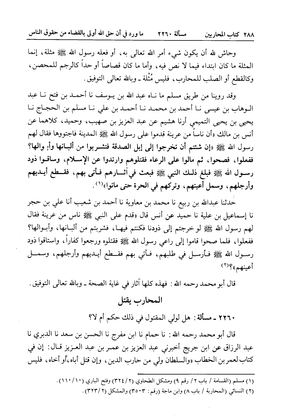وَقَدْ رُوِّينَا مِنْ طَرِيقِ مُسْلِمٍ مَا ناه عَبْدُ اللَّهِ بْنُ يُوسُفَ نا أَحْمَدُ بْنُ فَتْحٍ نا عَبْدُ الْوَهَّابِ بْنُ عِيسَى نا أَحْمَدُ بْنُ مُحَمَّدٍ نا أَحْمَدُ بْنُ عَلِيٍّ نا مُسْلِمُ بْنُ الْحَجَّاجِ نا يَحْيَى بْنُ يَحْيَى التَّمِيمِيُّ أرنا هُشَيْمٌ عَنْ عَبْدِ الْعَزِيزِ بْنِ صُهَيْبٍ، وَحُمَيْدٍ، كِلَاهُمَا عَنْ أَنَسِ بْنِ مَالِكٍ «أَنَّ نَاسًا مِنْ عُرَيْنَةَ قَدِمُوا عَلَى رَسُولِ اللَّهِ - صَلَّى اللَّهُ عَلَيْهِ وَسَلَّمَ - الْمَدِينَةَ فَاجْتَوَوْهَا فَقَالَ لَهُمْ رَسُولُ اللَّهِ - صَلَّى اللَّهُ عَلَيْهِ وَسَلَّمَ - إنْ شِئْتُمْ أَنْ تَخْرُجُوا إلَى إبِلِ الصَّدَقَةِ فَتَشْرَبُوا مِنْ أَلْبَانِهَا وَأَبْوَالِهَا؟ فَفَعَلُوا، فَصَحُّوا، ثُمَّ مَالُوا عَلَى الرِّعَاءِ فَقَتَلُوهُمْ وَارْتَدُّوا عَنْ الْإِسْلَامِ، وَسَاقُوا ذَوْدَ رَسُولِ اللَّهِ - صَلَّى اللَّهُ عَلَيْهِ وَسَلَّمَ - فَبَلَغَ ذَلِكَ النَّبِيَّ - صَلَّى اللَّهُ عَلَيْهِ وَسَلَّمَ - فَبَعَثَ فِي آثَارِهِمْ فَأُتِيَ بِهِمْ، فَقَطَعَ أَيْدِيَهُمْ وَأَرْجُلَهُمْ، وَسَمَلَ أَعْيُنَهُمْ، وَتَرَكَهُمْ فِي الْحَرَّةِ حَتَّى مَاتُوا» . حَدَّثَنَا عَبْدُ اللَّهِ بْنُ رَبِيعٍ نا مُحَمَّدُ بْنُ مُعَاوِيَةَ نا أَحْمَدُ بْنُ شُعَيْبٍ أَنَا عَلِيُّ بْنُ حُجْرٍ نا إسْمَاعِيلُ ابْنُ عُلَيَّةَ نا حُمَيْدٌ عَنْ أَنَسٍ قَالَ «قَدِمَ عَلَى النَّبِيِّ - صَلَّى اللَّهُ عَلَيْهِ وَسَلَّمَ - نَاسٌ مِنْ عُرَيْنَةَ فَقَالَ لَهُمْ رَسُولُ اللَّهِ - صَلَّى اللَّهُ عَلَيْهِ وَسَلَّمَ - لَوْ خَرَجْتُمْ إلَى ذَوْدِنَا فَكُنْتُمْ فِيهَا، فَشَرِبْتُمْ مِنْ أَلْبَانِهَا، وَأَبْوَالِهَا؟ فَفَعَلُوا، فَلَمَّا صَحُّوا قَامُوا إلَى رَاعِي رَسُولِ اللَّهِ - صَلَّى اللَّهُ عَلَيْهِ وَسَلَّمَ - فَقَتَلُوهُ وَرَجَعُوا كُفَّارًا، وَاسْتَاقُوا ذَوْدَ رَسُولِ اللَّهِ - صَلَّى اللَّهُ عَلَيْهِ وَسَلَّمَ - فَأَرْسَلَ فِي طَلَبِهِمْ، فَأُتِيَ بِهِمْ فَقَطَعَ أَيْدِيَهُمْ وَأَرْجُلَهُمْ، وَسَمَلَ أَعْيُنَهُمْ» قَالَ أَبُو مُحَمَّدٍ - رَحِمَهُ اللَّهُ -: فَهَذِهِ كُلُّهَا آثَارٌ فِي غَايَةِ الصِّحَّةِ - وَبِاَللَّهِ تَعَالَى التَّوْفِيقُ. الْمُحَارِبُ يُقْتَلُ
