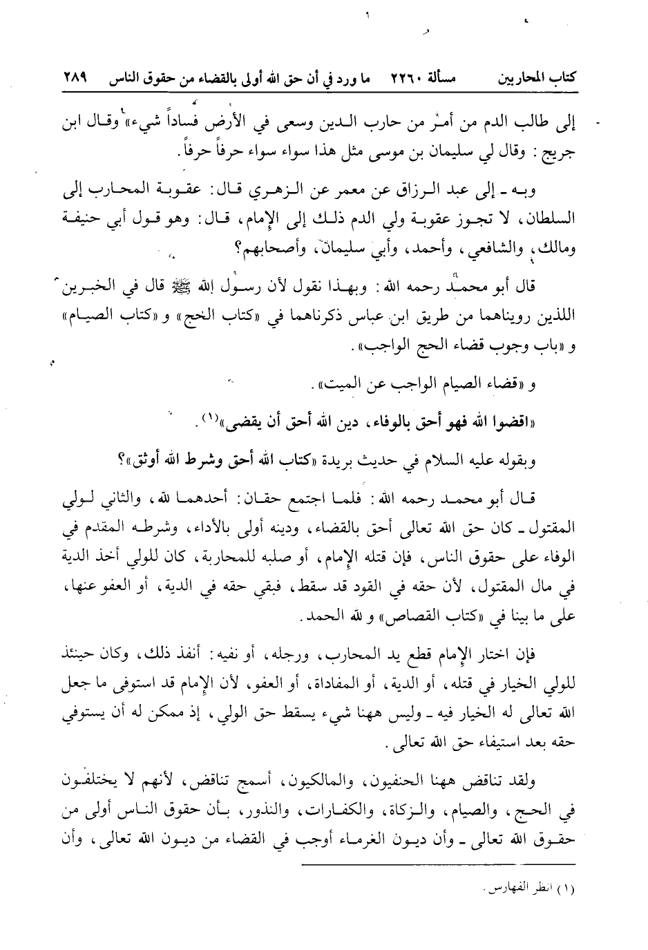 «اقْضُوا اللَّهَ فَهُوَ أَحَقُّ بِالْوَفَاءِ، دَيْنُ اللَّهِ أَحَقُّ أَنْ يُقْضَى» . وَبِقَوْلِهِ - عَلَيْهِ السَّلَامُ - فِي حَدِيثِ بُرَيْدَةَ «كِتَابُ اللَّهِ أَحَقُّ وَشَرْطُ اللَّهِ أَوْثَقُ» قَالَ أَبُو مُحَمَّدٍ - رَحِمَهُ اللَّهُ -: فَلَمَّا اجْتَمَعَ حَقَّانِ: أَحَدُهُمَا لِلَّهِ، وَالثَّانِي لِوَلِيِّ الْمَقْتُولِ - كَانَ حَقُّ اللَّهِ تَعَالَى أَحَقَّ بِالْقَضَاءِ وَدَيْنُهُ أَوْلَى بِالْأَدَاءِ، وَشَرْطُهُ الْمُقَدَّمُ فِي الْوَفَاءِ عَلَى حُقُوقِ النَّاسِ، فَإِنْ قَتَلَهُ الْإِمَامُ، أَوْ صَلَبَهُ لِلْمُحَارَبَةِ، كَانَ لِلْوَلِيِّ أَخْذُ الدِّيَةِ فِي مَالِ الْمَقْتُولِ؛ لِأَنَّ حَقَّهُ فِي الْقَوَدِ قَدْ سَقَطَ، فَبَقِيَ حَقُّهُ فِي الدِّيَةِ، أَوْ الْعَفْوِ عَنْهَا، عَلَى مَا بَيَّنَّا فِي " كِتَابِ الْقِصَاصِ " وَلِلَّهِ الْحَمْدُ. فَإِنْ اخْتَارَ الْإِمَامُ قَطْعَ يَدِ الْمُحَارِبِ، وَرِجْلِهِ، أَوْ نَفْيِهِ: أَنْفَذَ ذَلِكَ، وَكَانَ حِينَئِذٍ لِلْوَلِيِّ الْخِيَارُ فِي قَتْلِهِ، أَوْ الدِّيَةِ، أَوْ الْمُفَادَاةِ، أَوْ الْعَفْوِ؛ لِأَنَّ الْإِمَامَ قَدْ اسْتَوْفَى مَا جَعَلَ اللَّهُ تَعَالَى لَهُ الْخِيَارَ فِيهِ - وَلَيْسَ هَاهُنَا شَيْءٌ يُسْقِطُ حَقَّ الْوَلِيِّ، إذْ مُمْكِنٌ لَهُ أَنْ يَسْتَوْفِيَ حَقَّهُ بَعْدَ اسْتِيفَاءِ حَقِّ اللَّهِ تَعَالَى.