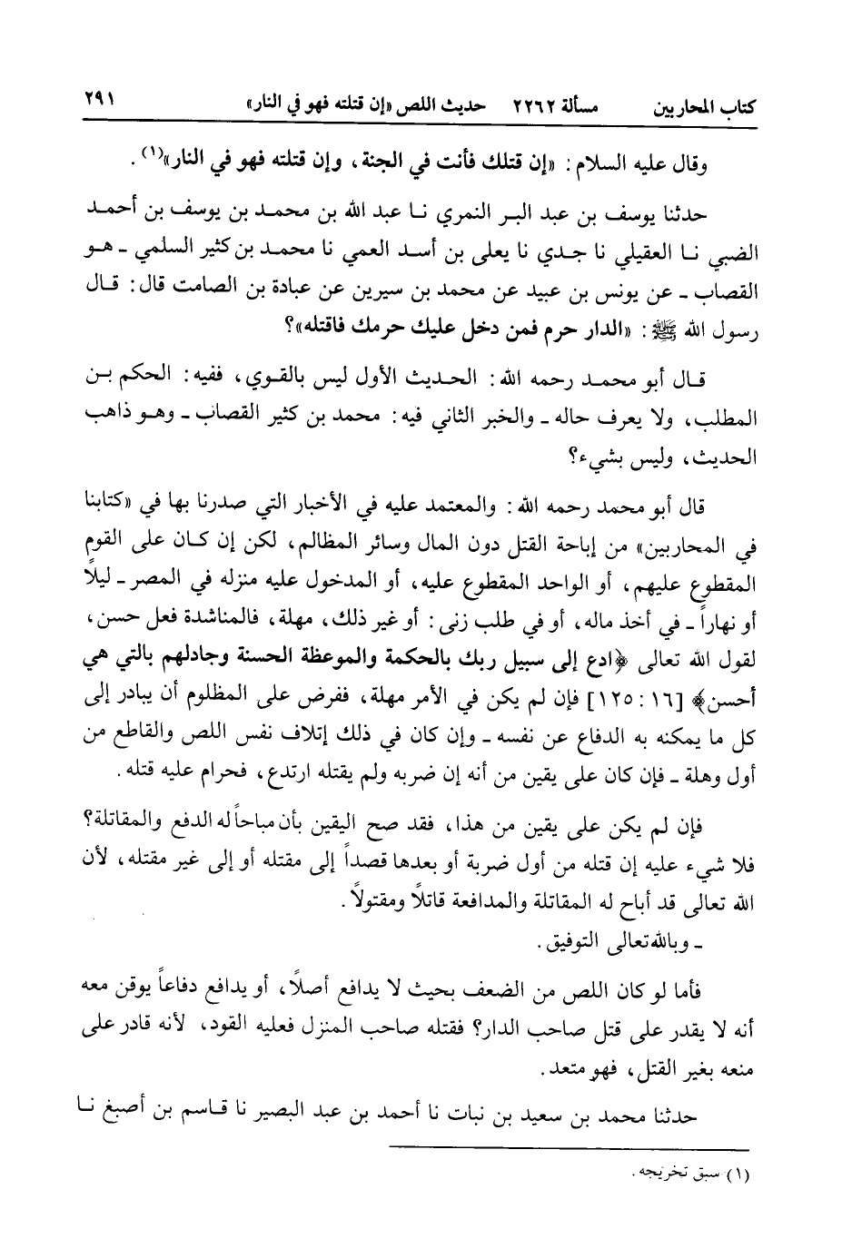 حَدَّثَنَا يُوسُفُ بْنُ عَبْدِ الْبَرِّ النَّمَرِيُّ نا عَبْدُ اللَّهِ بْنُ مُحَمَّدِ بْنِ يُوسُفَ بْنِ أَحْمَدَ الضَّبِّيُّ نا الْعُقَيْلِيُّ نا جَدِّي نا يَعْلَى بْنُ أَسَدٍ الْعَمِّيُّ نا مُحَمَّدُ بْنُ كَثِيرٍ السُّلَمِيُّ - هُوَ الْقَصَّابُ - عَنْ يُونُسَ بْنِ عُبَيْدٍ عَنْ مُحَمَّدِ بْنِ سِيرِينَ عَنْ عُبَادَةَ بْنِ الصَّامِتِ قَالَ: قَالَ رَسُولُ اللَّهِ - صَلَّى اللَّهُ عَلَيْهِ وَسَلَّمَ -: «الدَّارُ حَرَمٌ فَمَنْ دَخَلَ عَلَيْكَ حَرَمَكَ فَاقْتُلْهُ» ؟ قَالَ أَبُو مُحَمَّدٍ - رَحِمَهُ اللَّهُ -: الْحَدِيثُ الْأَوَّلُ لَيْسَ بِالْقَوِيِّ، فَفِيهِ: الْحَكَمُ بْنُ الْمُطَّلِبِ، وَلَا يُعْرَفُ حَالُهُ - وَالْخَبَرُ الثَّانِي فِيهِ: مُحَمَّدُ بْنُ كَثِيرٍ الْقَصَّابُ - وَهُوَ ذَاهِبُ الْحَدِيثِ، وَلَيْسَ بِشَيْءٍ؟ قَالَ أَبُو مُحَمَّدٍ - رَحِمَهُ اللَّهُ -: وَالْمُعْتَمَدُ عَلَيْهِ فِي الْأَخْبَارِ الَّتِي صَدَّرْنَا بِهَا فِي " كِتَابِنَا فِي الْمُحَارِبِينَ " مِنْ إبَاحَةِ الْقَتْلِ دُونَ الْمَالِ وَسَائِرِ الْمَظَالِمِ، لَكِنْ إنْ كَانَ عَلَى الْقَوْمِ الْمَقْطُوعِ عَلَيْهِمْ، أَوْ الْوَاحِدِ الْمَقْطُوعِ عَلَيْهِ، أَوْ الْمَدْخُولِ عَلَيْهِ مَنْزِلُهُ فِي الْمِصْرِ - لَيْلًا أَوْ نَهَارًا - فِي أَخْذِ مَالِهِ، أَوْ فِي طَلَبِ زِنًا: أَوْ غَيْرِ ذَلِكَ، مُهْلَةً، فَالْمُنَاشَدَةُ فِعْلٌ حَسَنٌ، لِقَوْلِ اللَّهِ تَعَالَى {ادْعُ إِلَى سَبِيلِ رَبِّكَ بِالْحِكْمَةِ وَالْمَوْعِظَةِ الْحَسَنَةِ وَجَادِلْهُمْ بِالَّتِي هِيَ أَحْسَنُ} [النحل: 125] فَإِنْ لَمْ يَكُنْ فِي الْأَمْرِ مُهْلَةٌ، فَفَرْضٌ عَلَى الْمَظْلُومِ أَنْ يُبَادِرَ إلَى كُلِّ مَا يُمْكِنُهُ بِهِ الدِّفَاعُ عَنْ نَفْسِهِ - وَإِنْ كَانَ فِي ذَلِكَ إتْلَافُ نَفْسِ اللِّصِّ وَالْقَاطِعِ مِنْ أَوَّلِ وَهْلَةٍ - فَإِنْ كَانَ عَلَى يَقِينٍ مِنْ أَنَّهُ إنْ ضَرَبَهُ وَلَمْ يَقْتُلْهُ ارْتَدَعَ، فَحَرَامٌ عَلَيْهِ قَتْلُهُ.