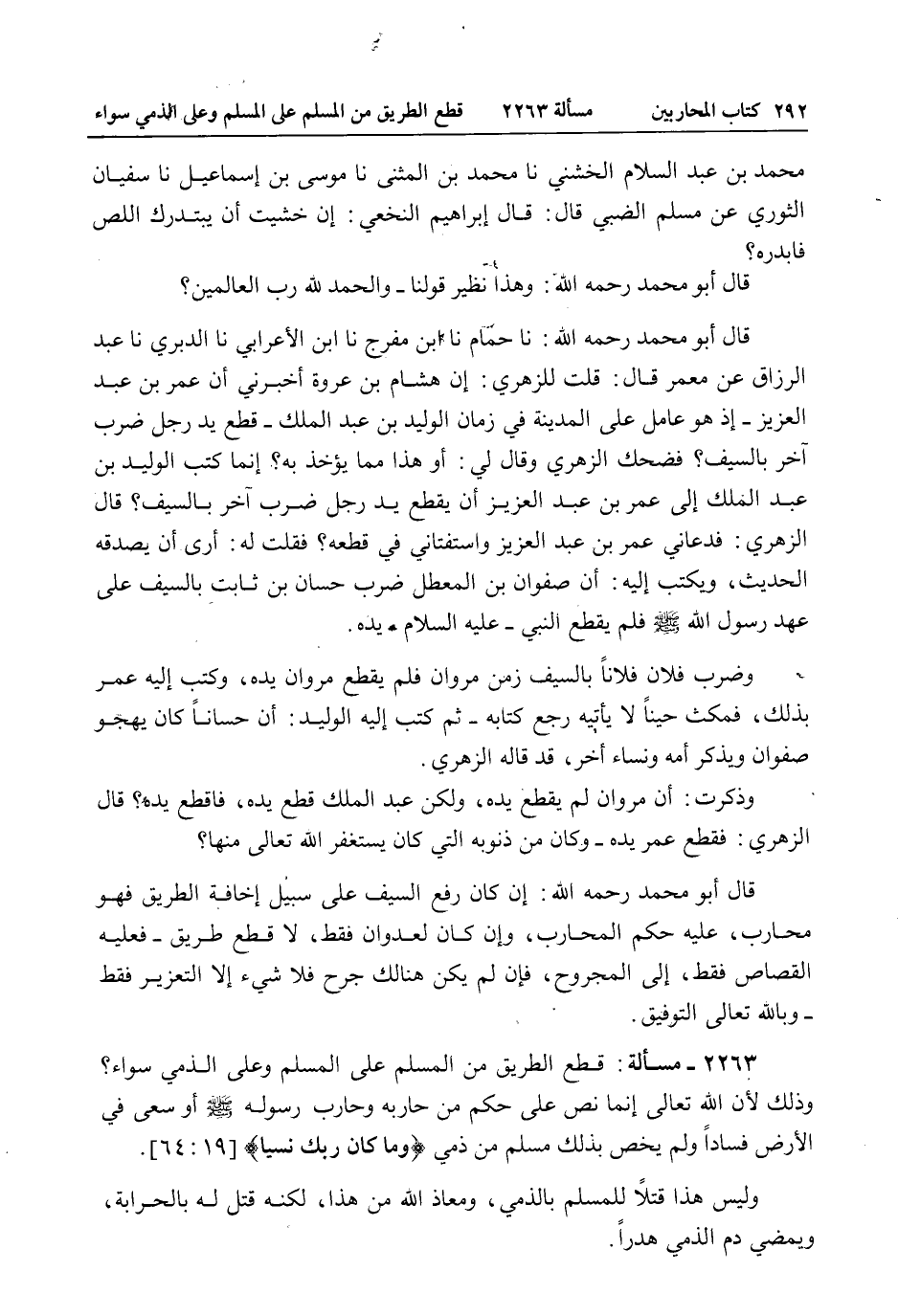 مُحَمَّدُ بْنُ عَبْدِ السَّلَامِ الْخُشَنِيُّ نا مُحَمَّدُ بْنُ الْمُثَنَّى نا مُوسَى بْنُ إسْمَاعِيلَ نا سُفْيَانُ الثَّوْرِيُّ عَنْ مُسْلِمٍ الضَّبِّيُّ قَالَ: قَالَ إبْرَاهِيمُ النَّخَعِيُّ: إنْ خَشِيتَ أَنْ يَبْتَدِرَك اللِّصُّ فَابْدُرْهُ؟ قَالَ أَبُو مُحَمَّدٍ - رَحِمَهُ اللَّهُ -: وَهَذَا نَظِيرُ قَوْلُنَا - وَالْحَمْدُ لِلَّهِ رَبِّ الْعَالَمِينَ؟ قَالَ أَبُو مُحَمَّدٍ - رَحِمَهُ اللَّهُ -: نا حُمَامٌ نا ابْنُ مُفَرِّجٍ نا ابْنُ الْأَعْرَابِيِّ نا الدَّبَرِيُّ نا عَبْدُ الرَّزَّاقِ عَنْ مَعْمَرٍ قَالَ: قُلْت لِلزُّهْرِيِّ: إنَّ هِشَامَ بْنَ عُرْوَةَ أَخْبَرَنِي أَنَّ عُمَرَ بْنَ عَبْدِ الْعَزِيزِ - إذْ هُوَ عَامِلٌ عَلَى الْمَدِينَةِ فِي زَمَانِ الْوَلِيدِ بْنِ عَبْدِ الْمَلِكِ - قَطَعَ يَدَ رَجُلٍ ضَرَبَ آخَرَ بِالسَّيْفِ؟ فَضَحِكَ الزُّهْرِيُّ وَقَالَ لِي: أَوَ هَذَا مِمَّا يُؤْخَذُ بِهِ؟ إنَّمَا كَتَبَ الْوَلِيدُ بْنُ عَبْدِ الْمَلِكِ إلَى عُمَرَ بْنِ عَبْدِ الْعَزِيزِ أَنْ يَقْطَعَ يَدَ رَجُلٍ ضَرَبَ آخَرَ بِالسَّيْفِ؟ قَالَ الزُّهْرِيُّ: فَدَعَانِي عُمَرُ بْنُ عَبْدِ الْعَزِيزِ وَاسْتَفْتَانِي فِي قَطْعِهِ؟ فَقُلْت لَهُ: أَرَى أَنْ يَصْدُقَهُ الْحَدِيثَ، وَيُكْتَبَ إلَيْهِ: «أَنَّ صَفْوَانَ بْنَ الْمُعَطَّلِ ضَرَبَ حَسَّانَ بْنَ ثَابِتٍ بِالسَّيْفِ عَلَى عَهْدِ رَسُولِ اللَّهِ - صَلَّى اللَّهُ عَلَيْهِ وَسَلَّمَ - فَلَمْ يَقْطَعْ النَّبِيُّ - عَلَيْهِ السَّلَامُ - يَدَهُ» وَضَرَبَ فُلَانٌ فُلَانًا بِالسَّيْفِ زَمَنَ مَرْوَانَ فَلَمْ يَقْطَعْ مَرْوَانُ يَدَهُ، وَكَتَبَ إلَيْهِ عُمَرُ بِذَلِكَ، فَمَكَثَ حِينًا لَا يَأْتِيهِ رَجَعَ كِتَابُهُ - ثُمَّ كَتَبَ إلَيْهِ الْوَلِيدُ: أَنَّ حَسَّانًا كَانَ يَهْجُو صَفْوَانَ وَيَذْكُرُ أُمَّهُ وَنِسَاءَ أُخَرَ، قَدْ قَالَهُ الزُّهْرِيُّ. وَذَكَرْت: أَنَّ مَرْوَانَ لَمْ يَقْطَعْ يَدَهُ، وَلَكِنَّ عَبْدَ الْمَلِكِ قَطَعَ يَدَهُ، فَاقْطَعْ يَدَهُ؟ قَالَ الزُّهْرِيُّ: فَقَطَعَ عُمَرُ يَدَهُ - وَكَانَ مِنْ ذُنُوبِهِ الَّتِي كَانَ يَسْتَغْفِرُ اللَّهَ تَعَالَى مِنْهَا؟ قَالَ أَبُو مُحَمَّدٍ - رَحِمَهُ اللَّهُ -: إنْ كَانَ رَفَعَ السَّيْفَ عَلَى سَبِيلِ إخَافَةِ الطَّرِيقِ فَهُوَ مُحَارِبٌ، عَلَيْهِ حُكْمُ الْمُحَارِبِ، وَإِنْ كَانَ لِعُدْوَانٍ فَقَطْ، لَا قَطْعِ طَرِيقٍ - فَعَلَيْهِ الْقِصَاصُ فَقَطْ، إلَى الْمَجْرُوحِ، فَإِنْ لَمْ يَكُنْ هُنَالِكَ جُرْحٌ فَلَا شَيْءَ إلَّا التَّعْزِيرَ فَقَطْ - وَبِاَللَّهِ تَعَالَى التَّوْفِيقُ