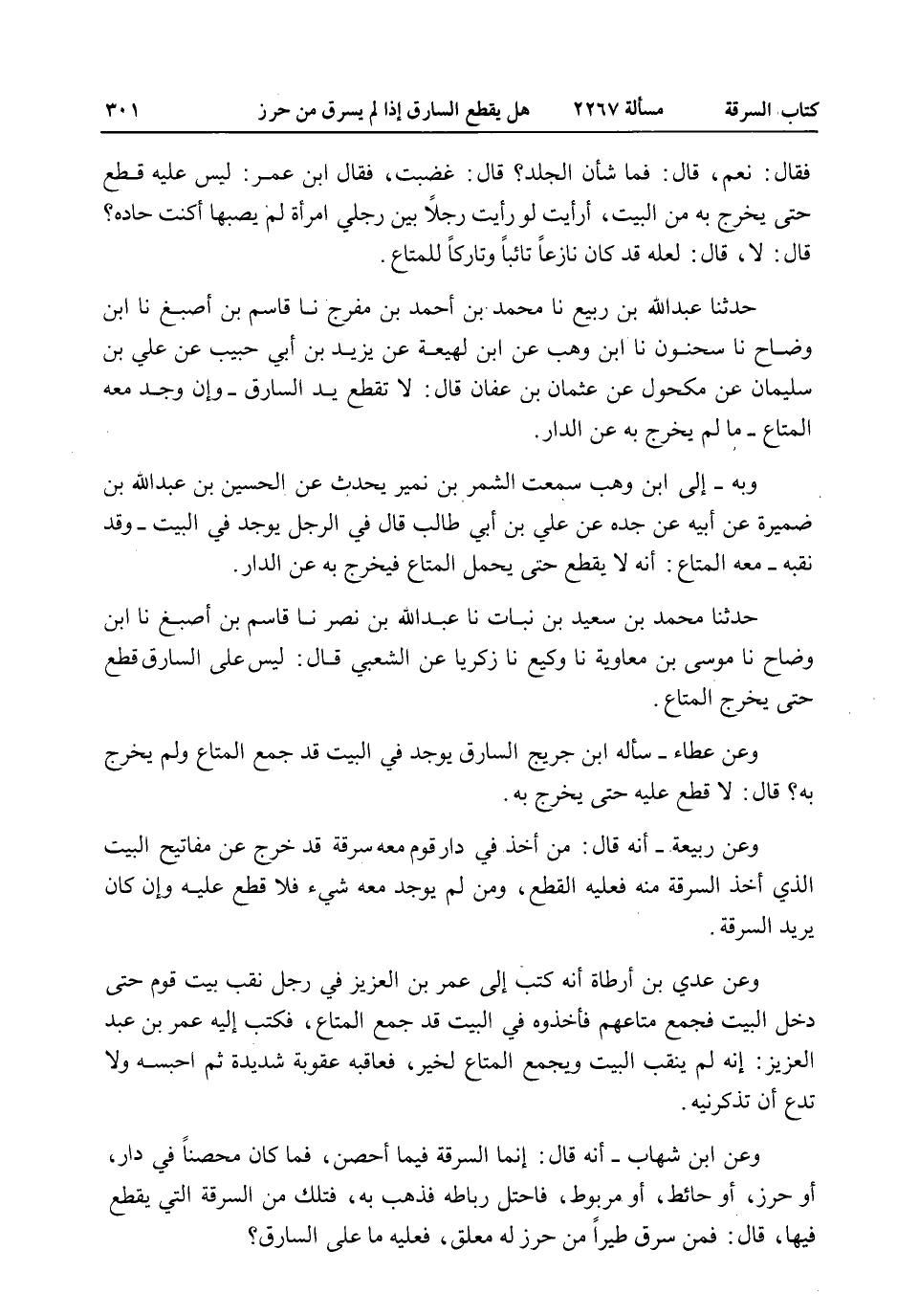 حَدَّثَنَا مُحَمَّدُ بْنُ سَعِيدِ بْنِ نَبَاتٍ نا عَبْدُ اللَّهِ بْنُ نَصْرٍ نا قَاسِمُ بْنُ أَصْبَغَ نا ابْنُ وَضَّاحٍ نا مُوسَى بْنُ مُعَاوِيَةَ نا وَكِيعٌ نا زَكَرِيَّا عَنْ الشَّعْبِيِّ قَالَ: لَيْسَ عَلَى السَّارِقِ قَطْعٌ حَتَّى يُخْرِجَ الْمَتَاعَ.