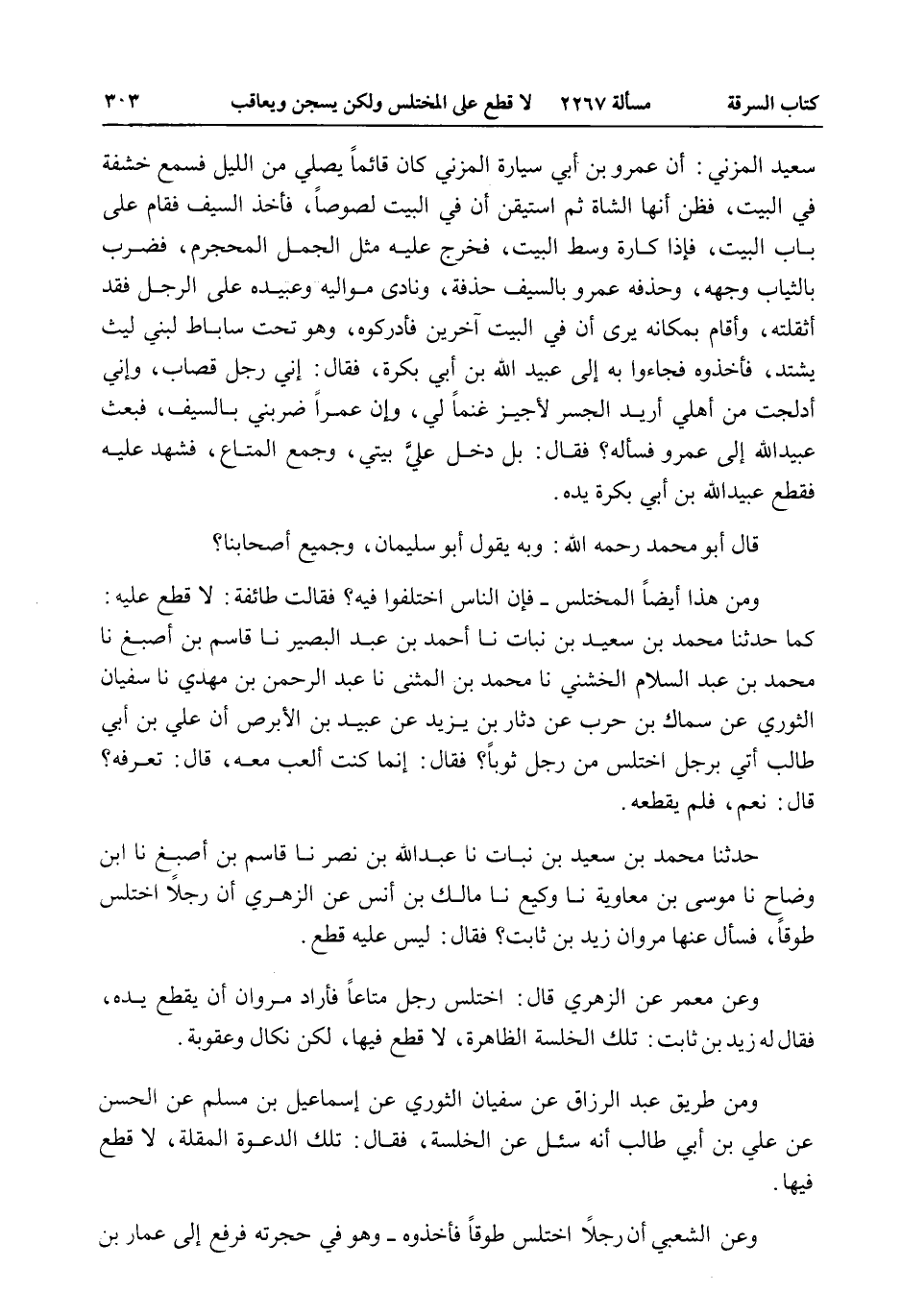 أَنَّ عَمْرَو بْنَ أَبِي سَيَّارَةَ الْمُزَنِيّ كَانَ قَائِمًا يُصَلِّي مِنْ اللَّيْلِ فَسَمِعَ خَشَفَةً فِي الْبَيْتِ، فَظَنَّ أَنَّهَا الشَّاةُ ثُمَّ اسْتَيْقَنَ أَنَّ فِي الْبَيْتِ لُصُوصًا، فَأَخَذَ السَّيْفَ فَقَامَ عَلَى بَابِ الْبَيْتِ، فَإِذَا كَارَّةٌ وَسَطَ الْبَيْتِ، فَخَرَجَ عَلَيْهِ مِثْلُ الْجَمَلِ الْمُحَجْرِمِ، فَضَرَبَ بِالثِّيَابِ وَجْهَهُ، وَحَذَفَهُ عَمْرٌو بِالسَّيْفِ حَذْفَةً، وَنَادَى مَوَالِيَهُ وَعَبِيدَهُ عَلَى الرَّجُلِ فَقَدْ أَثْقَلْتُهُ، وَأَقَامَ بِمَكَانِهِ يَرَى أَنَّ فِي الْبَيْتِ آخَرِينَ فَأَدْرَكُوهُ، وَهُوَ تَحْتَ سَابَاطٍ لِبَنِي لَيْثٍ يَشْتَدُّ، فَأَخَذُوهُ فَجَاءُوا بِهِ إلَى عُبَيْدِ اللَّهِ بْنِ أَبِي بَكْرَةَ، فَقَالَ: إنِّي رَجُلٌ قَصَّابٌ، وَإِنِّي أَدْلَجْت مِنْ أَهْلِي أُرِيدُ الْجِسْرَ لِأُجِيزَ غَنَمًا لِي، وَإِنَّ عَمْرًا ضَرَبَنِي بِالسَّيْفِ، فَبَعَثَ عُبَيْدُ اللَّهِ إلَى عَمْرٍو فَسَأَلَهُ؟ فَقَالَ: بَلْ دَخَلَ عَلَيَّ بَيْتِي، وَجَمَعَ الْمَتَاعَ، فَشُهِدَ عَلَيْهِ فَقَطَعَ عُبَيْدُ اللَّهِ بْنُ أَبِي بَكْرَةَ يَدَهُ. قَالَ أَبُو مُحَمَّدٍ - رَحِمَهُ اللَّهُ -: وَبِهِ يَقُولُ أَبُو سُلَيْمَانَ، وَجَمِيعُ أَصْحَابِنَا؟ وَمِنْ هَذَا أَيْضًا الْمُخْتَلِسُ - فَإِنَّ النَّاسَ اخْتَلَفُوا فِيهِ؟ فَقَالَتْ طَائِفَةٌ: لَا قَطْعَ عَلَيْهِ: كَمَا حَدَّثَنَا مُحَمَّدُ بْنُ سَعِيدِ بْنِ نَبَاتٍ نا أَحْمَدُ بْنُ عَبْدِ الْبَصِيرِ نا قَاسِمُ بْنُ أَصْبَغَ نا مُحَمَّدُ بْنُ عَبْدِ السَّلَامِ الْخُشَنِيُّ نا مُحَمَّدُ بْنُ الْمُثَنَّى نا عَبْدُ الرَّحْمَنِ بْنُ مَهْدِيٍّ نا سُفْيَانُ الثَّوْرِيُّ عَنْ سِمَاكِ بْنِ حَرْبٍ عَنْ دِثَارِ بْنِ يَزِيدَ عَنْ عُبَيْدِ بْنِ الْأَبْرَصِ أَنْ عَلِيَّ بْنَ أَبِي طَالِبٍ أُتِيَ بِرَجُلٍ اخْتَلَسَ مِنْ رَجُلٍ ثَوْبًا؟ فَقَالَ: إنَّمَا كُنْت أَلْعَبُ مَعَهُ، قَالَ: تَعْرِفُهُ؟ قَالَ: نَعَمْ، فَلَمْ يَقْطَعْهُ.