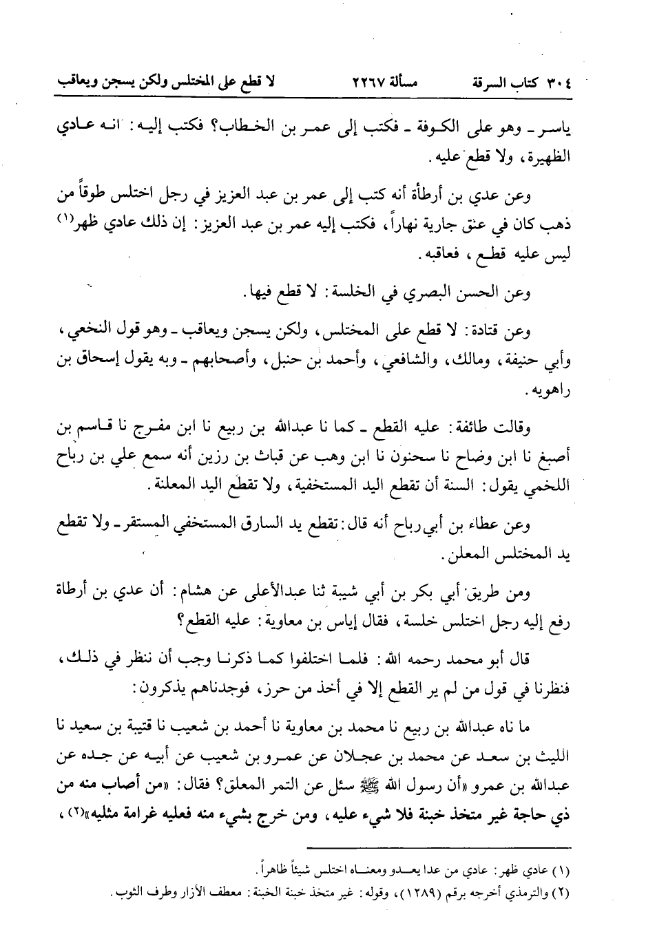 وَعَنْ عَطَاءِ بْنِ أَبِي رَبَاحٍ أَنَّهُ قَالَ: تُقْطَعُ يَدُ السَّارِقِ الْمُسْتَخْفِي الْمُسْتَقِرِّ - وَلَا تُقْطَعُ يَدُ الْمُخْتَلِسِ الْمُعْلِنِ. وَمِنْ طَرِيقِ أَبِي بَكْرِ بْنِ أَبِي شَيْبَةَ ثنا عَبْدُ الْأَعْلَى عَنْ هِشَامٍ: أَنَّ عَدِيَّ بْنَ أَرْطَاةَ رُفِعَ إلَيْهِ رَجُلٌ اخْتَلَسَ خِلْسَةً، فَقَالَ إيَاسُ بْنُ مُعَاوِيَةَ: عَلَيْهِ الْقَطْعُ؟ قَالَ أَبُو مُحَمَّدٍ - رَحِمَهُ اللَّهُ -: فَلَمَّا اخْتَلَفُوا كَمَا ذَكَرْنَا وَجَبَ أَنْ نَنْظُرَ فِي ذَلِكَ، فَنَظَرْنَا فِي قَوْلِ مَنْ لَمْ يَرَ الْقَطْعَ إلَّا فِي أَخْذٍ مِنْ حِرْزٍ، فَوَجَدْنَاهُمْ يَذْكُرُونَ: مَا ناه عَبْدُ اللَّهِ بْنُ رَبِيعٍ نا مُحَمَّدُ بْنُ مُعَاوِيَةَ نا أَحْمَدُ بْنُ شُعَيْبٍ نا قُتَيْبَةُ بْنُ سَعِيدٍ نا اللَّيْثُ بْنُ سَعْدٍ عَنْ مُحَمَّدِ بْنِ عَجْلَانَ عَنْ عَمْرِو بْنِ شُعَيْبٍ عَنْ أَبِيهِ عَنْ جَدِّهِ عَنْ عَبْدِ اللَّهِ بْنِ عَمْرٍو «أَنَّ رَسُولَ اللَّهِ - صَلَّى اللَّهُ عَلَيْهِ وَسَلَّمَ - سُئِلَ عَنْ التَّمْرِ الْمُعَلَّقِ؟ فَقَالَ: مَنْ أَصَابَ مِنْهُ مِنْ ذِي حَاجَةٍ غَيْرَ مُتَّخِذٍ خُبْنَةً فَلَا شَيْءَ عَلَيْهِ، وَمَنْ خَرَجَ بِشَيْءٍ مِنْهُ فَعَلَيْهِ غَرَامَةُ مِثْلَيْهِ