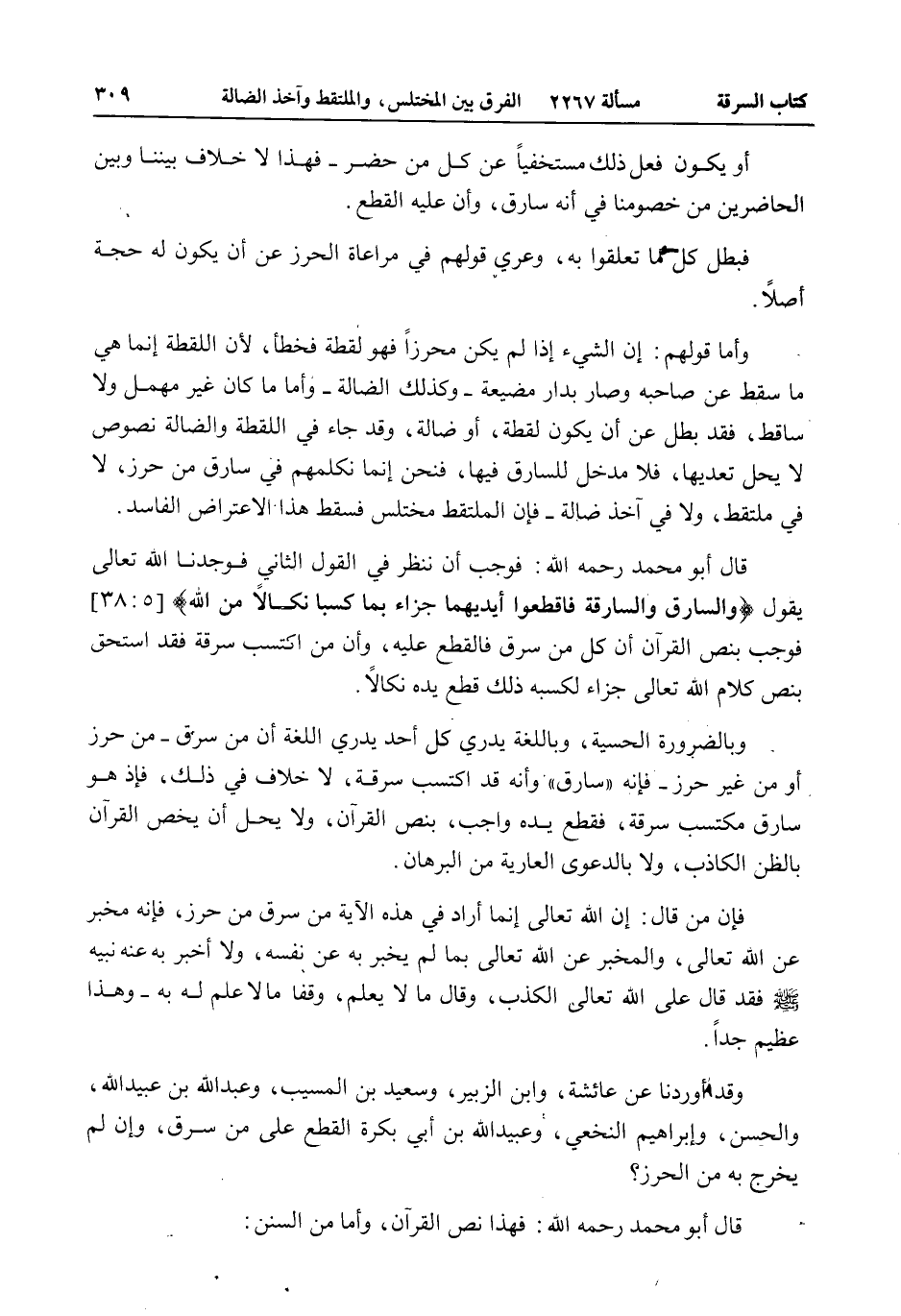 وَأَمَّا قَوْلُهُمْ: إنَّ الشَّيْءَ إذَا لَمْ يَكُنْ مُحْرَزًا فَهُوَ لُقَطَةٌ فَخَطَأٌ؛ لِأَنَّ اللُّقَطَةَ إنَّمَا هِيَ مَا سَقَطَ عَنْ صَاحِبِهِ وَصَارَ بِدَارِ مَضْيَعَةٍ - وَكَذَلِكَ الضَّالَّةُ - وَأَمَّا مَا كَانَ غَيْرَ مُهْمَلٍ وَلَا سَاقِطٍ، فَقَدْ بَطَلَ عَنْ أَنْ يَكُونَ لُقَطَةً، أَوْ ضَالَّةً، وَقَدْ جَاءَ فِي اللُّقَطَةِ وَالضَّالَّةِ نُصُوصٌ لَا يَحِلُّ تَعَدِّيهَا، فَلَا مَدْخَلَ لِلسَّارِقِ فِيهَا، فَنَحْنُ إنَّمَا نُكَلِّمُهُمْ فِي سَارِقٍ مِنْ حِرْزٍ، لَا فِي مُلْتَقَطٍ، وَلَا فِي آخِذِ ضَالَّةٍ - فَإِنَّ الْمُلْتَقِطَ مُخْتَلِسٌ فَسَقَطَ هَذَا الِاعْتِرَاضُ الْفَاسِدُ. قَالَ أَبُو مُحَمَّدٍ - رَحِمَهُ اللَّهُ -: فَوَجَبَ أَنْ نَنْظُرَ فِي الْقَوْلِ الثَّانِي فَوَجَدْنَا اللَّهَ تَعَالَى يَقُولَ {وَالسَّارِقُ وَالسَّارِقَةُ فَاقْطَعُوا أَيْدِيَهُمَا جَزَاءً بِمَا كَسَبَا نَكَالا مِنَ اللَّهِ} [المائدة: 38] فَوَجَبَ بِنَصِّ الْقُرْآنِ أَنَّ كُلَّ مَنْ سَرَقَ فَالْقَطْعُ عَلَيْهِ، وَأَنَّ مَنْ اكْتَسَبَ سَرِقَةً فَقَدْ اسْتَحَقَّ بِنَصِّ كَلَامِ اللَّهِ تَعَالَى جَزَاءً لِكَسْبِهِ ذَلِكَ قَطْعَ يَدِهِ نَكَالًا.