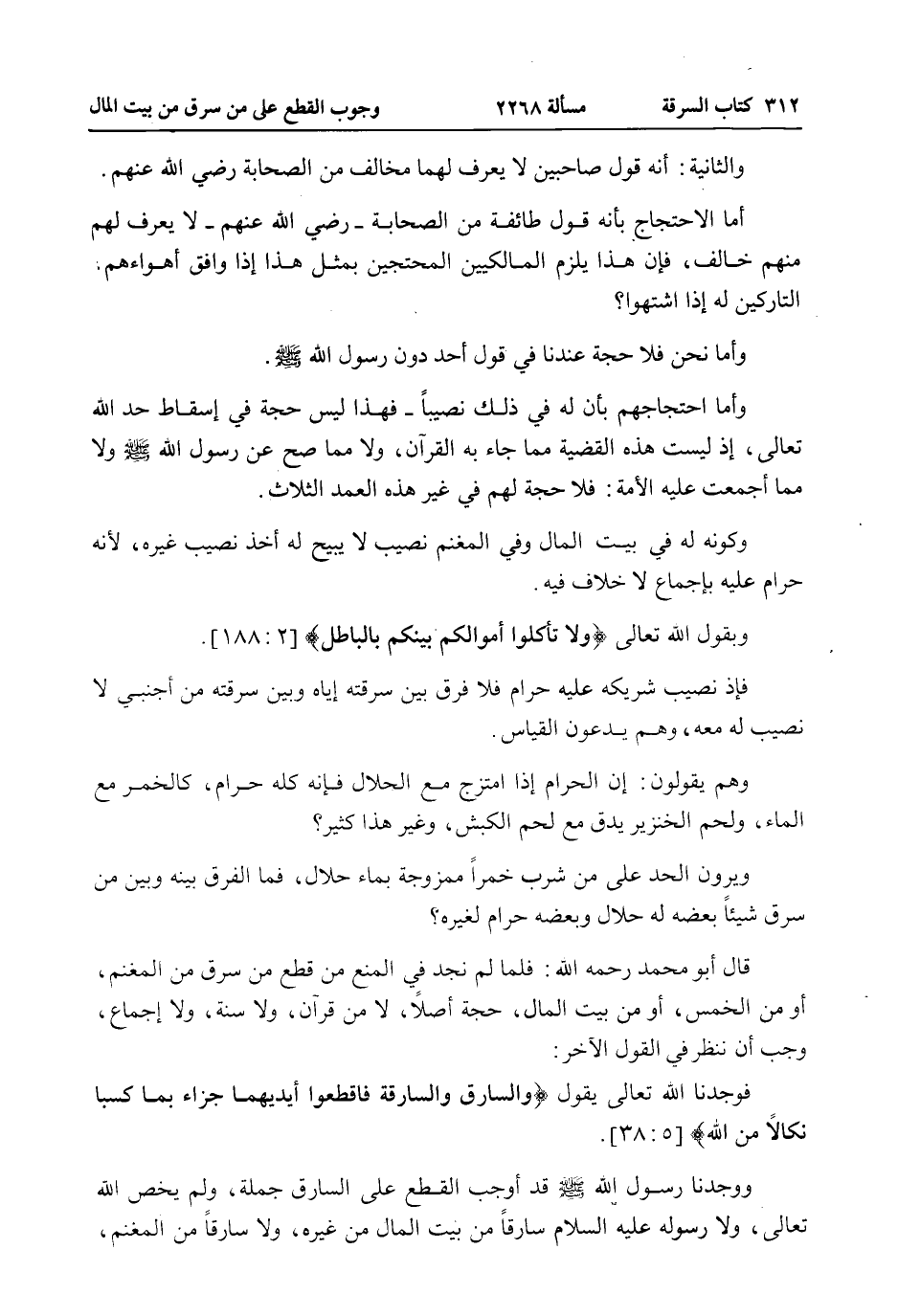 وَوَجَدْنَا رَسُولَ اللَّهِ - صَلَّى اللَّهُ عَلَيْهِ وَسَلَّمَ - قَدْ أَوْجَبَ الْقَطْعَ عَلَى السَّارِقِ جُمْلَةً، وَلَمْ يَخُصَّ اللَّهُ تَعَالَى، وَلَا رَسُولُهُ - عَلَيْهِ السَّلَامُ - سَارِقًا مِنْ بَيْتِ الْمَالِ مِنْ غَيْرِهِ، وَلَا سَارِقًا مِنْ الْمَغْنَمِ،