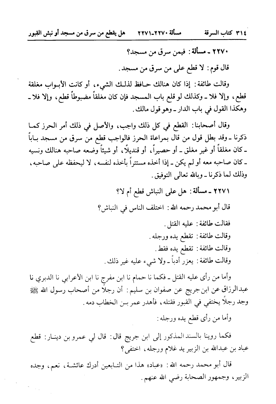2271 - مَسْأَلَةٌ: هَلْ عَلَى النَّبَّاشِ قَطْعٌ أَمْ لَا؟ قَالَ أَبُو مُحَمَّدٍ - رَحِمَهُ اللَّهُ -: اخْتَلَفَ النَّاسُ فِي النَّبَّاشِ؟ فَقَالَتْ طَائِفَةٌ: عَلَيْهِ الْقَتْلُ. وَقَالَتْ طَائِفَةٌ: تُقْطَعُ يَدُهُ وَرِجْلُهُ.