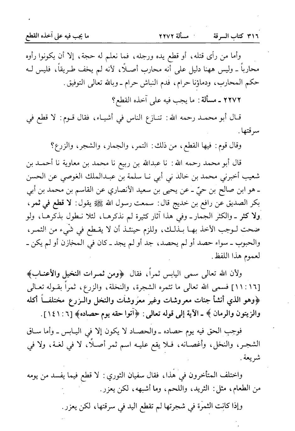 2272 - مَسْأَلَةٌ: مَا يَجِبُ فِيهِ عَلَى آخِذِهِ الْقَطْعُ؟ قَالَ أَبُو مُحَمَّدٍ - رَحِمَهُ اللَّهُ -: تَنَازَعَ النَّاسُ فِي أَشْيَاءَ، فَقَالَ قَوْمٌ: لَا قَطْعَ فِي سَرِقَتِهَا.