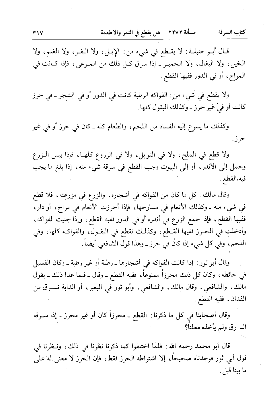 وَقَالَ مَالِكٌ: كُلُّ مَا كَانَ مِنْ الْفَوَاكِهِ فِي أَشْجَارِهِ، وَالزَّرْعِ فِي مَزْرَعَتِهِ، فَلَا قَطَعَ فِي شَيْءٍ مِنْهُ - وَكَذَلِكَ الْأَنْعَامُ فِي مَسَارِحِهَا، فَإِذَا أُحْرِزَتْ الْأَنْعَامُ فِي مِرَاحٍ، أَوْ دَارٍ، فَفِيهَا الْقَطْعُ، فَإِذَا جُمِعَ الزَّرْعُ فِي أَنْدَرِهِ أَوْ فِي الدُّورِ فَفِيهِ الْقَطْعُ، وَإِذَا جُنِيَتْ الْفَوَاكِهُ، وَأُدْخِلَتْ فِي الْحِرْزِ فَفِيهَا الْقَطْعُ، وَكَذَلِكَ تُقْطَعُ فِي الْبُقُولِ، وَالْفَوَاكِهِ كُلِّهَا، وَفِي اللَّحْمِ وَفِي كُلِّ شَيْءٍ إذَا كَانَ فِي حِرْزٍ - وَهَذَا قَوْلُ الشَّافِعِيِّ أَيْضًا. وَقَالَ أَبُو ثَوْرٍ: إذَا كَانَتْ الْفَوَاكِهُ فِي أَشْجَارِهَا - رَطْبَةً أَوْ غَيْرَ رَطْبَةٍ - وَكَانَ الْفَسِيلُ فِي حَائِطِهِ، وَكَانَ كُلُّ ذَلِكَ مُحْرَزًا مَمْنُوعًا، فَفِيهِ الْقَطْعُ - وَقَالَ - فِيمَا عَدَا ذَلِكَ - بِقَوْلِ مَالِكٍ، وَالشَّافِعِيِّ، وَقَالَ مَالِكٌ، وَالشَّافِعِيُّ وَأَبُو ثَوْرٍ فِي الْبَعِيرِ، أَوْ الدَّابَّةِ تُسْرَقُ مِنْ الْفَدَّانِ، فَفِيهِ الْقَطْعُ. وَقَالَ أَصْحَابُنَا فِي كُلِّ مَا ذَكَرْنَا: الْقَطْعُ - مُحْرَزًا كَانَ أَوْ غَيْرِ مُحْرَزٍ - إذَا سَرَقَهُ السَّارِقُ وَلَمْ يَأْخُذْهُ مُعْلِنًا؟ قَالَ أَبُو مُحَمَّدٍ - رَحِمَهُ اللَّهُ -: فَلَمَّا اخْتَلَفُوا كَمَا ذَكَرْنَا نَظَرْنَا فِي ذَلِكَ، وَنَظَرْنَا فِي قَوْلِ أَبِي ثَوْرٍ فَوَجَدْنَاهُ صَحِيحًا، إلَّا اشْتِرَاطَهُ الْحِرْزَ فَقَطْ، فَإِنَّ الْحِرْزَ لَا مَعْنَى لَهُ عَلَى مَا بَيَّنَّا قَبْلُ.