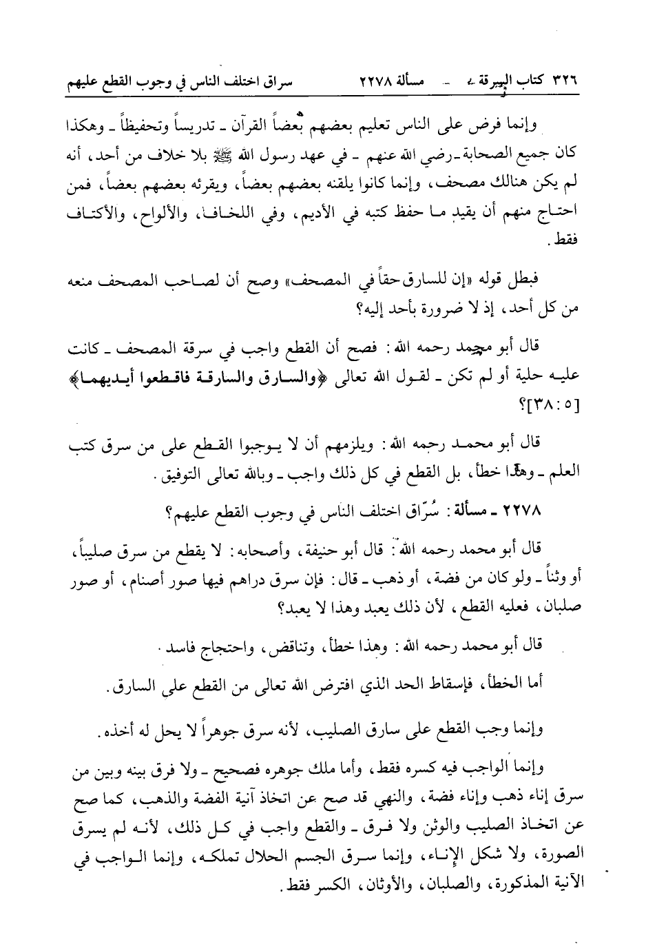 2278 - مَسْأَلَةٌ: سُرَّاقٌ اخْتَلَفَ النَّاسُ فِي وُجُوبِ الْقَطْعِ عَلَيْهِمْ؟ قَالَ أَبُو مُحَمَّدٍ - رَحِمَهُ اللَّهُ -: قَالَ أَبُو حَنِيفَةَ، وَأَصْحَابُهُ: لَا يُقْطَعُ مَنْ سَرَقَ صَلِيبًا، أَوْ وَثَنًا - وَلَوْ كَانَ مَنْ فِضَّةٍ، أَوْ ذَهَبٍ - قَالَ: فَإِنْ سَرَقَ دَرَاهِمَ فِيهَا صُوَرُ أَصْنَامٍ، أَوْ صُوَرُ صُلْبَانٍ، فَعَلَيْهِ الْقَطْعُ؛ لِأَنَّ ذَلِكَ يُعْبَدُ وَهَذَا لَا يُعْبَدُ؟ قَالَ أَبُو مُحَمَّدٍ - رَحِمَهُ اللَّهُ -: وَهَذَا خَطَأٌ، وَتَنَاقُضٌ، وَاحْتِجَاجٌ فَاسِدٌ.