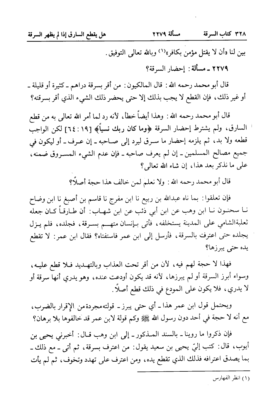 2279 - مَسْأَلَةٌ: إحْضَارُ السَّرِقَةِ؟ قَالَ أَبُو مُحَمَّدٍ - رَحِمَهُ اللَّهُ -: قَالَ الْمَالِكِيُّونَ: مَنْ أَقَرَّ بِسَرِقَةِ دَرَاهِمَ - كَثِيرَةٍ أَوْ قَلِيلَةٍ - أَوْ غَيْرِ ذَلِكَ، فَإِنَّ الْقَطْعَ لَا يَجِبُ بِذَلِكَ إلَّا حَتَّى يُحْضِرَ ذَلِكَ الشَّيْءَ الَّذِي أَقَرَّ بِسَرِقَتِهِ؟ قَالَ أَبُو مُحَمَّدٍ - رَحِمَهُ اللَّهُ -: وَهَذَا أَيْضًا خَطَأٌ؛ لِأَنَّهُ رَدٌّ لِمَا أَمَرَ اللَّهُ تَعَالَى بِهِ مِنْ قَطْعِ السَّارِقِ، وَلَمْ يَشْتَرِطْ إحْضَارَ السَّرِقَةِ {وَمَا كَانَ رَبُّكَ نَسِيًّا} [مريم: 64] لَكِنَّ الْوَاجِبَ قَطْعُهُ وَلَا بُدَّ، ثُمَّ يَلْزَمُهُ إحْضَارُ مَا سَرَقَ لِيَرُدَّ إلَى صَاحِبِهِ - إنْ عُرِفَ - أَوْ لِيَكُونَ فِي جَمِيعِ مَصَالِحِ الْمُسْلِمِينَ - إنْ لَمْ يَعْرِفْ صَاحِبَهُ - فَإِنْ عَدِمَ الشَّيْءَ الْمَسْرُوقَ ضَمِنَهُ، عَلَى مَا نَذْكُرُ بَعْدَ هَذَا، إنْ شَاءَ اللَّهُ تَعَالَى؟ قَالَ أَبُو مُحَمَّدٍ - رَحِمَهُ اللَّهُ -: وَلَا نَعْلَمُ لِمَنْ خَالَفَ هَذَا حُجَّةً أَصْلًا؟ فَإِنْ تَعَلَّقُوا: بِمَا ناه عَبْدُ اللَّهِ بْنُ رَبِيعٍ نا ابْنُ مُفَرِّجٍ نا قَاسِمُ بْنُ أَصْبَغَ نا ابْنُ وَضَّاحٍ نا سَحْنُونٌ نا ابْنُ وَهْبٍ عَنْ ابْنِ أَبِي ذِئْبٍ عَنْ ابْنِ شِهَابٍ: أَنَّ طَارِقًا كَانَ جَعَلَهُ ثَعْلَبَةُ الشَّامِيُّ عَلَى الْمَدِينَةِ يَسْتَخْلِفُهُ، فَأُتِيَ بِإِنْسَانٍ مُتَّهَمٍ بِسَرِقَةٍ، فَجَلَدَهُ، فَلَمْ يَزَلْ يَجْلِدُهُ حَتَّى اعْتَرَفَ بِالسَّرِقَةِ، فَأَرْسَلَ إلَى ابْنِ عُمَرَ فَاسْتَفْتَاهُ؟ فَقَالَ ابْنُ عُمَرَ لَا تُقْطَعْ - يَدُهُ حَتَّى يُبْرِزَهَا؟ فَهَذَا لَا حُجَّةَ لَهُمْ فِيهِ؛ لِأَنَّ مَنْ أَقَرَّ تَحْتَ الْعَذَابِ وَبِالتَّهْدِيدِ فَلَا قَطَعَ عَلَيْهِ، وَسَوَاءٌ أَبْرَزَ السَّرِقَةَ أَوْ لَمْ يُبْرِزْهَا؛ لِأَنَّهُ قَدْ يَكُونُ أُودِعَتْ عِنْدَهُ، وَهُوَ يَدْرِي أَنَّهَا سَرِقَةٌ أَوْ لَا يَدْرِي، فَلَا يَكُونُ عَلَى الْمُودَعِ فِي ذَلِكَ قَطْعٌ أَصْلًا. وَيَحْتَمِلُ قَوْلُ ابْنِ عُمَرَ هَذَا - أَيْ حَتَّى يُبْرِزَ - قَوْلَتَهُ مُجَرَّدَةً مِنْ الْإِقْرَارِ بِالضَّرْبِ، مَعَ أَنَّهُ لَا حُجَّةَ فِي أَحَدٍ دُونَ رَسُولِ اللَّهِ - صَلَّى اللَّهُ عَلَيْهِ وَسَلَّمَ - وَكَمْ قَوْلَةٌ لِابْنِ عُمَرَ قَدْ خَالَفُوهَا بِلَا بُرْهَانٍ فَإِنْ ذَكَرُوا مَا رُوِّينَا - بِالسَّنَدِ الْمَذْكُورِ - إلَى ابْنِ وَهْبٍ قَالَ: أَخْبَرَنِي يَحْيَى بْنُ أَيُّوبَ، قَالَ: كَتَبَ إلَيَّ يَحْيَى بْنِ سَعِيدٍ يَقُولُ: مَنْ اعْتَرَفَ بِسَرِقَةٍ، ثُمَّ أَتَى - مَعَ ذَلِكَ - بِمَا يُصَدِّقُ اعْتِرَافَهُ فَذَلِكَ الَّذِي تُقْطَعُ يَدُهُ، وَمَنْ اعْتَرَفَ عَلَى تَهَدُّدٍ وَتَخَوُّفٍ، ثُمَّ لَمْ يَأْتِ