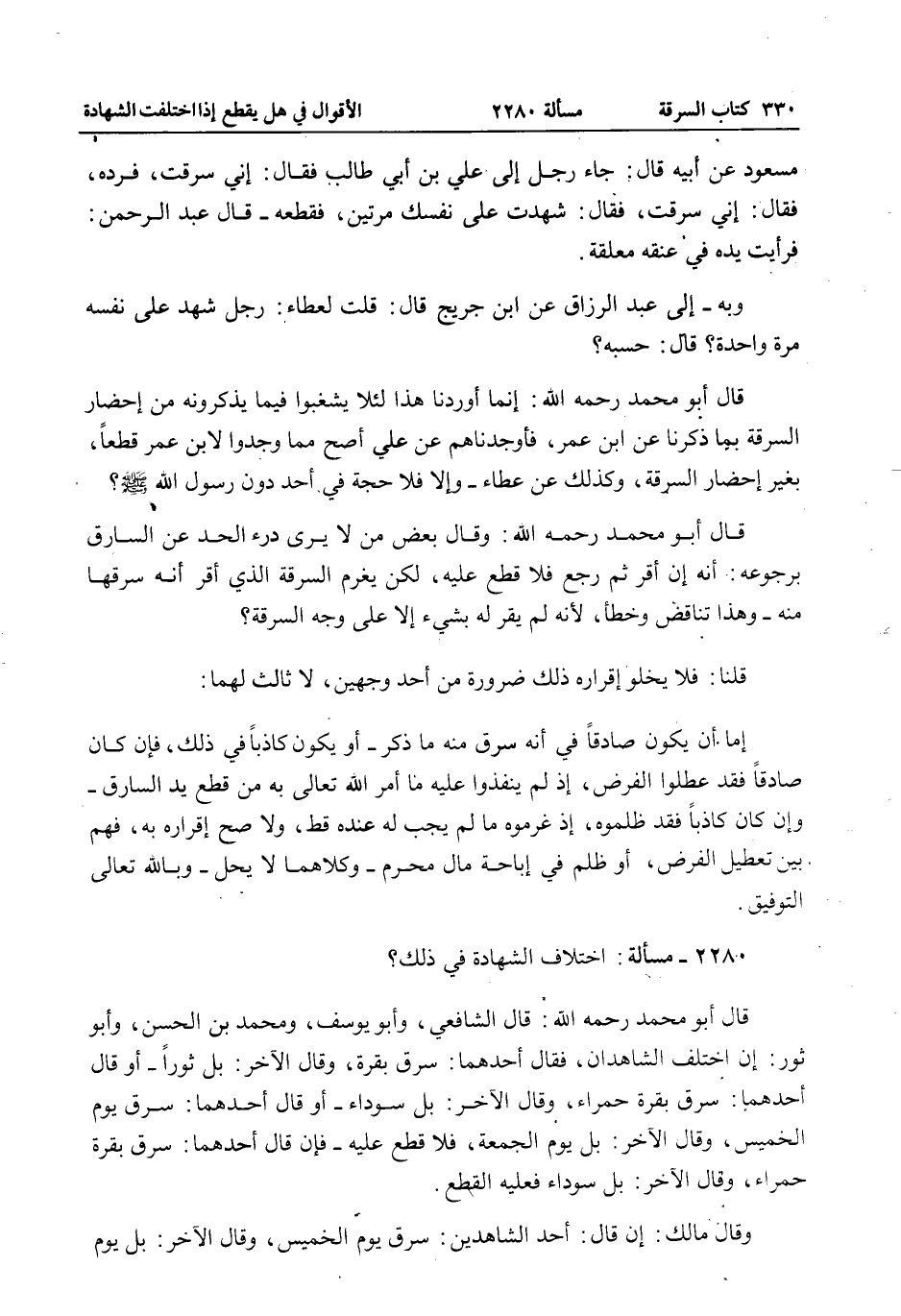 2280 - مَسْأَلَةٌ: اخْتِلَافُ الشَّهَادَةِ فِي ذَلِكَ؟ قَالَ أَبُو مُحَمَّدٍ - رَحِمَهُ اللَّهُ -: قَالَ الشَّافِعِيُّ، وَأَبُو يُوسُفَ، وَمُحَمَّدُ بْنُ الْحَسَنِ، وَأَبُو ثَوْرٍ: إنْ اخْتَلَفَ الشَّاهِدَانِ، فَقَالَ أَحَدُهُمَا: سَرَقَ بَقَرَةً، وَقَالَ الْآخَرُ: بَلْ ثَوْرًا - أَوْ قَالَ أَحَدُهُمَا: سَرَقَ بَقَرَةً حَمْرَاءَ، وَقَالَ الْآخَرُ: بَلْ سَوْدَاءَ - أَوْ قَالَ أَحَدُهُمَا: سَرَقَ يَوْمَ الْخَمِيسِ، وَقَالَ الْآخَرُ: بَلْ يَوْمَ الْجُمُعَةِ، فَلَا قَطَعَ عَلَيْهِ - فَإِنْ قَالَ أَحَدُهُمَا: سَرَقَ بَقَرَةً حَمْرَاءَ، وَقَالَ الْآخَرُ: بَلْ سَوْدَاءَ فَعَلَيْهِ الْقَطْعُ.