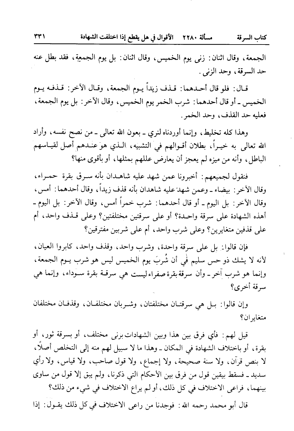 قَالَ: فَلَوْ قَالَ أَحَدُهُمَا: قَذَفَ زَيْدًا يَوْمَ الْجُمُعَةِ، وَقَالَ الْآخَرُ: قَذَفَهُ يَوْمَ الْخَمِيسِ - أَوْ قَالَ أَحَدُهُمَا: شَرِبَ الْخَمْرَ يَوْمَ الْخَمِيسِ، وَقَالَ الْآخَرُ: بَلْ يَوْمَ الْجُمُعَةِ، فَعَلَيْهِ حَدُّ الْقَذْفِ، وَحَدُّ الْخَمْرِ. وَهَذَا كُلُّهُ تَخْلِيطٌ، وَإِنَّمَا أَوْرَدْنَاهُ لِنُرِيَ - بِعَوْنِ اللَّهِ تَعَالَى - مَنْ نَصَحَ نَفْسَهُ، وَأَرَادَ اللَّهُ تَعَالَى بِهِ خَيْرًا، بُطْلَانَ أَقْوَالِهِمْ فِي التَّشْبِيهِ، الَّذِي هُوَ عِنْدَهُمْ أَصْلٌ لِقِيَاسِهِمْ الْبَاطِلِ، وَأَنَّهُ مَنْ مَيَّزَهُ لَمْ يَعْجِزْ أَنْ يُعَارِضَ عِلَلَهُمْ بِمِثْلِهَا، أَوْ بِأَقْوَى مِنْهَا؟ فَنَقُولُ لِجَمِيعِهِمْ: أَخْبِرُونَا عَمَّنْ شَهِدَ عَلَيْهِ شَاهِدَانِ بِأَنَّهُ سَرَقَ بَقَرَةً حَمْرَاءَ، وَقَالَ الْآخَرُ: بَيْضَاءَ - وَعَمَّنْ شَهِدَ عَلَيْهِ شَاهِدَانِ بِأَنَّهُ قَذَفَ زَيْدًا، وَقَالَ أَحَدُهُمَا: أَمْسِ، وَقَالَ الْآخَرُ: بَلْ الْيَوْمَ - أَوْ قَالَ أَحَدُهُمَا: شَرِبَ خَمْرًا أَمْسِ، وَقَالَ الْآخَرُ: بَلْ الْيَوْمَ - أَهَذِهِ الشَّهَادَةُ عَلَى سَرِقَةٍ وَاحِدَةٍ؟ أَوْ عَلَى سَرِقَتَيْنِ مُخْتَلِفَتَيْنِ؟ وَعَلَى قَذْفٍ وَاحِدٍ، أَمْ عَلَى قَذَفَيْنِ مُتَغَايِرَيْنِ؟ وَعَلَى شُرْبٍ وَاحِدٍ، أَمْ عَلَى شُرْبَيْنِ مُفْتَرِقَيْنِ؟ فَإِنْ قَالُوا: بَلْ عَلَى سَرِقَةٍ وَاحِدَةٍ، وَشُرْبٍ وَاحِدٍ، وَقَذْفٍ وَاحِدٍ، كَابَرُوا الْعِيَانَ؛ لِأَنَّهُ لَا يَشُكُّ ذُو حِسٍّ سَلِيمٍ فِي أَنَّ شُرْبَ يَوْمِ الْخَمِيسِ لَيْسَ هُوَ شُرْبَ يَوْمِ الْجُمُعَةِ، وَإِنَّمَا هُوَ شُرْبٌ آخَرُ - وَأَنَّ سَرِقَةَ بَقَرَةٍ صَفْرَاءَ لَيْسَتْ هِيَ سَرِقَةُ بَقَرَةٍ سَوْدَاءَ، وَإِنَّمَا هِيَ سَرِقَةٌ أُخْرَى؟ وَإِنْ قَالُوا: بَلْ هِيَ سَرِقَتَانِ مُخْتَلِفَتَانِ، وَشُرْبَانِ مُخْتَلِفَانِ، وَقَذْفَانِ مُخْتَلِفَانِ مُتَغَايِرَانِ؟ قِيلَ لَهُمْ: فَأَيُّ فَرْقٍ بَيْنَ هَذَا وَبَيْنَ الشَّهَادَاتِ بِزِنًا مُخْتَلِفٍ، أَوْ بِسَرِقَةِ ثَوْرٍ، أَوْ بَقَرَةٍ، أَوْ بِاخْتِلَافِ الشَّهَادَةِ فِي الْمَكَانِ - وَهَذَا مَا لَا سَبِيلَ لَهُمْ مِنْهُ إلَى التَّخَلُّصِ أَصْلًا، لَا بِنَصِّ قُرْآنٍ، وَلَا سُنَّةٍ صَحِيحَةٍ وَلَا إجْمَاعٍ، وَلَا قَوْلِ صَاحِبٍ، وَلَا قِيَاسٍ، وَلَا رَأْيٍ سَدِيدٍ - فَسَقَطَ بِيَقِينٍ قَوْلُ مَنْ فَرَّقَ بَيْنَ الْأَحْكَامِ الَّتِي ذَكَرْنَا، وَلَمْ يَبْقَ إلَّا قَوْلُ مَنْ سَاوَى بَيْنَهُمَا، فَرَاعَى الِاخْتِلَافَ فِي كُلِّ ذَلِكَ، أَوْ لَمْ يُرَاعِ الِاخْتِلَافَ فِي شَيْءٍ مِنْ ذَلِكَ؟ قَالَ أَبُو مُحَمَّدٍ - رَحِمَهُ اللَّهُ -: فَوَجَدْنَا مَنْ رَاعَى الِاخْتِلَافَ فِي كُلِّ ذَلِكَ يَقُولُ: إذَا