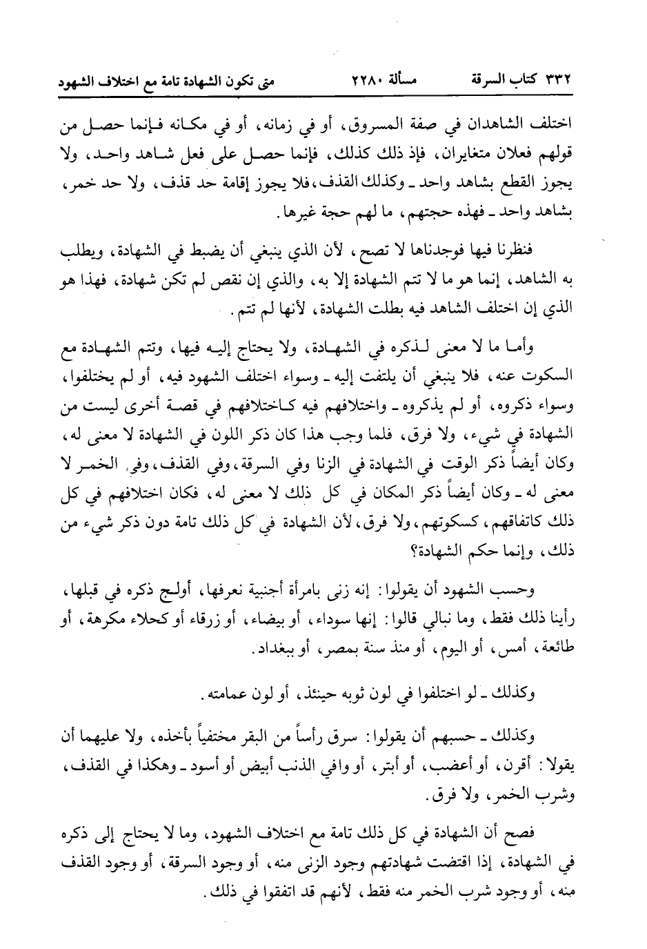 اخْتَلَفَ الشَّاهِدَانِ فِي صِفَةِ الْمَسْرُوقِ، أَوْ فِي زَمَانِهِ، أَوْ فِي مَكَانِهِ فَإِنَّمَا حَصَلَ مِنْ قَوْلِهِمْ فِعْلَانِ مُتَغَايِرَانِ، فَإِذْ ذَلِكَ كَذَلِكَ، فَإِنَّمَا حَصَلَ عَلَى فِعْلِ شَاهِدٍ وَاحِدٍ، وَلَا يَجُوزُ الْقَطْعُ بِشَاهِدٍ وَاحِدٍ - وَكَذَلِكَ الْقَذْفُ، فَلَا يَجُوزُ إقَامَةُ حَدِّ قَذْفٍ، وَلَا حَدِّ خَمْرٍ، بِشَاهِدٍ وَاحِدٍ - فَهَذِهِ حُجَّتُهُمْ، مَا لَهُمْ حُجَّةٌ غَيْرُهَا.
