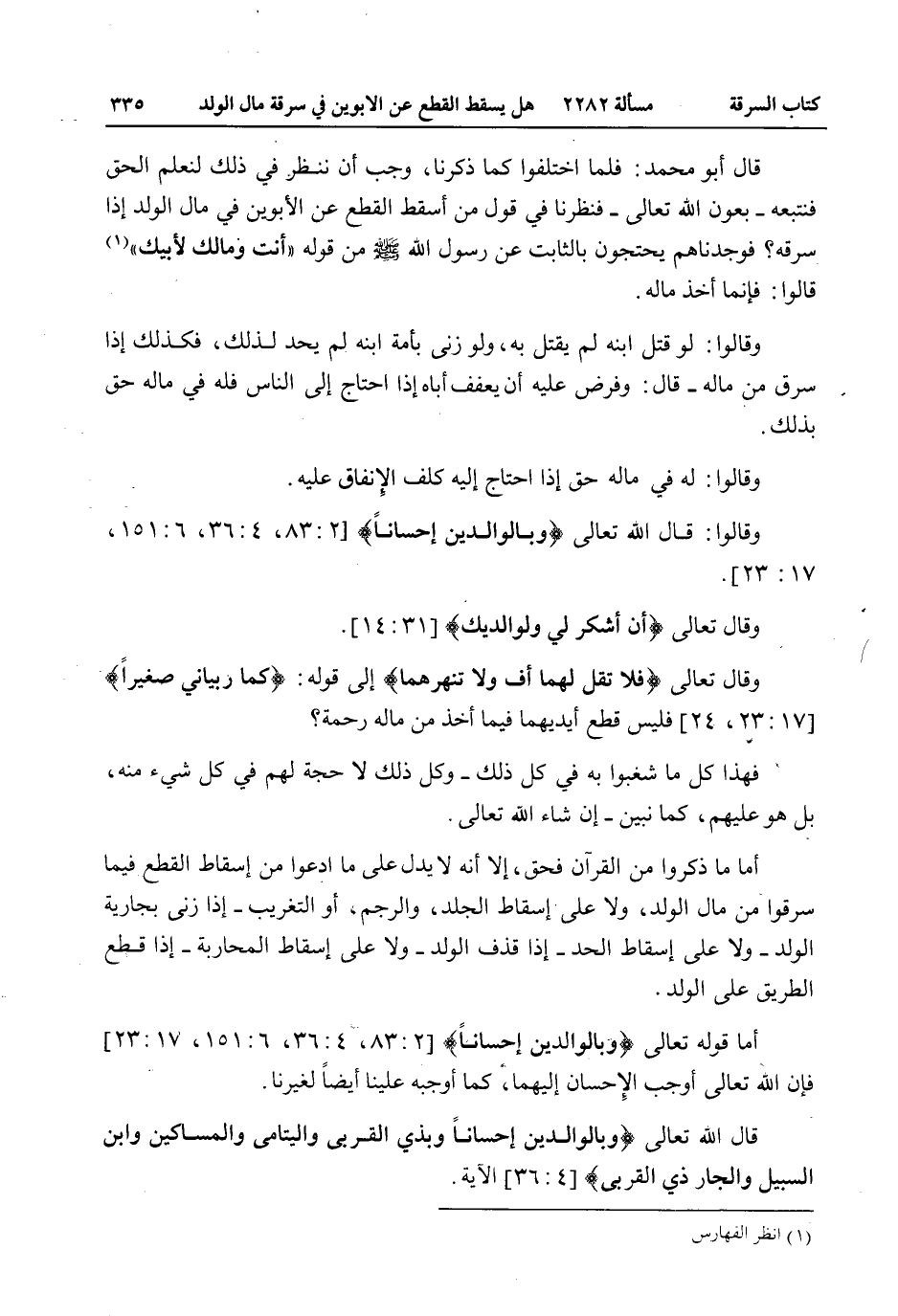 وَقَالَ تَعَالَى {أَنِ اشْكُرْ لِي وَلِوَالِدَيْكَ} [لقمان: 14] . وَقَالَ تَعَالَى {فَلا تَقُلْ لَهُمَا أُفٍّ وَلا تَنْهَرْهُمَا} [الإسراء: 23] إلَى قَوْلِهِ: {كَمَا رَبَّيَانِي صَغِيرًا} [الإسراء: 24] فَلَيْسَ قَطْعُ أَيْدِيهِمَا فِيمَا أُخِذَ مِنْ مَالِهِ رَحْمَةٌ؟ فَهَذَا كُلُّ مَا شَغَبُوا بِهِ فِي كُلِّ ذَلِكَ - وَكُلُّ ذَلِكَ لَا حُجَّةَ لَهُمْ فِي كُلِّ شَيْءٍ مِنْهُ، بَلْ هُوَ عَلَيْهِمْ، كَمَا نُبَيِّنُ - إنْ شَاءَ اللَّهُ تَعَالَى.
