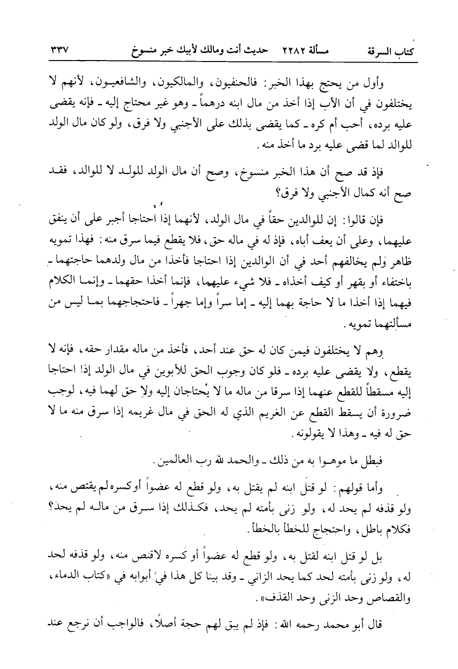 فَإِذْ قَدْ صَحَّ أَنَّ هَذَا الْخَبَرَ مَنْسُوخٌ، وَصَحَّ أَنَّ مَالَ الْوَلَدِ لِلْوَلَدِ لَا لِلْوَالِدِ، فَقَدْ صَحَّ أَنَّهُ كَمَالِ الْأَجْنَبِيِّ وَلَا فَرْقَ؟ فَإِنْ قَالُوا: إنَّ لِلْوَالِدَيْنِ حَقًّا فِي مَالِ الْوَلَدِ؛ لِأَنَّهُمَا إذَا احْتَاجَا أُجْبِرَ عَلَى أَنْ يُنْفِقَ عَلَيْهِمَا، وَعَلَى أَنْ يَعِفَّ أَبَاهُ، فَإِذْ لَهُ فِي مَالِهِ حَقٌّ، فَلَا يُقْطَعُ فِيمَا سَرَقَ مِنْهُ: فَهَذَا تَمْوِيهٌ ظَاهِرٌ وَلَمْ يُخَالِفْهُمْ أَحَدٌ فِي أَنَّ الْوَالِدَيْنِ إذَا احْتَاجَا فَأَخَذَا مِنْ مَالِ وَلَدِهِمَا حَاجَتَهُمَا بِاخْتِفَاءٍ أَوْ بِقَهْرٍ أَوْ كَيْفَ أَخَذَاهُ - فَلَا شَيْءَ عَلَيْهِمَا، فَإِنَّمَا أَخَذَا حَقَّهُمَا - وَإِنَّمَا الْكَلَامُ فِيهِمَا إذَا أَخَذَا مَا لَا حَاجَةَ بِهِمَا إلَيْهِ - إمَّا سِرًّا وَإِمَّا جَهْرًا - فَاحْتِجَاجُهُمَا بِمَا لَيْسَ مِنْ مَسْأَلَتِهِمَا تَمْوِيهٌ.