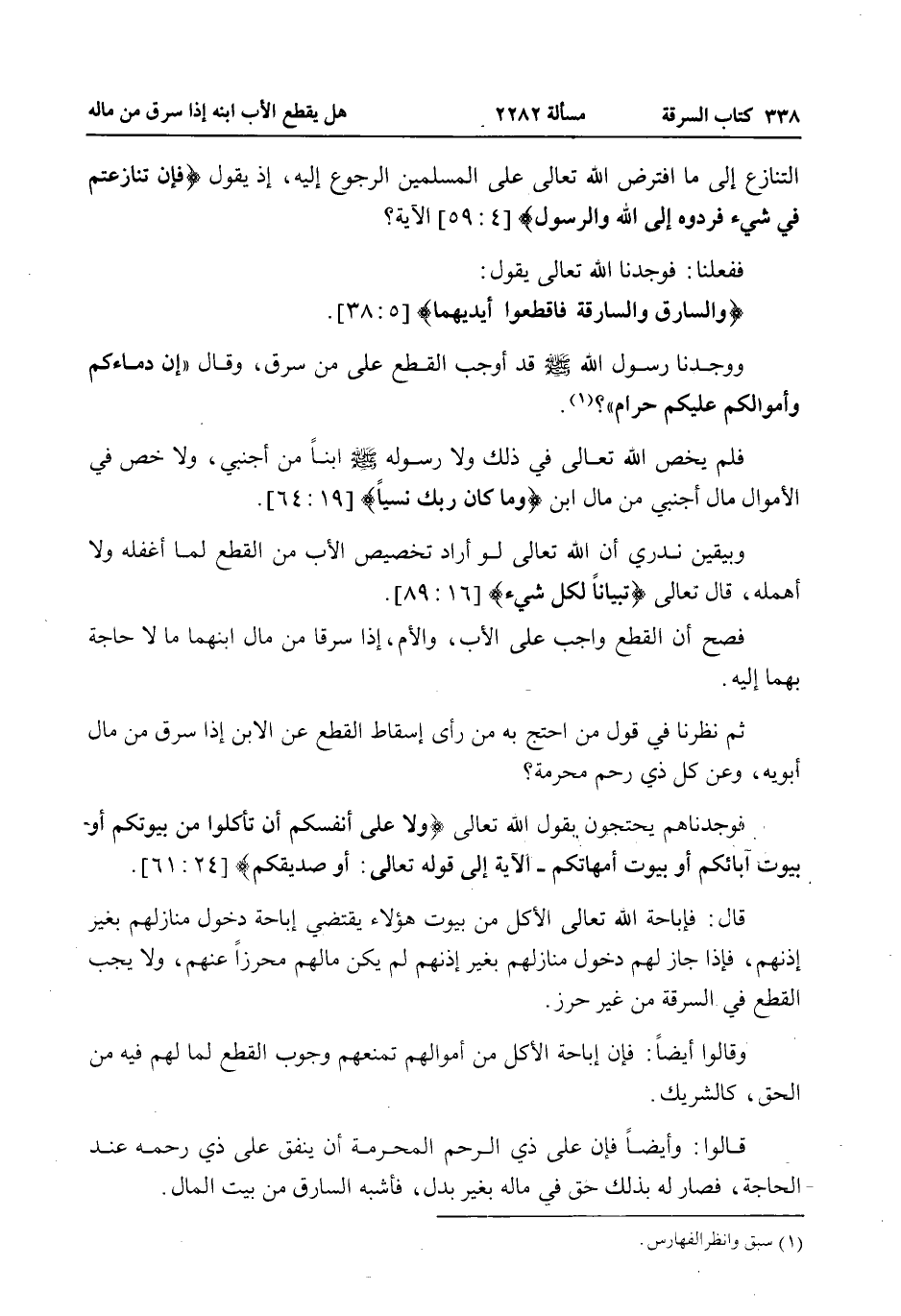 التَّنَازُعُ إلَى مَا افْتَرَضَ اللَّهُ تَعَالَى عَلَى الْمُسْلِمِينَ الرُّجُوعَ إلَيْهِ، إذْ يَقُولُ {فَإِنْ تَنَازَعْتُمْ فِي شَيْءٍ فَرُدُّوهُ إِلَى اللَّهِ وَالرَّسُولِ} [النساء: 59] الْآيَةَ فَفَعَلْنَا: فَوَجَدْنَا اللَّهَ تَعَالَى يَقُولُ: {وَالسَّارِقُ وَالسَّارِقَةُ فَاقْطَعُوا أَيْدِيَهُمَا} [المائدة: 38] . وَوَجَدْنَا رَسُولَ اللَّهِ - صَلَّى اللَّهُ عَلَيْهِ وَسَلَّمَ - قَدْ أَوْجَبَ الْقَطْعَ عَلَى مَنْ سَرَقَ، وَقَالَ «إنَّ دِمَاءَكُمْ وَأَمْوَالَكُمْ عَلَيْكُمْ حَرَامٌ» ؟ .