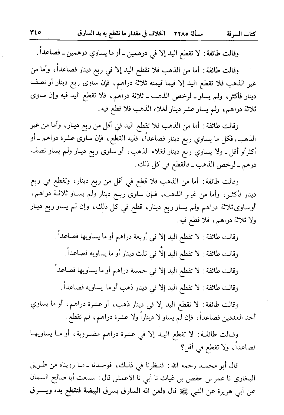وَقَالَتْ طَائِفَةٌ: لَا تُقْطَعُ الْيَدُ إلَّا فِي عَشَرَةِ دَرَاهِمَ مَضْرُوبَةٍ، أَوْ مَا يُسَاوِيهَا فَصَاعِدًا، وَلَا تُقْطَعُ فِي أَقَلَّ؟ قَالَ أَبُو مُحَمَّدٍ - رَحِمَهُ اللَّهُ -: فَنَظَرْنَا فِي ذَلِكَ، فَوَجَدْنَا - مَا رُوِّينَاهُ مِنْ طَرِيقِ الْبُخَارِيِّ نا عُمَرُ بْنُ حَفْصِ بْنِ غِيَاثٍ نا أَبِي نا الْأَعْمَشُ قَالَ: سَمِعْت أَبَا صَالِحٍ السَّمَّانَ عَنْ أَبِي هُرَيْرَةَ عَنْ النَّبِيِّ - صَلَّى اللَّهُ عَلَيْهِ وَسَلَّمَ - قَالَ «لَعَنَ اللَّهُ السَّارِقَ يَسْرِقُ الْبَيْضَةَ فَتُقْطَعُ يَدُهُ وَيَسْرِقُ
