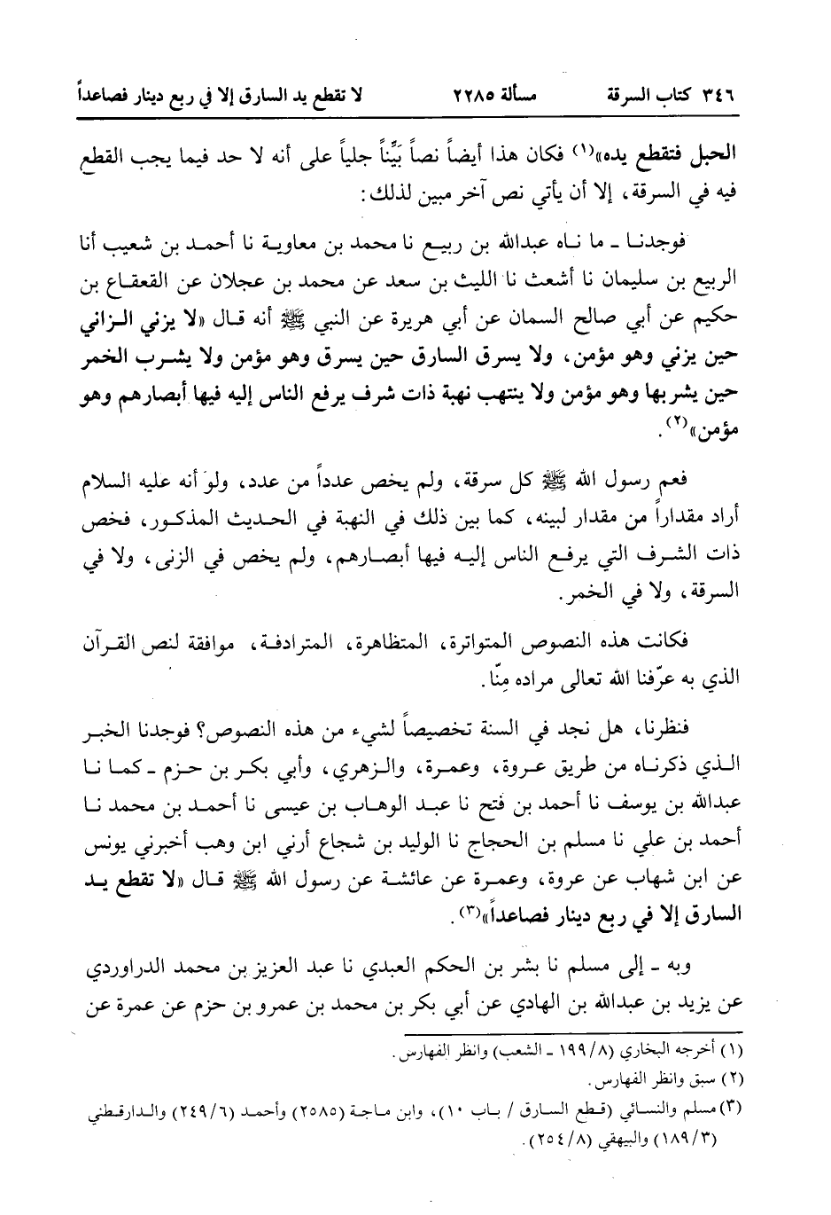 فَنَظَرْنَا، هَلْ نَجِدُ فِي السُّنَّةِ تَخْصِيصًا لِشَيْءٍ مِنْ هَذِهِ النُّصُوصِ؟ فَوَجَدْنَا الْخَبَرَ الَّذِي ذَكَرْنَاهُ مِنْ طَرِيقِ عُرْوَةَ، وَعَمْرَةَ، وَالزُّهْرِيِّ، وَأَبِي بَكْرِ بْنِ حَزْمٍ - كَمَا نا عَبْدُ اللَّهِ بْنُ يُوسُفَ نا أَحْمَدُ بْنُ فَتْحٍ نا عَبْدُ الْوَهَّابِ بْنُ عِيسَى نا أَحْمَدُ بْنُ مُحَمَّدٍ نا أَحْمَدُ بْنُ عَلِيٍّ نا مُسْلِمُ بْنُ الْحَجَّاجِ نا الْوَلِيدُ بْنُ شُجَاعٍ أَرِنِي ابْنُ وَهْبٍ أَخْبَرَنِي يُونُسُ عَنْ ابْنِ شِهَابٍ عَنْ عُرْوَةَ، وَعَمْرَةَ عَنْ عَائِشَةَ عَنْ رَسُولِ اللَّهِ - صَلَّى اللَّهُ عَلَيْهِ وَسَلَّمَ - قَالَ «لَا تُقْطَعُ يَدُ السَّارِقِ إلَّا فِي رُبْعِ دِينَارٍ فَصَاعِدًا» .