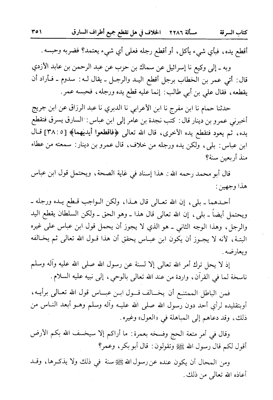 حَدَّثَنَا حُمَامٌ نا ابْنُ مُفَرِّجٍ نا ابْنُ الْأَعْرَابِيِّ نا الدَّبَرِيُّ نا عَبْدُ الرَّزَّاقِ عَنْ ابْنِ جُرَيْجٍ أَخْبَرَنِي عَمْرُو بْنُ دِينَارٍ قَالَ: كَتَبَ نَجْدَةُ بْنُ عَامِرٍ إلَى ابْنِ عَبَّاسٍ: السَّارِقُ يَسْرِقُ فَتُقْطَعُ يَدُهُ، ثُمَّ يَعُودُ فَتُقْطَعُ يَدُهُ الْأُخْرَى، قَالَ اللَّهُ تَعَالَى {فَاقْطَعُوا أَيْدِيَهُمَا} [المائدة: 38] قَالَ ابْنُ عَبَّاسٍ: بَلَى، وَلَكِنَّ يَدَهُ وَرِجْلَهُ مِنْ خِلَافٍ، قَالَ عَمْرُو بْنُ دِينَارٍ: سَمِعْته مِنْ عَطَاءٍ مُنْذُ أَرْبَعِينَ سَنَةً؟ قَالَ أَبُو مُحَمَّدٍ - رَحِمَهُ اللَّهُ -: هَذَا إسْنَادٌ فِي غَايَةِ الصِّحَّةِ، وَيَحْتَمِلُ قَوْلُ ابْنِ عَبَّاسٍ هَذَا وَجْهَيْنِ: