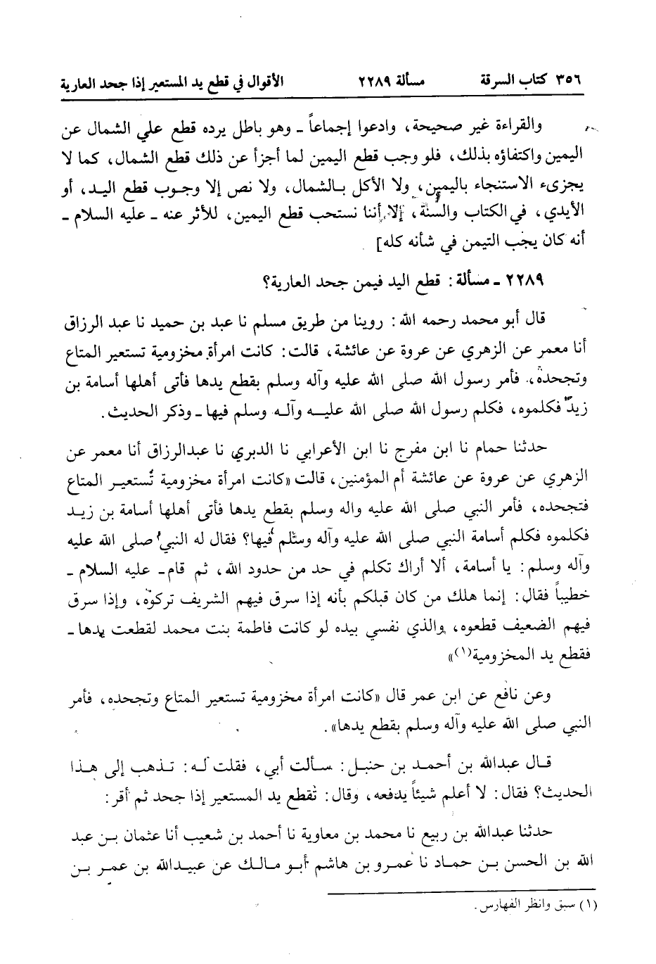 2289 - مَسْأَلَةٌ: قَطْعُ الْيَدِ فِيمَنْ جَحَدَ الْعَارِيَّةَ؟ قَالَ أَبُو مُحَمَّدٍ - رَحِمَهُ اللَّهُ -: رُوِّينَا مِنْ طَرِيقِ مُسْلِمٍ نا عَبْدُ بْنُ حُمَيْدٍ نا عَبْدُ الرَّزَّاقِ أَنَا مَعْمَرٌ عَنْ الزُّهْرِيِّ عَنْ عُرْوَةَ عَنْ عَائِشَةَ، قَالَتْ: «كَانَتْ امْرَأَةٌ مَخْزُومِيَّةٌ تَسْتَعِيرُ الْمَتَاعَ وَتَجْحَدُهُ، فَأَمَرَ رَسُولُ اللَّهِ - صَلَّى اللَّهُ عَلَيْهِ وَآلِهِ وَسَلَّمَ - بِقَطْعِ يَدِهَا فَأَتَى أَهْلُهَا أُسَامَةَ بْنَ زَيْدٍ فَكَلَّمُوهُ، فَكَلَّمَ رَسُولَ اللَّهِ - صَلَّى اللَّهُ عَلَيْهِ وَآلِهِ وَسَلَّمَ - فِيهَا» وَذَكَر الْحَدِيثَ.
