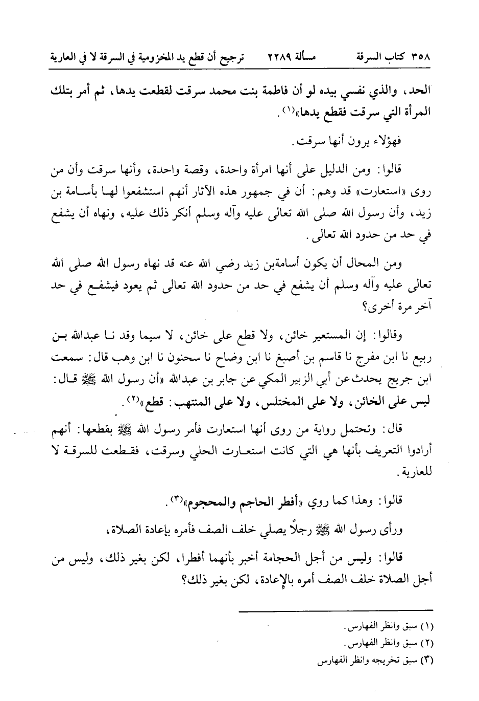 وَمِنْ الْمُحَالِ أَنْ يَكُونَ أُسَامَةُ بْنُ زَيْدٍ - رَضِيَ اللَّهُ عَنْهُ - قَدْ نَهَاهُ رَسُولُ اللَّهِ - صَلَّى اللَّهُ عَلَيْهِ وَآلِهِ وَسَلَّمَ - أَنْ يَشْفَعَ فِي حَدٍّ مِنْ حُدُودِ اللَّهِ تَعَالَى ثُمَّ يَعُودُ فَيَشْفَعُ فِي حَدٍّ آخَرَ مَرَّةً أُخْرَى؟ وَقَالُوا: إنَّ الْمُسْتَعِيرَ خَائِنٌ، وَلَا قَطْعَ عَلَى خَائِنٍ، لَا سِيَّمَا وَقَدْ نا عَبْدُ اللَّهِ بْنُ رَبِيعٍ نا ابْنُ مُفَرِّجٍ نا قَاسِمُ بْنُ أَصْبَغَ نا ابْنُ وَضَّاحٍ نا سَحْنُونٌ نا ابْنُ وَهْبٍ قَالَ: سَمِعْت ابْنَ جُرَيْجٍ يُحَدِّثُ عَنْ أَبِي الزُّبَيْرِ الْمَكِّيِّ عَنْ جَابِرِ بْنَ عَبْدِ اللَّهِ أَنَّ رَسُولَ اللَّهِ - صَلَّى اللَّهُ عَلَيْهِ وَسَلَّمَ - قَالَ: «لَيْسَ عَلَى الْخَائِنِ، وَلَا عَلَى الْمُخْتَلِسِ، وَلَا عَلَى الْمُنْتَهِبِ: قَطْعٌ» .