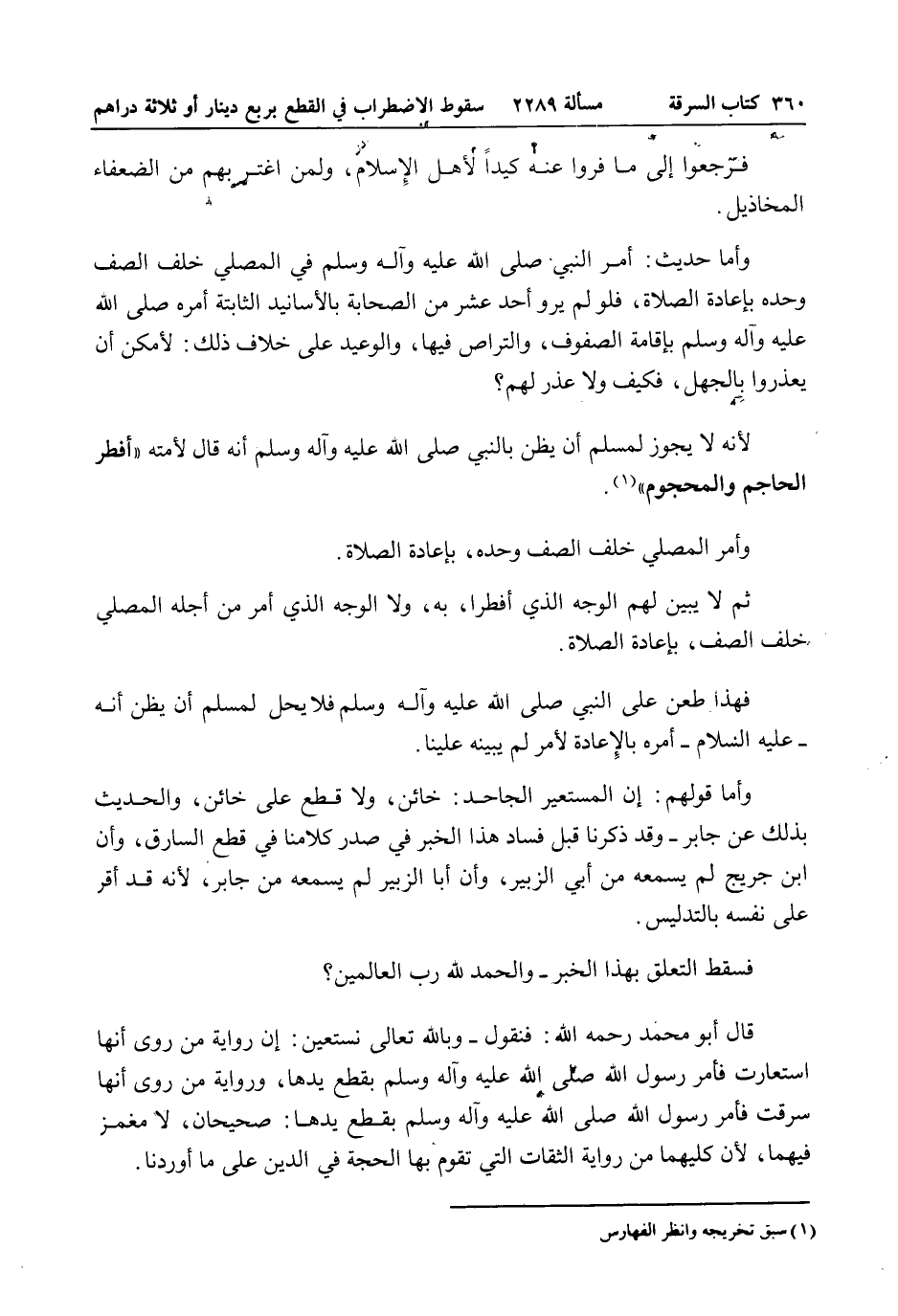 وَأَمَّا حَدِيثُ: أَمْرِ النَّبِيِّ - صَلَّى اللَّهُ عَلَيْهِ وَآلِهِ وَسَلَّمَ - فِي الْمُصَلِّي خَلْفَ الصَّفِّ وَحْدَهُ بِإِعَادَةِ الصَّلَاةِ، فَلَوْ لَمْ يَرْوِ أَحَدَ عَشَرَ مِنْ الصَّحَابَةِ بِالْأَسَانِيدِ الثَّابِتَةِ أَمْرَهُ - صَلَّى اللَّهُ عَلَيْهِ وَآلِهِ وَسَلَّمَ - بِإِقَامَةِ الصُّفُوفِ، وَالتَّرَاصِّ فِيهَا، وَالْوَعِيدِ عَلَى خِلَافِ ذَلِكَ: لَأَمْكَنَ أَنْ يُعْذَرُوا بِالْجَهْلِ، فَكَيْف وَلَا عُذْرَ لَهُمْ؟ ؛ لِأَنَّهُ لَا يَجُوزُ لِمُسْلِمٍ أَنْ يُظَنَّ بِالنَّبِيِّ - صَلَّى اللَّهُ عَلَيْهِ وَآلِهِ وَسَلَّمَ - أَنَّهُ قَالَ لِأُمَّتِهِ «أَفْطَرَ الْحَاجِمُ وَالْمَحْجُومُ» .