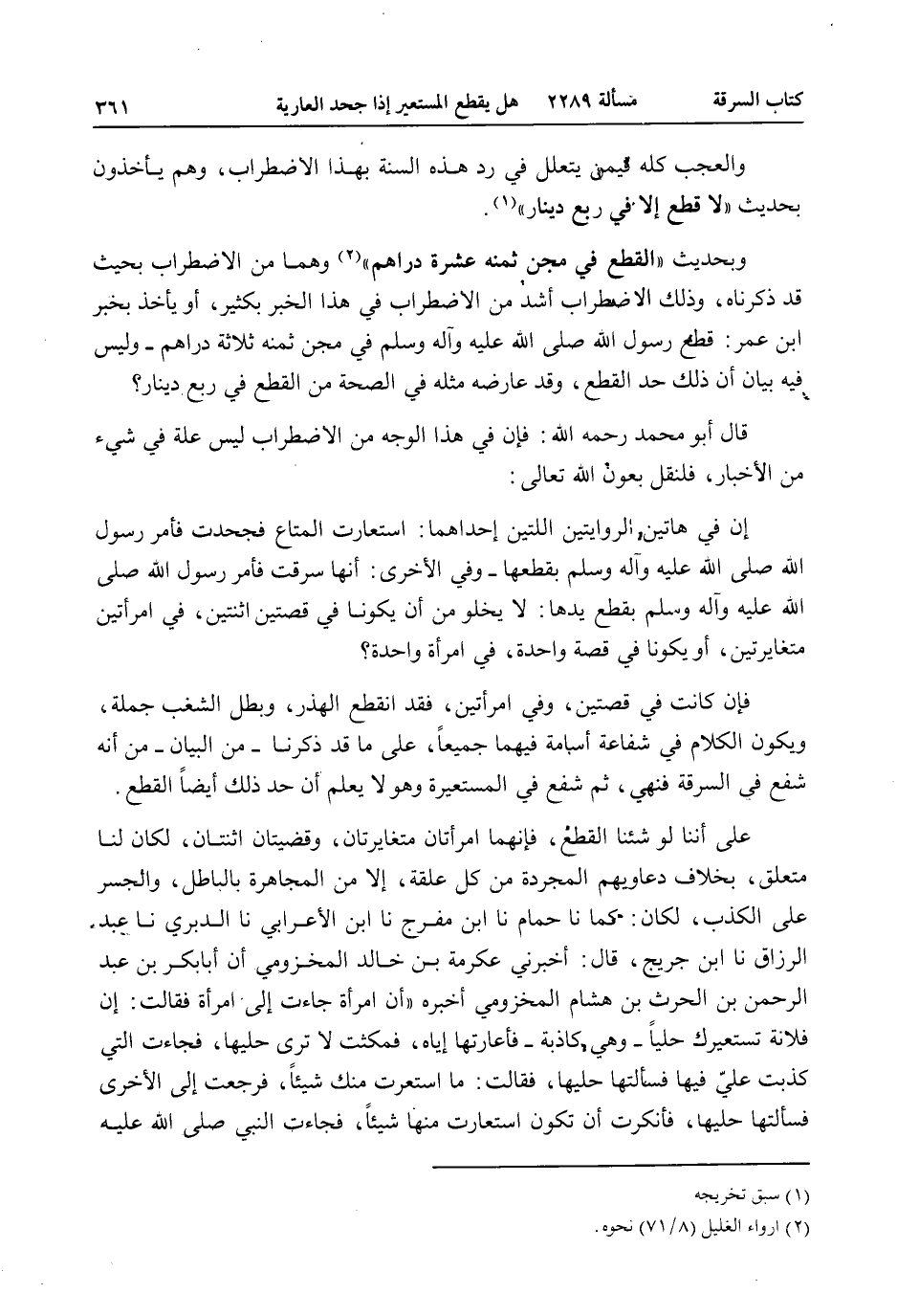 وَبِحَدِيثِ «الْقَطْعِ فِي مِجَنٍّ ثَمَنُهُ عَشَرَةُ دَرَاهِمَ» وَهُمَا مِنْ الِاضْطِرَابِ بِحَيْثُ قَدْ ذَكَرْنَاهُ، وَذَلِكَ الِاضْطِرَابُ أَشَدُّ مِنْ الِاضْطِرَابِ فِي هَذَا الْخَبَرِ بِكَثِيرٍ، أَوْ يَأْخُذُ بِخَبَرِ ابْنِ عُمَرَ: «قَطَعَ رَسُولُ اللَّهِ - صَلَّى اللَّهُ عَلَيْهِ وَآلِهِ وَسَلَّمَ - فِي مِجَنٍّ ثَمَنُهُ ثَلَاثَةُ دَرَاهِمَ» وَلَيْسَ فِيهِ بَيَانٌ أَنَّ ذَلِكَ حَدُّ الْقَطْعِ، وَقَدْ عَارَضَهُ مِثْلُهُ فِي الصِّحَّةِ مِنْ الْقَطْعِ فِي رُبْعِ دِينَارٍ؟ قَالَ أَبُو مُحَمَّدٍ - رَحِمَهُ اللَّهُ -: فَإِنَّ فِي هَذَا الْوَجْهِ مِنْ الِاضْطِرَابِ لَيْسَ عِلَّةً فِي شَيْءٍ مِنْ الْأَخْبَارِ، فَلِنَقُلْ بِعَوْنِ اللَّهِ تَعَالَى: إنَّ فِي هَاتَيْنِ الرِّوَايَتَيْنِ اللَّتَيْنِ إحْدَاهُمَا: اسْتَعَارَتْ الْمَتَاعَ فَجَحَدَتْ فَأَمَرَ رَسُولُ اللَّهِ - صَلَّى اللَّهُ عَلَيْهِ وَآلِهِ وَسَلَّمَ - بِقَطْعِهَا - وَفِي الْأُخْرَى: أَنَّهَا سَرَقَتْ فَأَمَرَ رَسُولُ اللَّهِ - صَلَّى اللَّهُ عَلَيْهِ وَآلِهِ وَسَلَّمَ - بِقَطْعِ يَدِهَا: لَا يَخْلُو مِنْ أَنْ يَكُونَا فِي قِصَّتَيْنِ اثْنَتَيْنِ، فِي امْرَأَتَيْنِ مُتَغَايِرَتَيْنِ، أَوْ يَكُونَا فِي قِصَّةٍ وَاحِدَةٍ، فِي امْرَأَةٍ وَاحِدَةٍ؟ فَإِنْ كَانَتْ فِي قِصَّتَيْنِ، وَفِي امْرَأَتَيْنِ، فَقَدْ انْقَطَعَ الْهَذْرُ، وَبَطَل الشَّغَبُ جُمْلَةً، وَيَكُونُ الْكَلَامُ فِي شَفَاعَةِ أُسَامَةَ فِيهِمَا جَمِيعًا، عَلَى مَا قَدْ ذَكَرْنَا - مِنْ الْبَيَانِ - مِنْ أَنَّهُ شَفَعَ فِي السَّرِقَةِ فَنُهِيَ، ثُمَّ شَفَعَ فِي الْمُسْتَعِيرَةِ وَهُوَ لَا يَعْلَمُ أَنَّ حَدَّ ذَلِكَ أَيْضًا الْقَطْعُ.