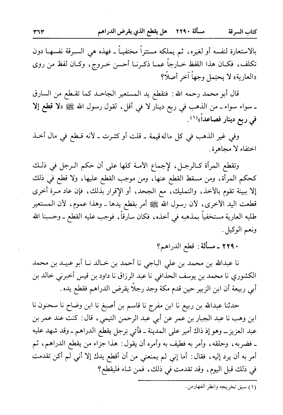 2290 - مَسْأَلَةٌ: قَطْعُ الدَّرَاهِمِ؟ نا عَبْدُ اللَّهِ بْنُ مُحَمَّدِ بْنِ عَلِيٍّ الْبَاجِيَّ نا أَحْمَدُ بْنُ خَالِدٍ نا أَبُو عُبَيْدِ بْنِ مُحَمَّدٍ الْكَشْوَرِيُّ نا مُحَمَّدُ بْنُ يُوسُفَ الْحُذَافِيُّ نا عَبْدُ الرَّزَّاقِ نا دَاوُد بْنُ قَيْسٍ أَخْبَرَنِي خَالِدُ بْنُ أَبِي رَبِيعَةَ أَنَّ ابْنَ الزُّبَيْرِ حِينَ قَدِمَ مَكَّةَ وَجَدَ رَجُلًا يَقْرِضُ الدَّرَاهِمَ فَقَطَعَ يَدَهُ.