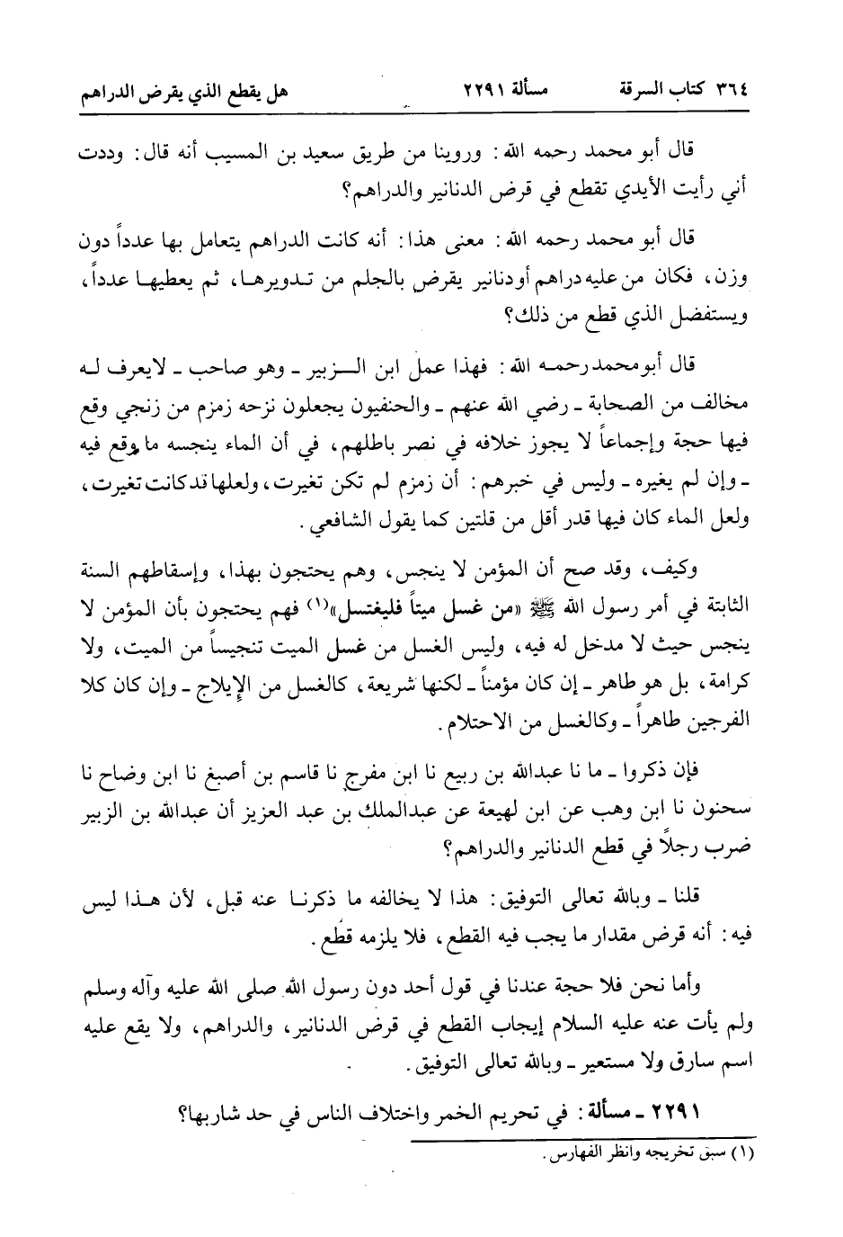 قَالَ أَبُو مُحَمَّدٍ - رَحِمَهُ اللَّهُ -: وَرُوِّينَا مِنْ طَرِيقِ سَعِيدِ بْنِ الْمُسَيِّبِ أَنَّهُ قَالَ: وَدِدْتُ أَنِّي رَأَيْت الْأَيْدِي تُقْطَعُ فِي قَرْضِ الدَّنَانِيرِ وَالدَّرَاهِمِ؟ قَالَ أَبُو مُحَمَّدٍ - رَحِمَهُ اللَّهُ -: مَعْنَى هَذَا: أَنَّهُ كَانَتْ الدَّرَاهِمُ يُتَعَامَلُ بِهَا عَدَدًا دُونَ وَزْنٍ، فَكَانَ مَنْ عَلَيْهِ دَرَاهِمُ أَوْ دَنَانِيرُ يَقْرِضُ بِالْجَلَمِ مِنْ تَدْوِيرِهَا، ثُمَّ يُعْطِيهَا عَدَدًا، وَيَسْتَفْضِلُ الَّذِي قَطَعَ مِنْ ذَلِكَ؟ قَالَ أَبُو مُحَمَّدٍ - رَحِمَهُ اللَّهُ -: فَهَذَا عَمَلُ ابْنِ الزُّبَيْرِ - وَهُوَ صَاحِبٌ - لَا يُعْرَفُ لَهُ مُخَالِفٌ مِنْ الصَّحَابَةِ - رَضِيَ اللَّهُ عَنْهُمْ - وَالْحَنَفِيُّونَ يَجْعَلُونَ نَزْحَهُ زَمْزَمَ مِنْ زِنْجِيٍّ وَقَعَ فِيهَا حُجَّةً وَإِجْمَاعًا لَا يَجُوزُ خِلَافُهُ فِي نَصْرِ بَاطِلِهِمْ، فِي أَنَّ الْمَاءَ يُنَجِّسُهُ مَا وَقَعَ فِيهِ - وَإِنْ لَمْ يُغَيِّرْهُ - وَلَيْسَ فِي خَبَرِهِمْ: أَنَّ زَمْزَم لَمْ تَكُنْ تَغَيَّرَتْ، وَلَعَلَّهَا قَدْ كَانَتْ تَغَيَّرَتْ، وَلَعَلَّ الْمَاءَ كَانَ فِيهَا قَدْرَ أَقَلَّ مِنْ قُلَّتَيْنِ كَمَا يَقُولُ الشَّافِعِيُّ.