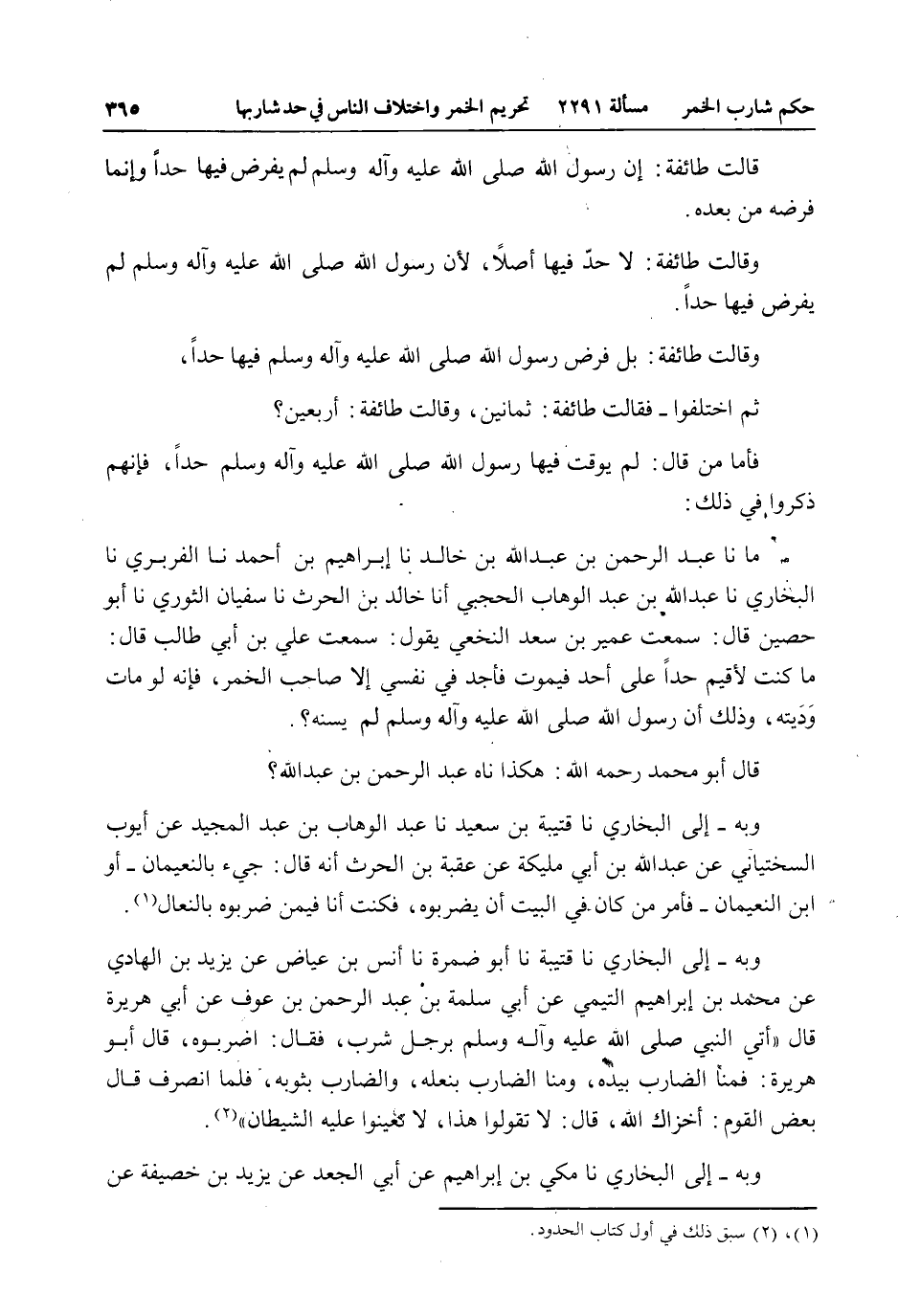 وَقَالَتْ طَائِفَةٌ: بَلْ فَرَضَ رَسُولُ اللَّهِ - صَلَّى اللَّهُ عَلَيْهِ وَآلِهِ وَسَلَّمَ - فِيهَا حَدًّا، ثُمَّ اخْتَلَفُوا - فَقَالَتْ طَائِفَةٌ: ثَمَانِينَ، وَقَالَتْ طَائِفَةٌ: أَرْبَعِينَ؟ فَأَمَّا مَنْ قَالَ: لَمْ يُوَقِّتْ فِيهَا رَسُولُ اللَّهِ - صَلَّى اللَّهُ عَلَيْهِ وَآلِهِ وَسَلَّمَ - حَدًّا، فَإِنَّهُمْ ذَكَرُوا فِي ذَلِكَ: مَا نا عَبْدُ الرَّحْمَنِ بْنُ عَبْدِ اللَّهِ بْنِ خَالِدٍ نا إبْرَاهِيمُ بْنُ أَحْمَدَ نا الْفَرَبْرِيُّ نا الْبُخَارِيُّ نا عَبْدُ اللَّهِ بْنُ عَبْدِ الْوَهَّابِ الْحَجَبِيُّ نا خَالِدُ بْنُ الْحَارِثِ نا سُفْيَانُ الثَّوْرِيُّ نا أَبُو حُصَيْنٍ قَالَ: سَمِعْتُ عُمَيْرَ بْنَ سَعْدٍ النَّخَعِيّ يَقُولُ: «سَمِعْتُ عَلِيَّ بْنَ أَبِي طَالِبٍ قَالَ: مَا كُنْتُ لِأُقِيمَ حَدًّا عَلَى أَحَدٍ فَيَمُوتَ فَأَجِدُ فِي نَفْسِي إلَّا صَاحِبَ الْخَمْرِ، فَإِنَّهُ لَوْ مَاتَ وَدَيْتُهُ، وَذَلِكَ أَنَّ رَسُولَ اللَّهِ - صَلَّى اللَّهُ عَلَيْهِ وَآلِهِ وَسَلَّمَ - لَمْ يَسُنَّهُ» ؟ . قَالَ أَبُو مُحَمَّدٍ - رَحِمَهُ اللَّهُ -: هَكَذَا ناه عَبْدُ الرَّحْمَنِ بْنُ عَبْدِ اللَّهِ؟ وَبِهِ - إلَى الْبُخَارِيِّ نا قُتَيْبَةُ بْنُ سَعِيدٍ نا عَبْدُ الْوَهَّابِ بْنُ عَبْدِ الْمَجِيدِ عَنْ أَيُّوبَ السِّخْتِيَانِيِّ عَنْ عَبْدِ اللَّهِ بْنِ أَبِي مُلَيْكَةَ عَنْ عُقْبَةَ بْنِ الْحَارِثِ أَنَّهُ قَالَ: جِيءَ بِالنُّعَيْمَانَ - أَوْ ابْنِ النُّعَيْمَانِ - فَأَمَرَ مَنْ كَانَ فِي الْبَيْتِ أَنْ يَضْرِبُوهُ، فَكُنْتُ أَنَا فِيمَنْ ضَرَبُوهُ بِالنِّعَالِ.