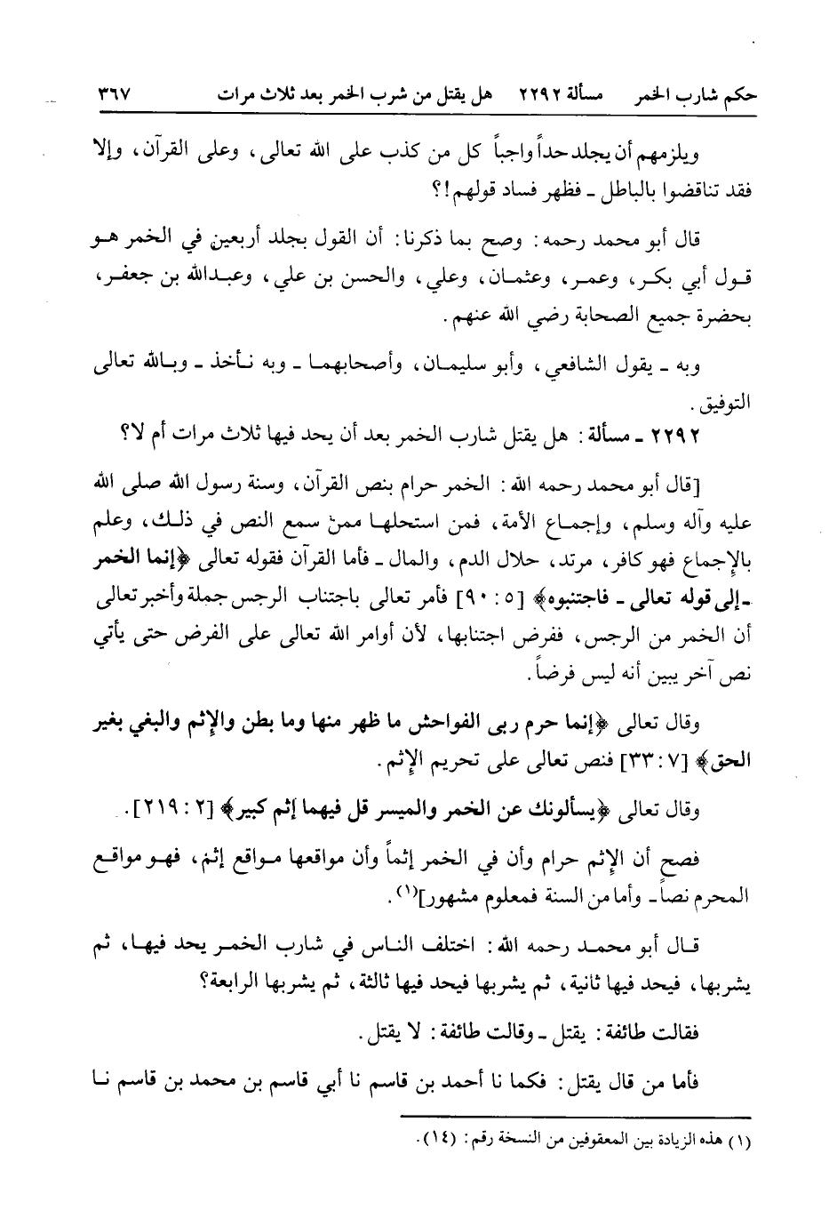 2292 - مَسْأَلَةٌ: هَلْ يُقْتَلُ شَارِبُ الْخَمْرِ بَعْدَ أَنْ يُحَدَّ فِيهَا ثَلَاثَ مَرَّاتٍ أَمْ لَا؟ [قَالَ أَبُو مُحَمَّدٍ - رَحِمَهُ اللَّهُ -: الْخَمْرُ حَرَامٌ بِنَصِّ الْقُرْآنِ، وَسُنَّةِ رَسُولِ اللَّهِ - صَلَّى اللَّهُ عَلَيْهِ وَآلِهِ وَسَلَّمَ -، وَإِجْمَاعِ الْأُمَّةِ، فَمَنْ اسْتَحَلَّهَا مِمَّنْ سَمِعَ النَّصَّ فِي ذَلِكَ، وَعَلِمَ بِالْإِجْمَاعِ فَهُوَ كَافِرٌ، مُرْتَدٌّ، حَلَالُ الدَّمِ، وَالْمَالِ - فَأَمَّا الْقُرْآنُ فَقَوْلُهُ تَعَالَى {إِنَّمَا الْخَمْرُ} [المائدة: 90] إلَى قَوْله تَعَالَى {فَاجْتَنِبُوهُ} [المائدة: 90] فَأَمَرَ تَعَالَى بِاجْتِنَابِ الرِّجْسِ جُمْلَةً وَأَخْبَرَ تَعَالَى أَنَّ الْخَمْرَ مِنْ الرِّجْسِ، فَفَرَضَ اجْتِنَابَهَا؛ لِأَنَّ أَوَامِرَ اللَّهِ تَعَالَى عَلَى الْفَرْضِ حَتَّى يَأْتِيَ نَصٌّ آخَرُ يُبَيِّنُ أَنَّهُ لَيْسَ فَرْضًا.