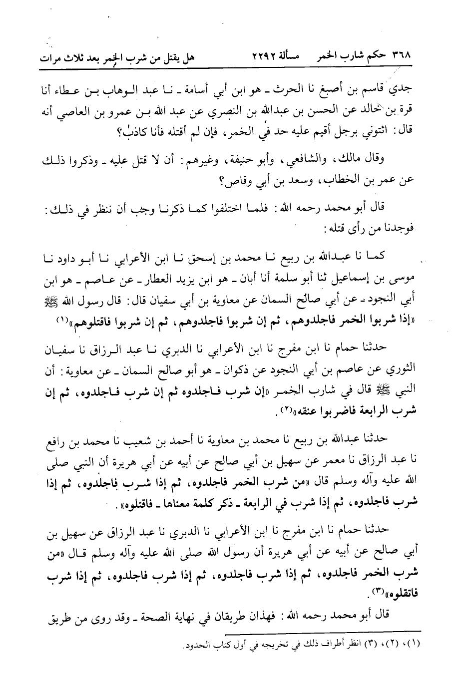 جَدِّي قَاسِمُ بْنُ أَصْبَغَ نا الْحَارِثُ - هُوَ ابْنُ أَبِي أُسَامَةَ - نا عَبْدُ الْوَهَّابِ بْنُ عَطَاءٍ أَنَا قُرَّةُ بْنُ خَالِدٍ عَنْ الْحَسَنِ بْنِ عَبْدِ اللَّهِ بْنِ النَّصْرِيِّ عَنْ عَبْدِ اللَّهِ بْنِ عَمْرِو بْنِ الْعَاصِ أَنَّهُ قَالَ: ائْتُونِي بِرَجُلٍ أُقِيمَ عَلَيْهِ حَدٌّ فِي الْخَمْرِ، فَإِنْ لَمْ أَقْتُلْهُ فَأَنَا كَاذِبٌ؟ وَقَالَ مَالِكٌ، وَالشَّافِعِيُّ، وَأَبُو حَنِيفَةَ، وَغَيْرُهُمْ: أَنْ لَا قَتْلَ عَلَيْهِ - وَذَكَرُوا ذَلِكَ عَنْ عُمَرَ بْنِ الْخَطَّابِ، وَسَعْدِ بْنِ أَبِي وَقَّاصٍ؟ قَالَ أَبُو مُحَمَّدٍ - رَحِمَهُ اللَّهُ -: فَلَمَّا اخْتَلَفُوا كَمَا ذَكَرْنَا وَجَبَ أَنْ نَنْظُرَ فِي ذَلِكَ: فَوَجَدْنَا مَنْ رَأَى قَتْلَهُ: كَمَا نا عَبْدُ اللَّهِ بْنُ رَبِيعٍ نا مُحَمَّدُ بْنُ إِسْحَاقَ نا ابْنُ الْأَعْرَابِيِّ نا أَبُو دَاوُد نا مُوسَى بْنُ إسْمَاعِيلَ ثنا أَبُو سَلَمَةَ نا أَبَانُ - هُوَ ابْنُ يَزِيدَ الْعَطَّارُ - عَنْ عَاصِمٍ - هُوَ ابْنُ أَبِي النَّجُودِ - عَنْ أَبِي صَالِحٍ السَّمَّانِ عَنْ مُعَاوِيَةَ بْنِ أَبِي سُفْيَانَ قَالَ: قَالَ رَسُولُ اللَّهِ - صَلَّى اللَّهُ عَلَيْهِ وَسَلَّمَ - «إذَا شَرِبُوا الْخَمْرَ فَاجْلِدُوهُمْ، ثُمَّ إنْ شَرِبُوا فَاجْلِدُوهُمْ، ثُمَّ إنْ شَرِبُوا فَاقْتُلُوهُمْ» حَدَّثَنَا حُمَامٌ نا ابْنُ مُفَرِّجٍ نا ابْنُ الْأَعْرَابِيِّ نا الدَّبَرِيُّ نا عَبْدُ الرَّزَّاقِ نا سُفْيَانُ الثَّوْرِيُّ عَنْ عَاصِمِ بْنِ أَبِي النَّجُودِ عَنْ ذَكْوَانَ - هُوَ أَبُو صَالِحٍ السَّمَّانُ - عَنْ مُعَاوِيَةَ: أَنَّ النَّبِيَّ - صَلَّى اللَّهُ عَلَيْهِ وَسَلَّمَ - قَالَ فِي شَارِبِ الْخَمْرِ «إنْ شَرِبَ فَاجْلِدُوهُ ثُمَّ إنْ شَرِبَ فَاجْلِدُوهُ، ثُمَّ إنْ شَرِبَ الرَّابِعَةَ فَاضْرِبُوا عُنُقَهُ» .