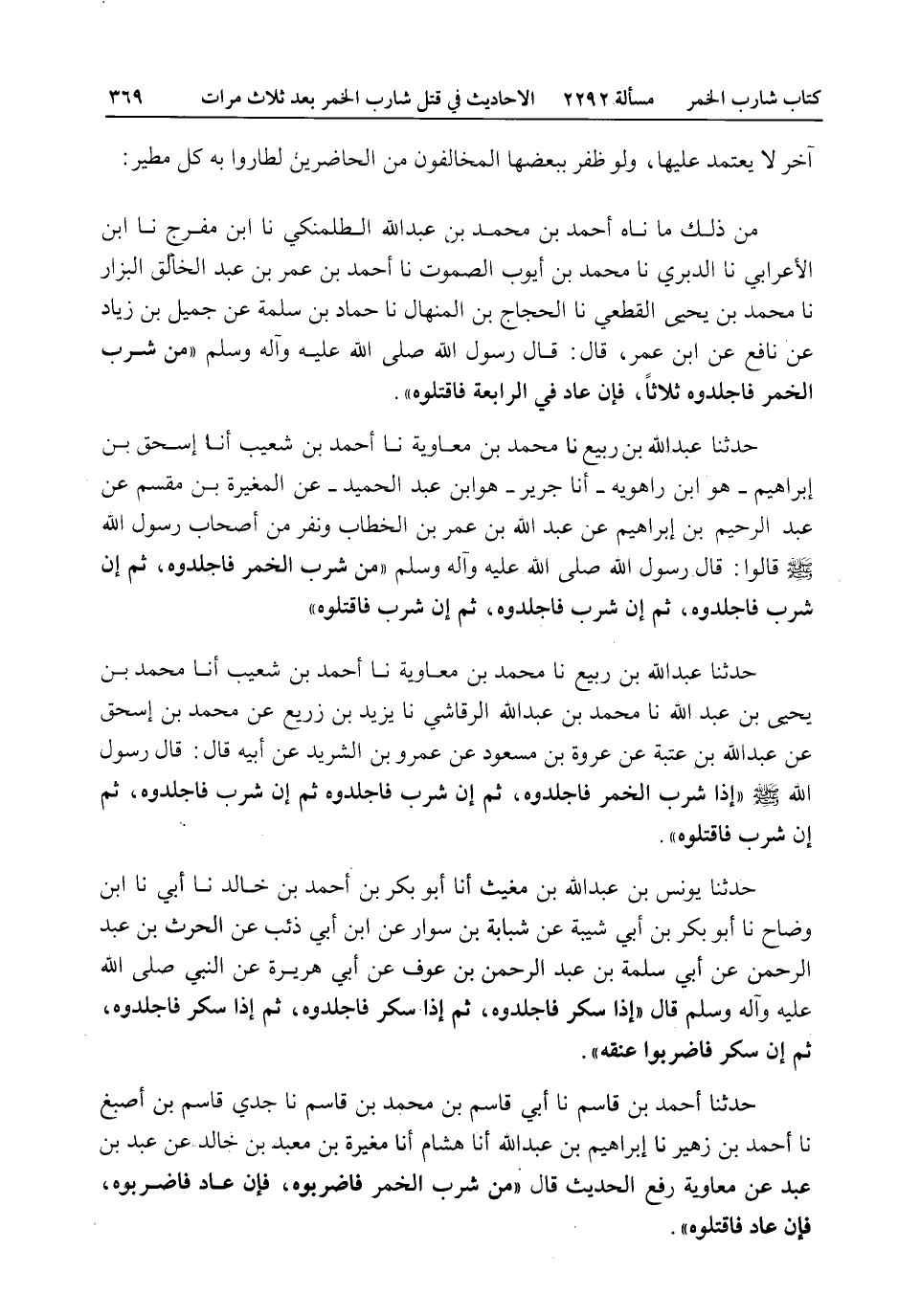 حَدَّثَنَا عَبْدُ اللَّهِ بْنُ رَبِيعٍ نا مُحَمَّدُ بْنُ مُعَاوِيَةَ نا أَحْمَدُ بْنُ شُعَيْبٍ أَنَا إِسْحَاقُ بْنُ إبْرَاهِيمَ - هُوَ ابْنُ رَاهْوَيْهِ - أَنَا جَرِيرٌ - هُوَ ابْنُ عَبْدِ الْحَمِيدِ - عَنْ الْمُغِيرَةِ بْنِ مِقْسَمٍ عَنْ عَبْدِ الرَّحِيمِ بْنِ إبْرَاهِيمَ عَنْ عَبْدِ اللَّهِ بْنِ عُمَرَ بْنِ الْخَطَّابِ وَنَفَرٍ مِنْ أَصْحَابِ رَسُولِ اللَّهِ - صَلَّى اللَّهُ عَلَيْهِ وَسَلَّمَ - قَالُوا: قَالَ رَسُولُ اللَّهِ - صَلَّى اللَّهُ عَلَيْهِ وَآلِهِ وَسَلَّمَ - «مَنْ شَرِبَ الْخَمْرَ فَاجْلِدُوهُ، ثُمَّ إنْ شَرِبَ فَاجْلِدُوهُ، ثُمَّ إنْ شَرِبَ فَاجْلِدُوهُ، ثُمَّ إنْ شَرِبَ فَاقْتُلُوهُ» حَدَّثَنَا عَبْدُ اللَّهِ بْنُ رَبِيعٍ نا مُحَمَّدُ بْنُ مُعَاوِيَةَ نا أَحْمَدُ بْنُ شُعَيْبٍ أَنَا مُحَمَّدُ بْنُ يَحْيَى بْنِ عَبْدِ اللَّهِ نا مُحَمَّدُ بْنُ عَبْدِ اللَّهِ الرَّقَاشِيُّ نا يَزِيدُ بْنُ زُرَيْعٍ عَنْ مُحَمَّدِ بْنِ إِسْحَاقَ عَنْ عَبْدِ اللَّهِ بْنِ عُتْبَةَ عَنْ عُرْوَةَ بْنِ مَسْعُودٍ عَنْ عَمْرِو بْنِ الشَّرِيدِ عَنْ أَبِيهِ قَالَ: قَالَ رَسُولُ اللَّهِ - صَلَّى اللَّهُ عَلَيْهِ وَسَلَّمَ - «إذَا شَرِبَ الْخَمْرَ فَاجْلِدُوهُ، ثُمَّ إنْ شَرِبَ فَاجْلِدُوهُ، ثُمَّ إنْ شَرِبَ فَاجْلِدُوهُ، ثُمَّ إنْ شَرِبَ فَاقْتُلُوهُ» .