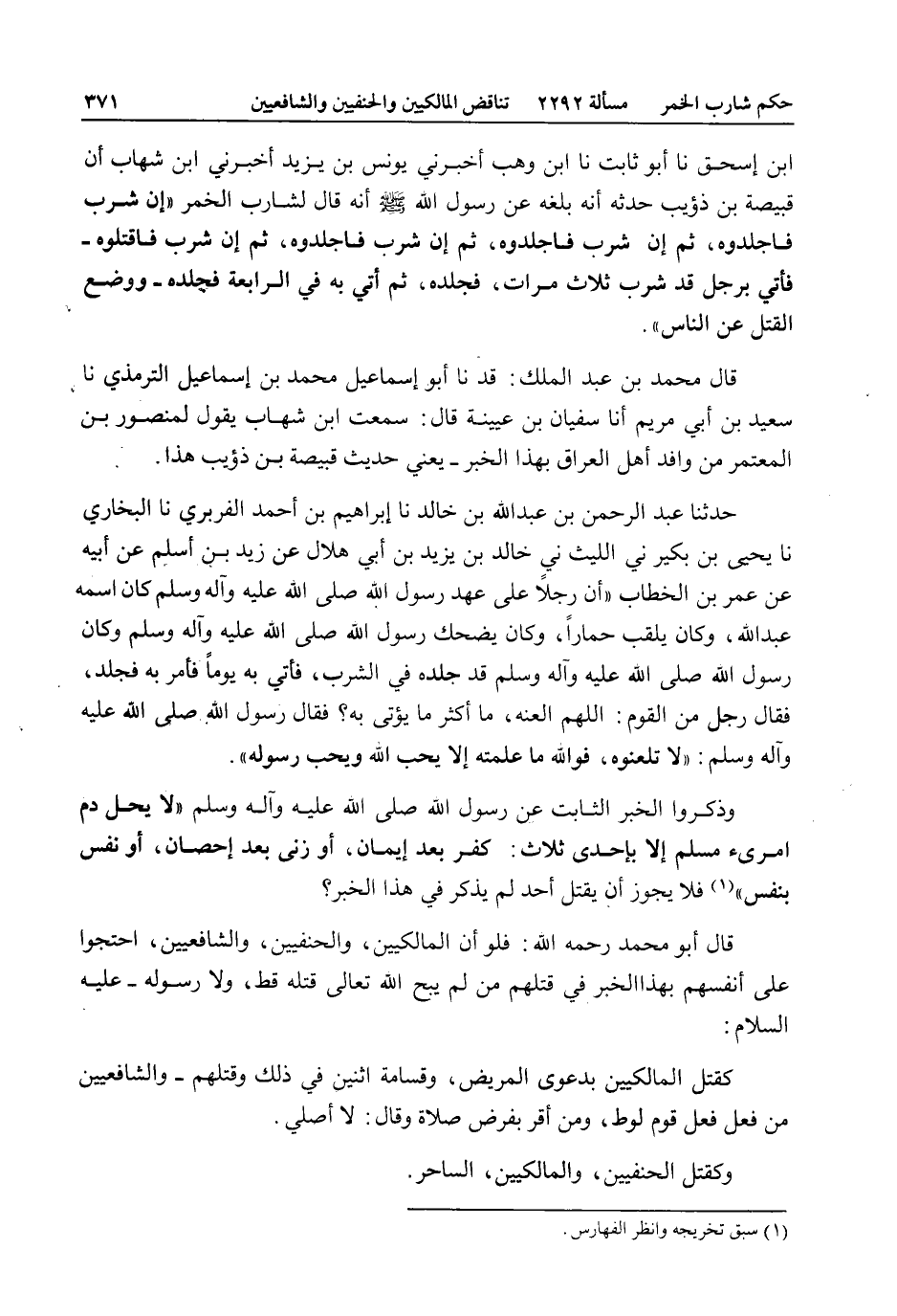 حَدَّثَنَا عَبْدُ الرَّحْمَنِ بْنُ عَبْدِ اللَّهِ بْنِ خَالِدٍ نا إبْرَاهِيمُ بْنُ أَحْمَدَ الْفَرَبْرِيُّ نا الْبُخَارِيُّ نا يَحْيَى بْنُ بُكَيْرٍ ثني اللَّيْثُ ثني خَالِدُ بْنُ يَزِيدَ بْنِ أَبِي هِلَالٍ عَنْ زَيْدِ بْنِ أَسْلَمَ عَنْ أَبِيهِ عَنْ عُمَرَ بْنِ الْخَطَّابِ «أَنَّ رَجُلًا عَلَى عَهْدِ رَسُولِ اللَّهِ - صَلَّى اللَّهُ عَلَيْهِ وَآلِهِ وَسَلَّمَ - كَانَ اسْمُهُ عَبْدَ اللَّهِ، وَكَانَ يُلَقَّبُ حِمَارًا، وَكَانَ يُضْحِكُ رَسُولَ اللَّهِ - صَلَّى اللَّهُ عَلَيْهِ وَآلِهِ وَسَلَّمَ - وَكَانَ رَسُولُ اللَّهِ - صَلَّى اللَّهُ عَلَيْهِ وَآلِهِ وَسَلَّمَ - قَدْ جَلَدَهُ فِي الشُّرْبِ، فَأُتِيَ بِهِ يَوْمًا فَأَمَرَ بِهِ فَجُلِدَ، فَقَالَ رَجُلٌ مِنْ الْقَوْمِ: اللَّهُمَّ الْعَنْهُ، مَا أَكْثَرَ مَا يُؤْتَى بِهِ؟ فَقَالَ رَسُولُ اللَّهِ - صَلَّى اللَّهُ عَلَيْهِ وَآلِهِ وَسَلَّمَ -: لَا تَلْعَنُوهُ، فَوَاَللَّهِ مَا عَلِمْتُهُ إلَّا يُحِبُّ اللَّهَ وَيُحِبُّ رَسُولَهُ» . وَذَكَرُوا الْخَبَرَ الثَّابِتَ عَنْ رَسُولِ اللَّهِ - صَلَّى اللَّهُ عَلَيْهِ وَآلِهِ وَسَلَّمَ - «لَا يَحِلُّ دَمُ امْرِئٍ مُسْلِمٍ إلَّا بِإِحْدَى ثَلَاثٍ: كُفْرٌ بَعْدَ إيمَانٍ، أَوْ زِنًى بَعْدَ إحْصَانٍ، أَوْ نَفْسٌ بِنَفْسٍ» فَلَا يَجُوزُ أَنْ يُقْتَلَ أَحَدٌ لَمْ يُذْكَرْ فِي هَذَا الْخَبَرِ؟ قَالَ أَبُو مُحَمَّدٍ - رَحِمَهُ اللَّهُ -: فَلَوْ أَنَّ الْمَالِكِيِّينَ، وَالْحَنَفِيِّينَ، وَالشَّافِعِيِّينَ، احْتَجُّوا عَلَى أَنْفُسِهِمْ بِهَذَا الْخَبَرِ فِي قَتْلِهِمْ مَنْ لَمْ يُبِحْ اللَّهُ تَعَالَى قَتْلَهُ قَطُّ، وَلَا رَسُولُهُ - عَلَيْهِ السَّلَامُ -: كَقَتْلِ الْمَالِكِيِّينَ بِدَعْوَى الْمَرِيضِ، وَقَسَامَةِ اثْنَيْنِ فِي ذَلِكَ وَقَتْلِهِمْ - وَالشَّافِعِيِّينَ مَنْ فَعَلَ فِعْلَ قَوْمِ لُوطٍ، وَمَنْ أَقَرَّ بِفَرْضِ صَلَاةٍ وَقَالَ: لَا أُصَلِّي. وَكَقَتْلِ الْحَنَفِيِّينَ، وَالْمَالِكِيِّينَ، السَّاحِرَ.