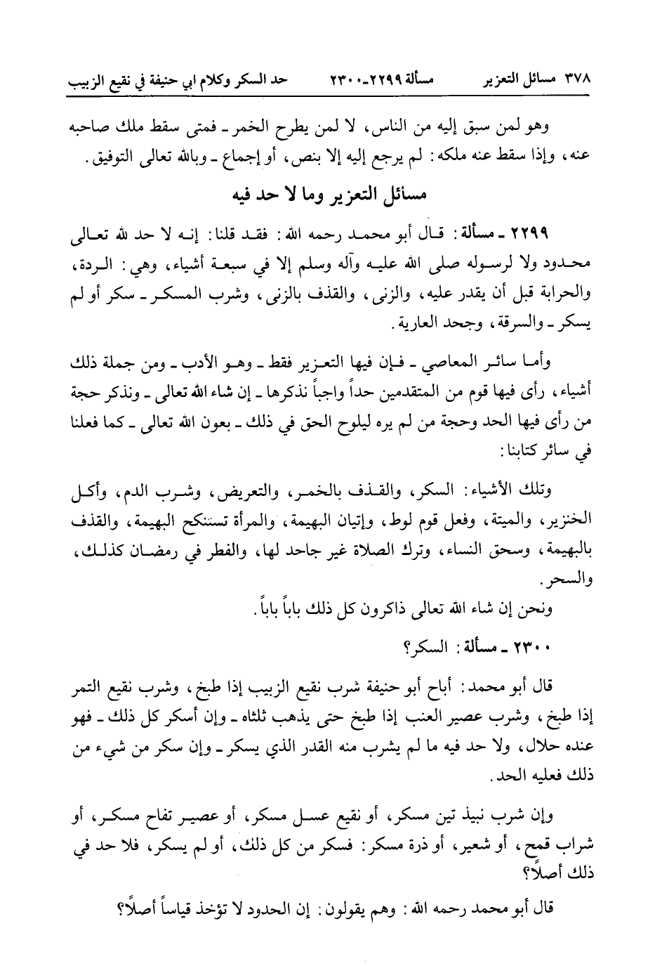 2300 - مَسْأَلَةٌ: السُّكْرُ؟ قَالَ أَبُو مُحَمَّدٍ: أَبَاحَ أَبُو حَنِيفَةَ شُرْبَ نَقِيعِ الزَّبِيبِ إذَا طُبِخَ، وَشُرْبَ نَقِيعِ التَّمْرِ إذَا طُبِخَ، وَشُرْبَ عَصِيرِ الْعِنَبِ إذَا طُبِخَ حَتَّى يَذْهَبَ ثُلُثَاهُ - وَإِنْ أَسْكَرَ كُلُّ ذَلِكَ - فَهُوَ عِنْدَهُ حَلَالٌ، وَلَا حَدَّ فِيهِ مَا لَمْ يَشْرَبْ مِنْهُ الْقَدْرَ الَّذِي يُسْكِرُ - وَإِنْ سَكِرَ مِنْ شَيْءٍ مِنْ ذَلِكَ فَعَلَيْهِ الْحَدُّ.
