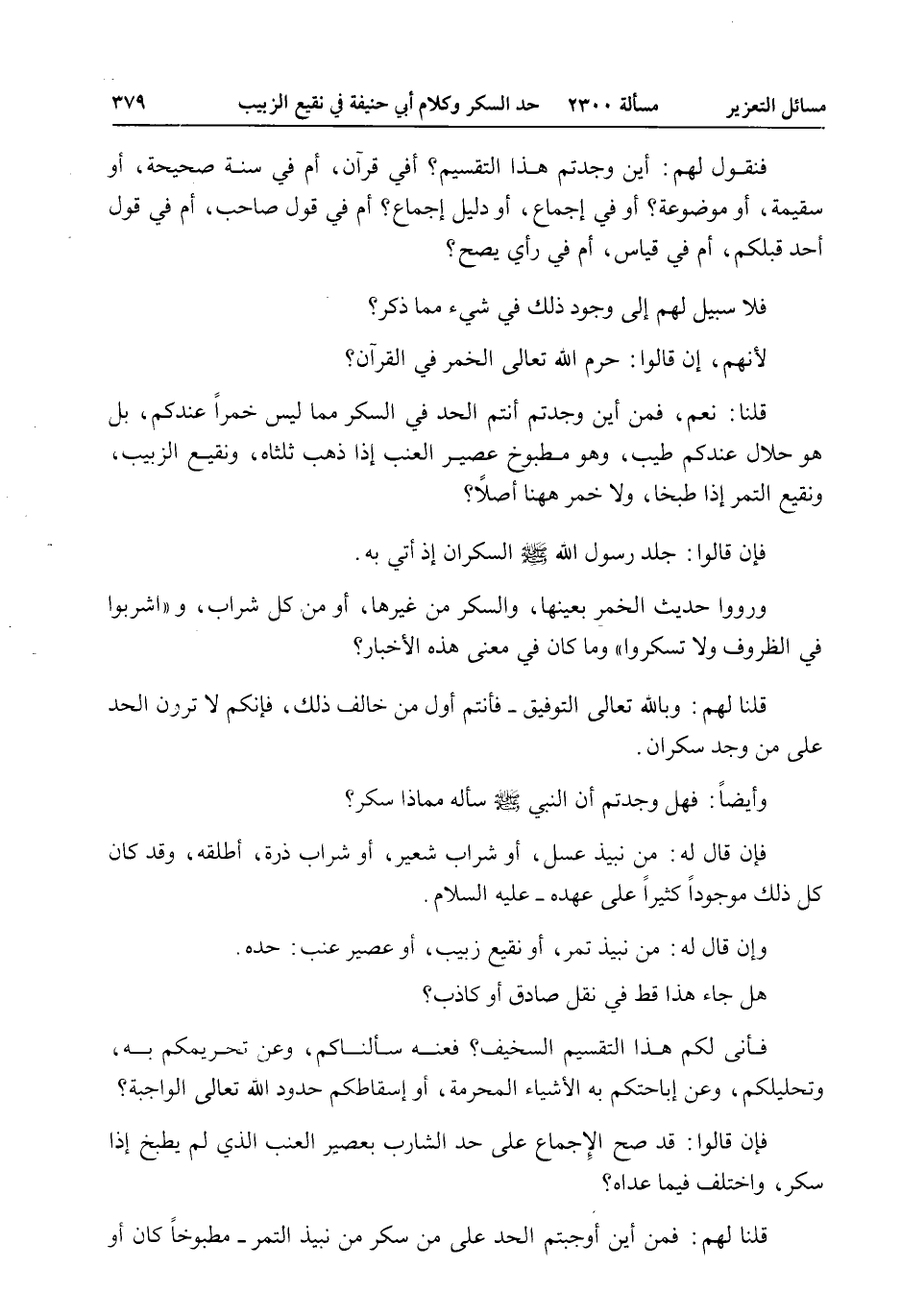 فَنَقُولُ لَهُمْ: أَيْنَ وَجَدْتُمْ هَذَا التَّقْسِيمَ؟ أَفِي قُرْآنٍ، أُمّ فِي سُنَّةٍ صَحِيحَةٍ، أَوْ سَقِيمَةٍ، أَوْ مَوْضُوعَةٍ؟ أَوْ فِي إجْمَاعٍ، أَوْ دَلِيلِ إجْمَاعٍ؟ أَمْ فِي قَوْلِ صَاحِبٍ، أَمْ فِي قَوْلِ أَحَدٍ قَبْلَكُمْ، أَمْ فِي قِيَاسٍ، أَمْ فِي رَأْيِ يَصِحُّ؟ فَلَا سَبِيلَ لَهُمْ إلَى وُجُودِ ذَلِكَ فِي شَيْءٍ مِمَّا ذُكِرَ؟ ؛ لِأَنَّهُمْ، إنْ قَالُوا: حَرَّمَ اللَّهُ تَعَالَى الْخَمْرَ فِي الْقُرْآنِ؟ قُلْنَا: نَعَمْ، فَمِنْ أَيْنَ وَجَدْتُمْ أَنْتُمْ الْحَدَّ فِي السُّكْرِ مِمَّا لَيْسَ خَمْرًا عِنْدَكُمْ، بَلْ هُوَ حَلَالٌ عِنْدَكُمْ طَيِّبٌ، وَهُوَ مَطْبُوخُ عَصِيرِ الْعِنَبِ إذَا ذَهَبَ ثُلُثَاهُ، وَنَقِيعُ الزَّبِيبِ، وَنَقِيعُ التَّمْرِ إذَا طُبِخَا، وَلَا خَمْرَ هَاهُنَا أَصْلًا؟ فَإِنْ قَالُوا: «جَلَدَ رَسُولُ اللَّهِ - صَلَّى اللَّهُ عَلَيْهِ وَسَلَّمَ - السَّكْرَانَ إذْ أُتِيَ بِهِ» .