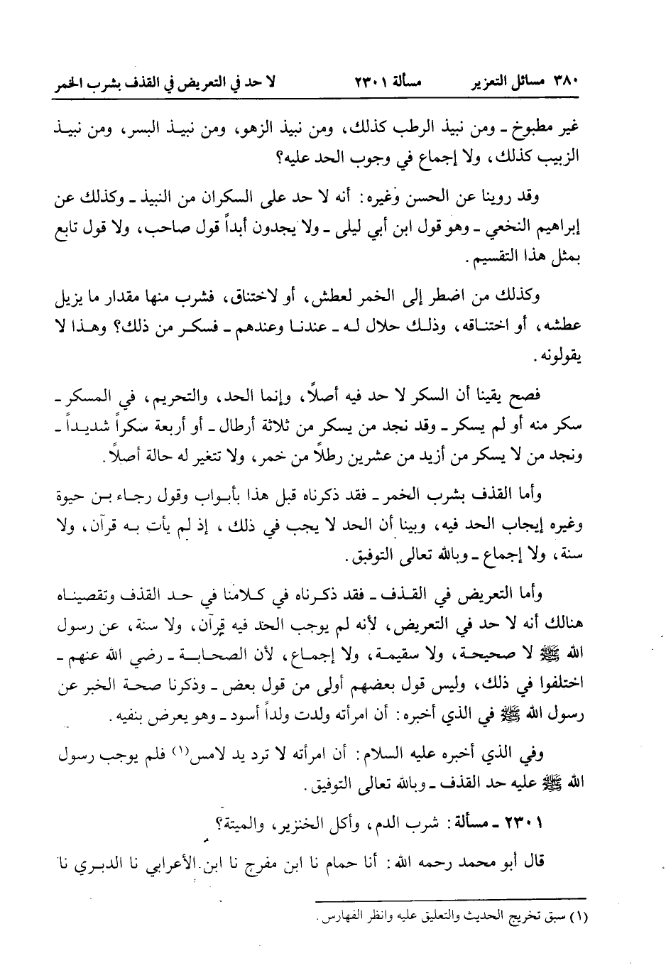 وَفِي «الَّذِي أَخْبَرَهُ - عَلَيْهِ السَّلَامُ -: أَنَّ امْرَأَتَهُ لَا تَرُدُّ يَدَ لَامِسٍ فَلَمْ يُوجِبْ رَسُولُ اللَّهِ - صَلَّى اللَّهُ عَلَيْهِ وَسَلَّمَ - عَلَيْهِ حَدَّ الْقَذْفِ» - وَبِاَللَّهِ تَعَالَى التَّوْفِيقُ. 2301 -