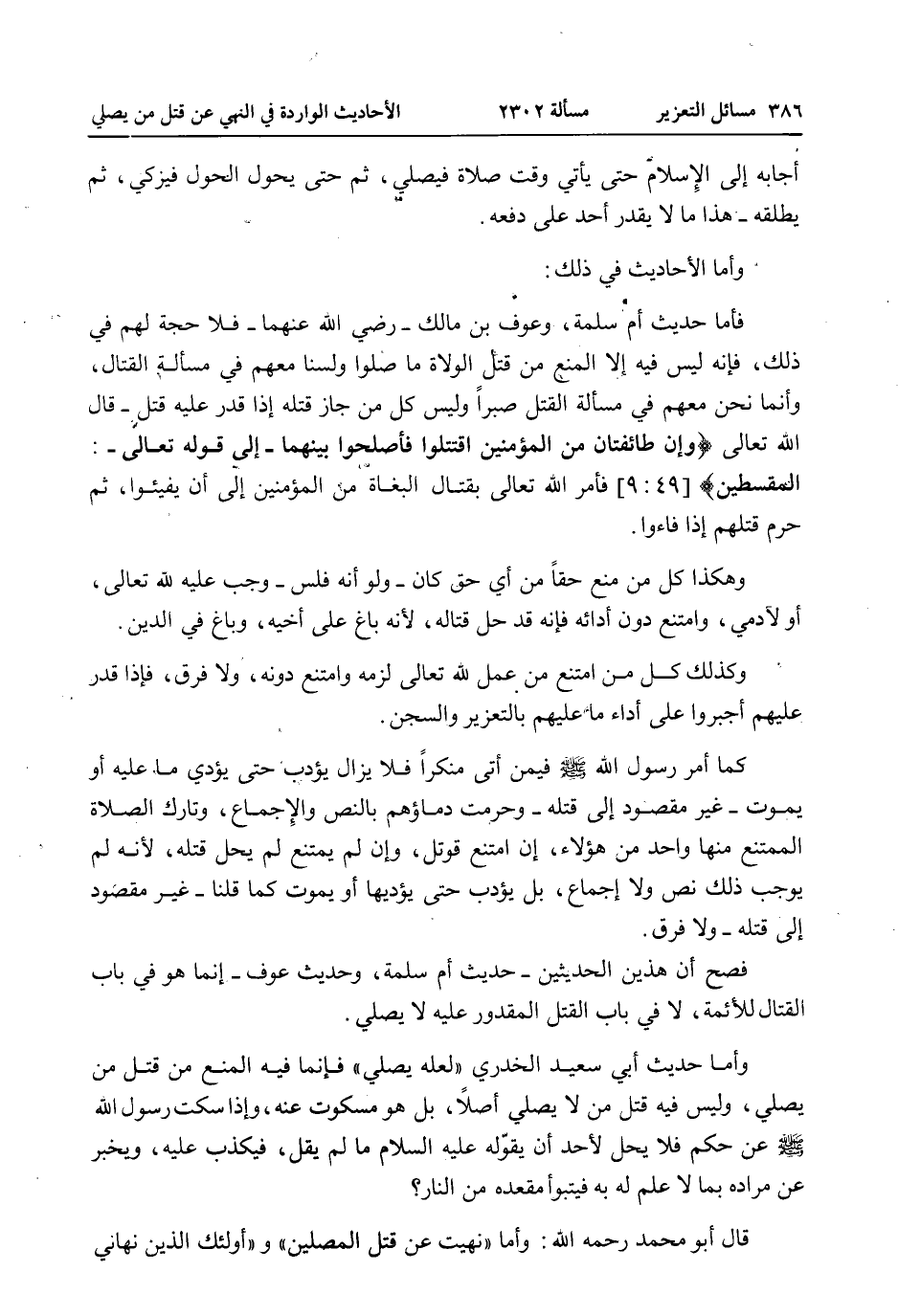 وَأَمَّا الْأَحَادِيثُ فِي ذَلِكَ: فَأَمَّا حَدِيثُ أُمِّ سَلَمَةَ، وَعَوْفِ بْنِ مَالِكٍ - رَضِيَ اللَّهُ عَنْهُمَا - فَلَا حُجَّةَ لَهُمْ فِي ذَلِكَ، فَإِنَّهُ لَيْسَ فِيهِ إلَّا الْمَنْعُ مِنْ قَتْلِ الْوُلَاةِ مَا صَلُّوا وَلَسْنَا مَعَهُمْ فِي مَسْأَلَةِ الْقِتَالِ، وَإِنَّمَا نَحْنُ مَعَهُمْ فِي مَسْأَلَةِ الْقَتْلِ صَبْرًا وَلَيْسَ كُلُّ مَنْ جَازَ قَتْلُهُ إذَا قُدِرَ عَلَيْهِ قُتِلَ - قَالَ اللَّهُ تَعَالَى {وَإِنْ طَائِفَتَانِ مِنَ الْمُؤْمِنِينَ اقْتَتَلُوا فَأَصْلِحُوا بَيْنَهُمَا} [الحجرات: 9] إلَى قَوْله تَعَالَى: {الْمُقْسِطِينَ} [الحجرات: 9] فَأَمَرَ اللَّهُ تَعَالَى بِقِتَالِ الْبُغَاةِ مِنْ الْمُؤْمِنِينَ إلَى أَنْ يَفِيئُوا، ثُمَّ حَرَّمَ قَتْلَهُمْ إذَا فَاءُوا.