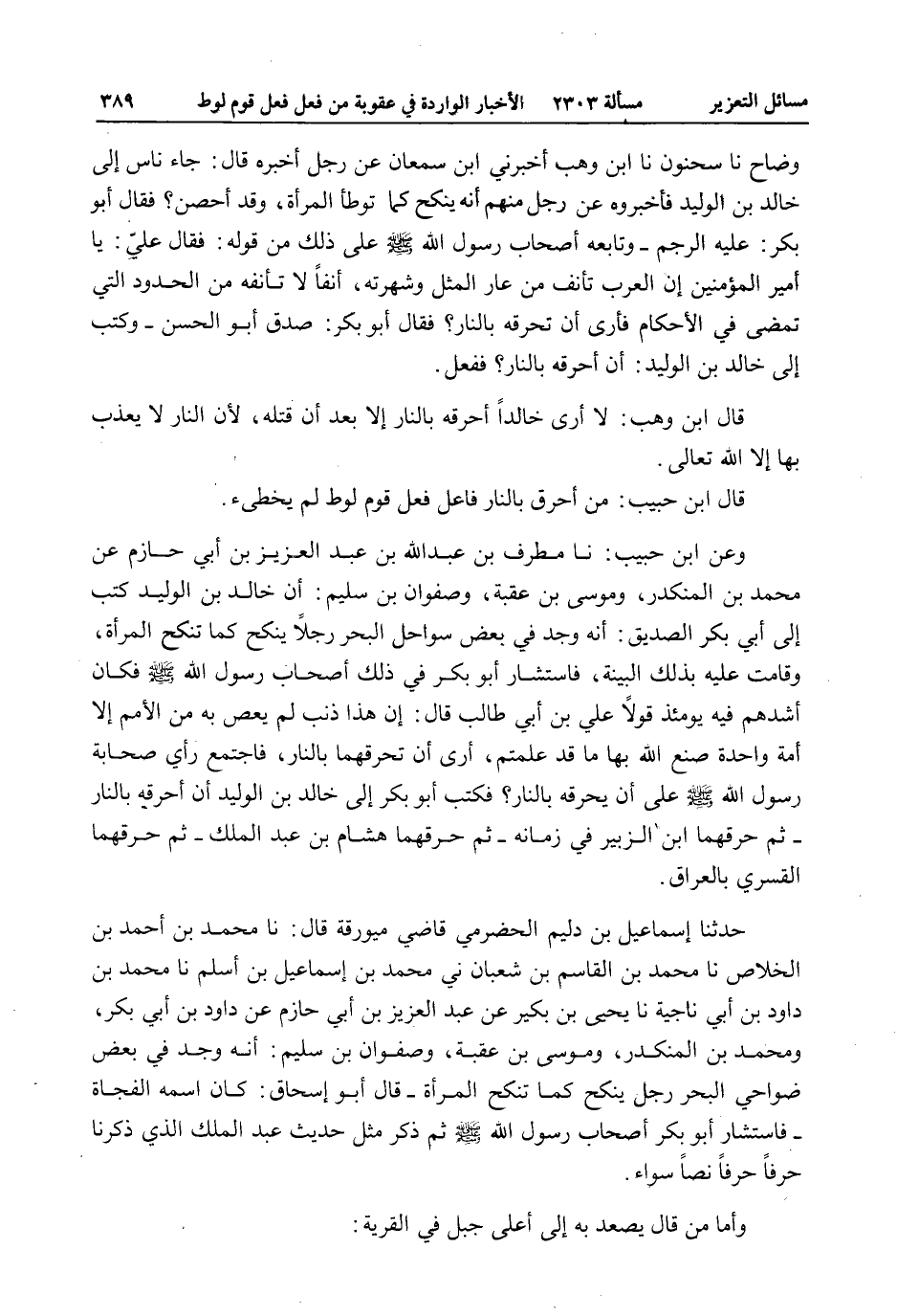 وَعَنْ ابْنِ حَبِيبٍ: نا مُطَرِّفُ بْنُ عَبْدِ اللَّهِ بْنِ عَبْدِ الْعَزِيزِ بْنِ أَبِي حَازِمٍ عَنْ مُحَمَّدِ بْنِ الْمُنْكَدِرِ، وَمُوسَى بْنِ عُقْبَةَ وَصَفْوَانُ بْنُ سُلَيْمٍ: أَنَّ خَالِدَ بْنَ الْوَلِيدِ كَتَبَ إلَى أَبِي بَكْرٍ الصِّدِّيقِ: أَنَّهُ وَجَدَ فِي بَعْضِ سَوَاحِلِ الْبَحْرِ رَجُلًا يُنْكَحُ كَمَا تُنْكَحُ الْمَرْأَةُ، وَقَامَتْ عَلَيْهِ بِذَلِكَ الْبَيِّنَةُ، فَاسْتَشَارَ أَبُو بَكْرٍ فِي ذَلِكَ أَصْحَابَ رَسُولِ اللَّهِ - صَلَّى اللَّهُ عَلَيْهِ وَسَلَّمَ - فَكَانَ أَشَدُّهُمْ فِيهِ يَوْمئِذٍ قَوْلًا عَلِيُّ بْنُ أَبِي طَالِبٍ قَالَ: إنَّ هَذَا ذَنْبٌ لَمْ يَعْصِ بِهِ مِنْ الْأُمَمِ إلَّا أُمَّةٌ وَاحِدَةٌ صَنَعَ اللَّهُ بِهَا مَا قَدْ عَلِمْتُمْ، أَرَى أَنْ تُحْرِقَهُمَا بِالنَّارِ، فَاجْتَمَعَ رَأْي صَحَابَةِ رَسُولِ اللَّه - صَلَّى اللَّهُ عَلَيْهِ وَسَلَّمَ - عَلَى أَنْ يُحْرِقَهُ بِالنَّارِ؟ فَكَتَبَ أَبُو بَكْرٍ إلَى خَالِدِ بْنِ الْوَلِيدِ أَنْ أَحْرِقْهُ بِالنَّارِ - ثُمَّ حَرَقَهُمَا ابْنُ الزُّبَيْرِ فِي زَمَانِهِ - ثُمَّ حَرَقَهُمَا هِشَامُ بْنُ عَبْدِ الْمَلِكِ - ثُمَّ حَرَقَهُمَا الْقَسْرِيُّ بِالْعِرَاقِ.