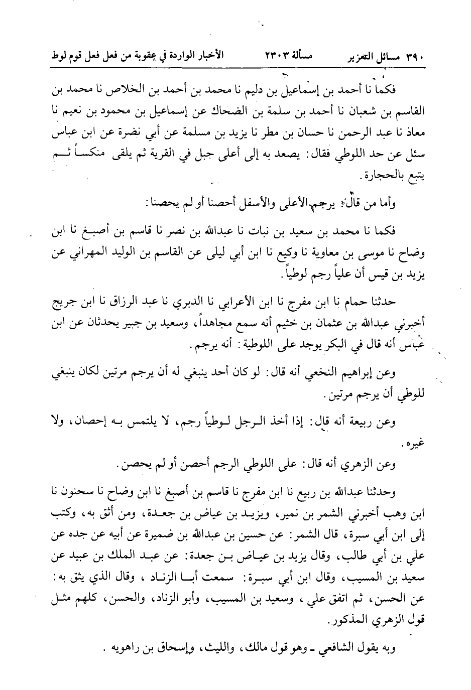 وَأَمَّا مَنْ قَالَ: يُرْجَمُ الْأَعْلَى وَالْأَسْفَلُ أَحْصَنَا أَوْ لَمْ يُحْصِنَا: فَكَمَا نا مُحَمَّدُ بْنُ سَعِيدِ بْنِ نُبَاتٍ نا عَبْدُ اللَّهِ بْنُ نَصْرٍ نا قَاسِمُ بْنُ أَصْبَغَ نا ابْنُ وَضَّاحٍ نا مُوسَى بْنُ مُعَاوِيَةَ نا وَكِيعٌ نا ابْنُ أَبِي لَيْلَى عَنْ الْقَاسِمِ بْنِ الْوَلِيدِ الْمِهْرَانِيِّ عَنْ يَزِيدَ بْنِ قَيْسٍ أَنَّ عَلِيًّا رَجَمَ لُوطِيًّا.