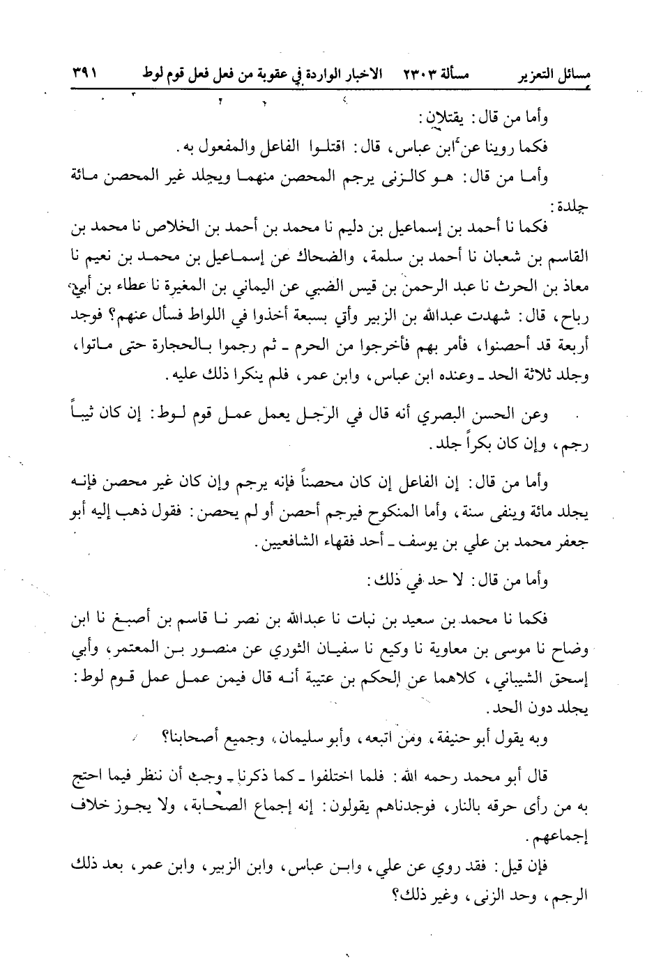 وَأَمَّا مَنْ قَالَ: يُقْتَلَانِ: فَكَمَا رُوِّينَا عَنْ ابْنِ عَبَّاسٍ، قَالَ: اُقْتُلُوا الْفَاعِلَ وَالْمَفْعُولَ بِهِ. وَأَمَّا مَنْ قَالَ: هُوَ كَالزِّنَى يُرْجَمُ الْمُحْصَنُ مِنْهُمَا وَيُجْلَدُ غَيْرُ الْمُحْصَنِ مِائَةَ جَلْدَةٍ: فَكَمَا نا أَحْمَدُ بْنُ إسْمَاعِيلَ بْنِ دُلَيْمٍ نا مُحَمَّدُ بْنُ أَحْمَدَ بْنِ الْخَلَّاصِ نا مُحَمَّدُ بْنُ الْقَاسِمِ بْنِ شَعْبَانَ نا أَحْمَدُ بْنُ سَلَمَةَ، وَالضَّحَّاكُ عَنْ إسْمَاعِيلَ بْنِ مُحَمَّدِ بْنِ نُعَيْمٍ نا مُعَاذُ بْنُ الْحَارِثِ نا عَبْدُ الرَّحْمَنِ بْنُ قَيْسٍ الضَّبِّيُّ عَنْ الْيَمَانِي بْنِ الْمُغِيرَةِ نا عَطَاءُ بْنُ أَبِي رَبَاحٍ، قَالَ: شَهِدْت عَبْدَ اللَّهِ بْنَ الزُّبَيْرِ وَأُتِيَ بِسَبْعَةٍ أَخَذُوا فِي اللِّوَاطِ فَسَأَلَ عَنْهُمْ؟ فَوَجَدَ أَرْبَعَةً قَدْ أَحْصَنُوا، فَأَمَرَ بِهِمْ فَأُخْرِجُوا مِنْ الْحَرَمِ - ثُمَّ رُجِمُوا بِالْحِجَارَةِ حَتَّى مَاتُوا، وَجَلَدَ ثَلَاثَةً الْحَدَّ - وَعِنْدَهُ ابْنُ عَبَّاسٍ، وَابْنُ عُمَرَ، فَلَمْ يُنْكِرَا ذَلِكَ عَلَيْهِ.