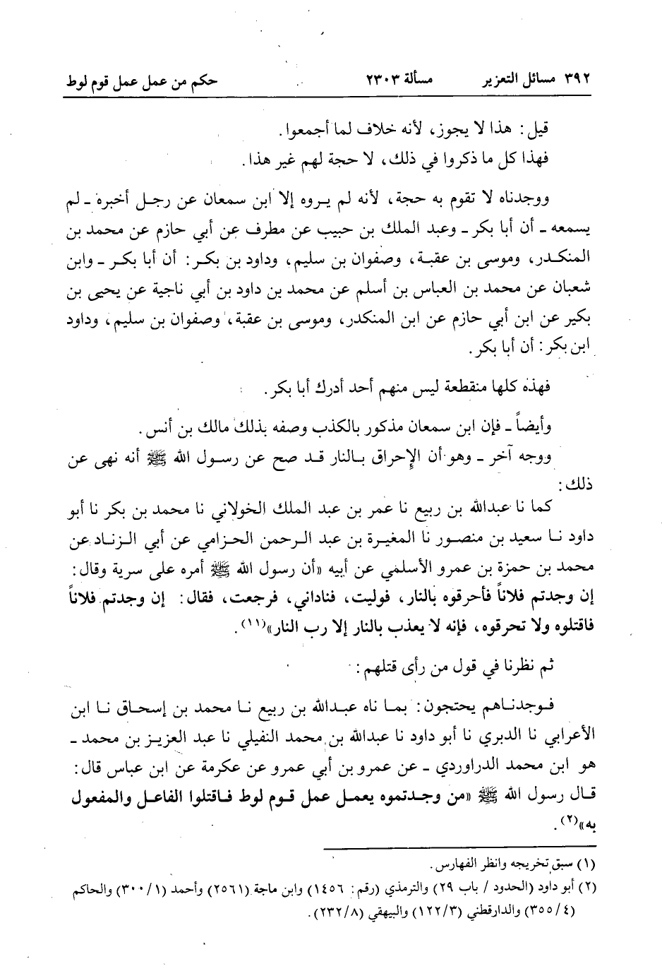 ثُمَّ نَظَرْنَا فِي قَوْلِ مَنْ رَأَى قَتْلَهُمْ: فَوَجَدْنَاهُمْ يَحْتَجُّونَ: بِمَا نا عَبْدُ اللَّهِ بْنُ رَبِيعٍ نا مُحَمَّدُ بْنُ إِسْحَاقَ نا ابْنُ الْأَعْرَابِيِّ نا الدَّبَرِيُّ نا أَبُو دَاوُد نا عَبْدُ اللَّهِ بْنُ مُحَمَّدٍ النُّفَيْلِيُّ نا عَبْدُ الْعَزِيزِ بْنُ مُحَمَّدٍ - هُوَ ابْنُ مُحَمَّدٍ الدَّرَاوَرْدِيُّ - عَنْ عَمْرِو بْنِ أَبِي عَمْرٍو عَنْ عِكْرِمَةَ عَنْ ابْنِ عَبَّاسٍ قَالَ: قَالَ رَسُولُ اللَّهِ - صَلَّى اللَّهُ عَلَيْهِ وَسَلَّمَ - «مَنْ وَجَدْتُمُوهُ يَعْمَلُ عَمَلَ قَوْمِ لُوطٍ فَاقْتُلُوا الْفَاعِلَ وَالْمَفْعُولَ بِهِ» .