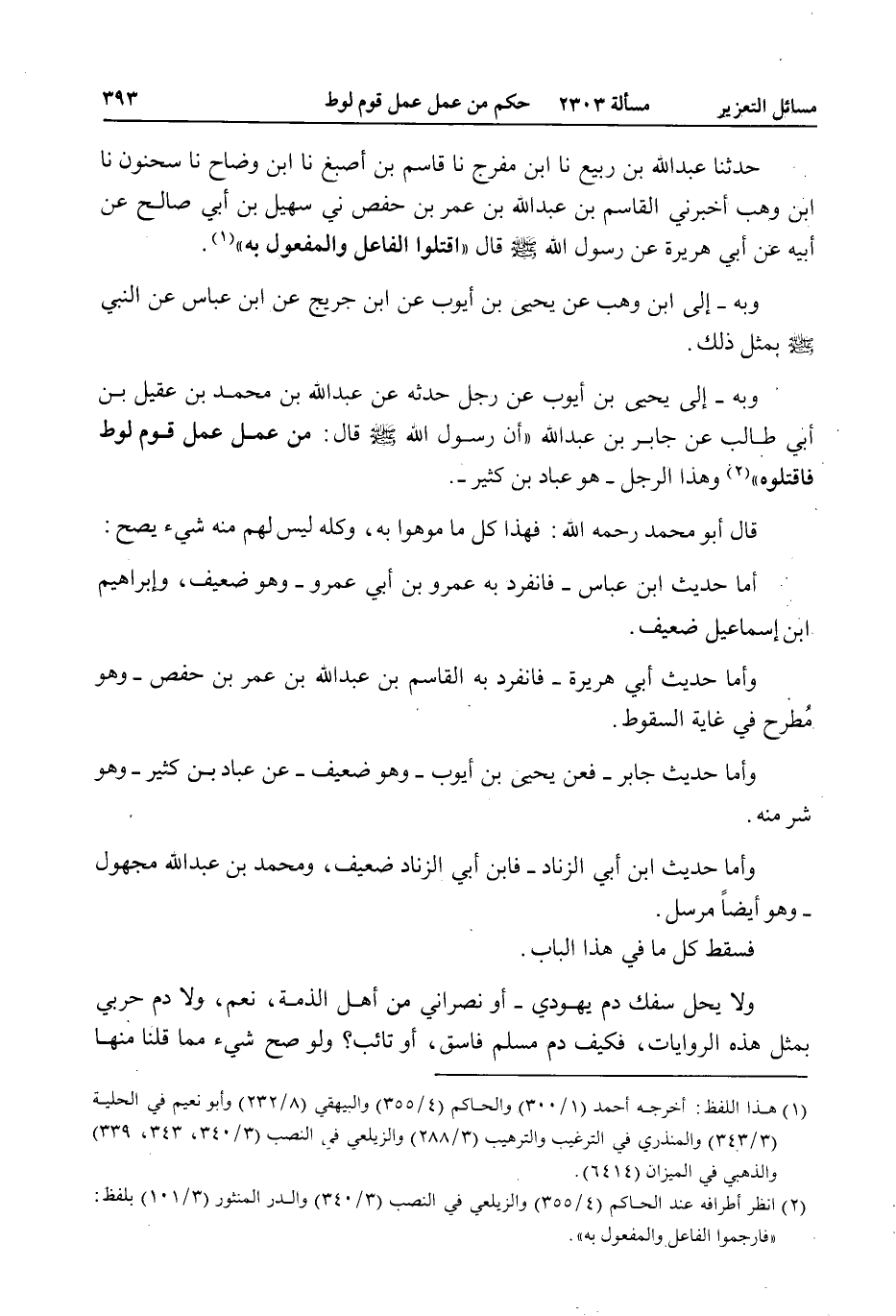 وَبِهِ - إلَى يَحْيَى بْنِ أَيُّوبَ عَنْ رَجُلٍ حَدَّثَهُ عَنْ عَبْدِ اللَّهِ بْنِ مُحَمَّدِ بْنِ عَقِيلِ بْنِ أَبِي طَالِبٍ عَنْ جَابِرِ بْنَ عَبْدِ اللَّهِ أَنَّ رَسُولَ اللَّهِ - صَلَّى اللَّهُ عَلَيْهِ وَسَلَّمَ - قَالَ: «مَنْ عَمِلَ عَمَلَ قَوْمِ لُوطٍ فَاقْتُلُوهُ» وَهَذَا الرَّجُلُ - هُوَ عَبَّادُ بْنُ كَثِيرٍ.