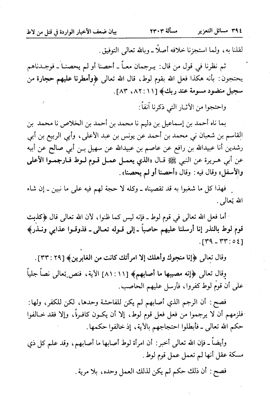 ثُمَّ نَظَرْنَا فِي قَوْلِ مَنْ قَالَ: يُرْجَمَانِ مَعًا - أَحْصَنَا أَوْ لَمْ يُحْصِنَا - فَوَجَدْنَاهُمْ يَحْتَجُّونَ: بِأَنَّهُ هَكَذَا فَعَلَ اللَّهُ بِقَوْمِ لُوطٍ، قَالَ اللَّهُ تَعَالَى {وَأَمْطَرْنَا عَلَيْهَا حِجَارَةً مِنْ سِجِّيلٍ مَنْضُودٍ - مُسَوَّمَةً عِنْدَ رَبِّكَ} [هود: 82 - 83] .