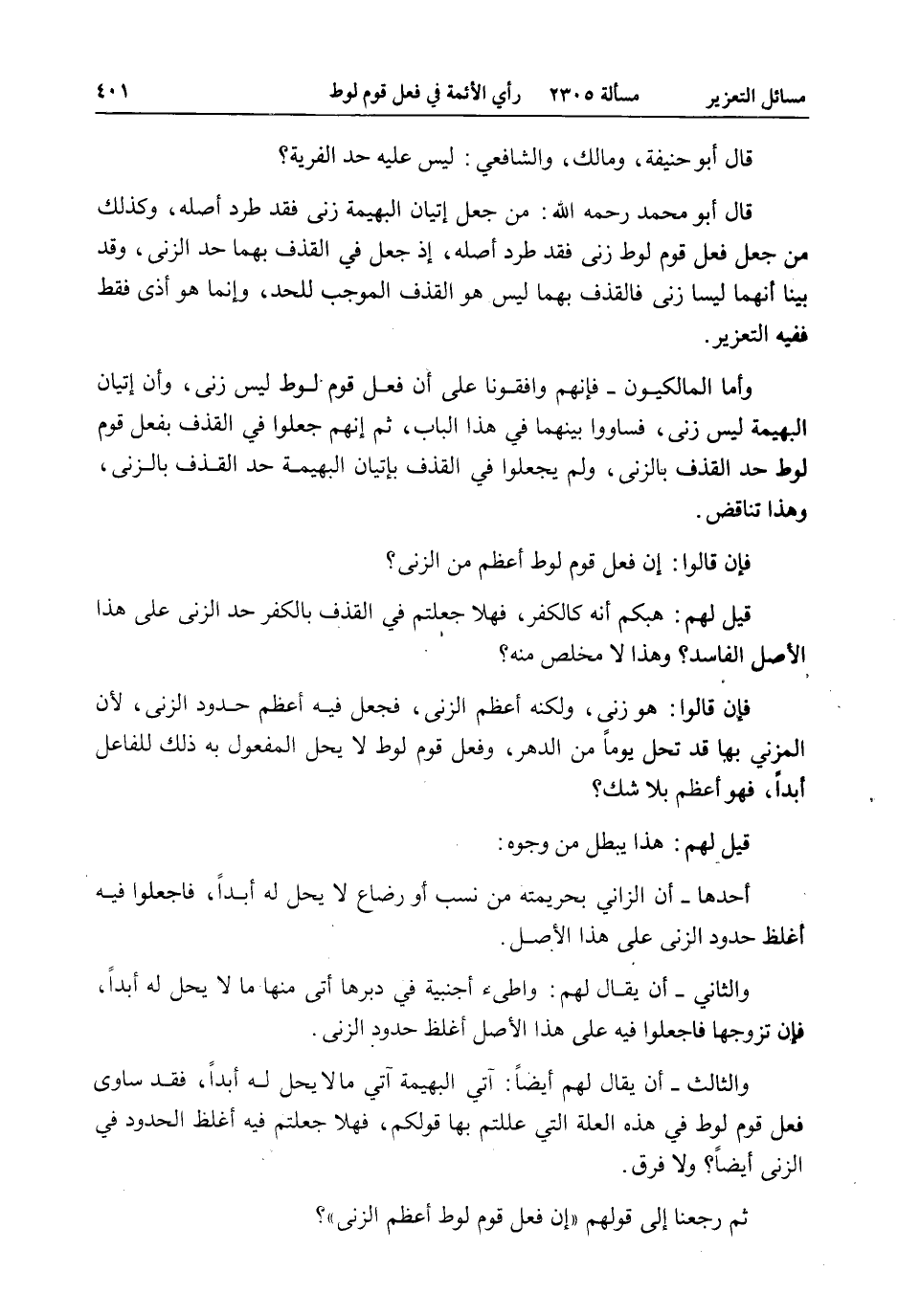 وَالثَّالِثُ - أَنْ يُقَالَ لَهُمْ أَيْضًا: آتِي الْبَهِيمَةَ آتِي مَا لَا يَحِلُّ لَهُ أَبَدًا، فَقَدْ سَاوَى فِعْلَ قَوْمِ لُوطٍ فِي هَذِهِ الْعِلَّةِ الَّتِي عَلَّلْتُمْ بِهَا قَوْلَكُمْ، فَهَلَّا جَعَلْتُمْ فِيهِ أَغْلَظَ الْحُدُودِ فِي الزِّنَى أَيْضًا؟ وَلَا فَرْقَ، ثُمَّ رَجَعْنَا إلَى قَوْلِهِمْ " إنَّ فِعْلَ قَوْمِ لُوطٍ أَعْظَمُ الزِّنَى "؟