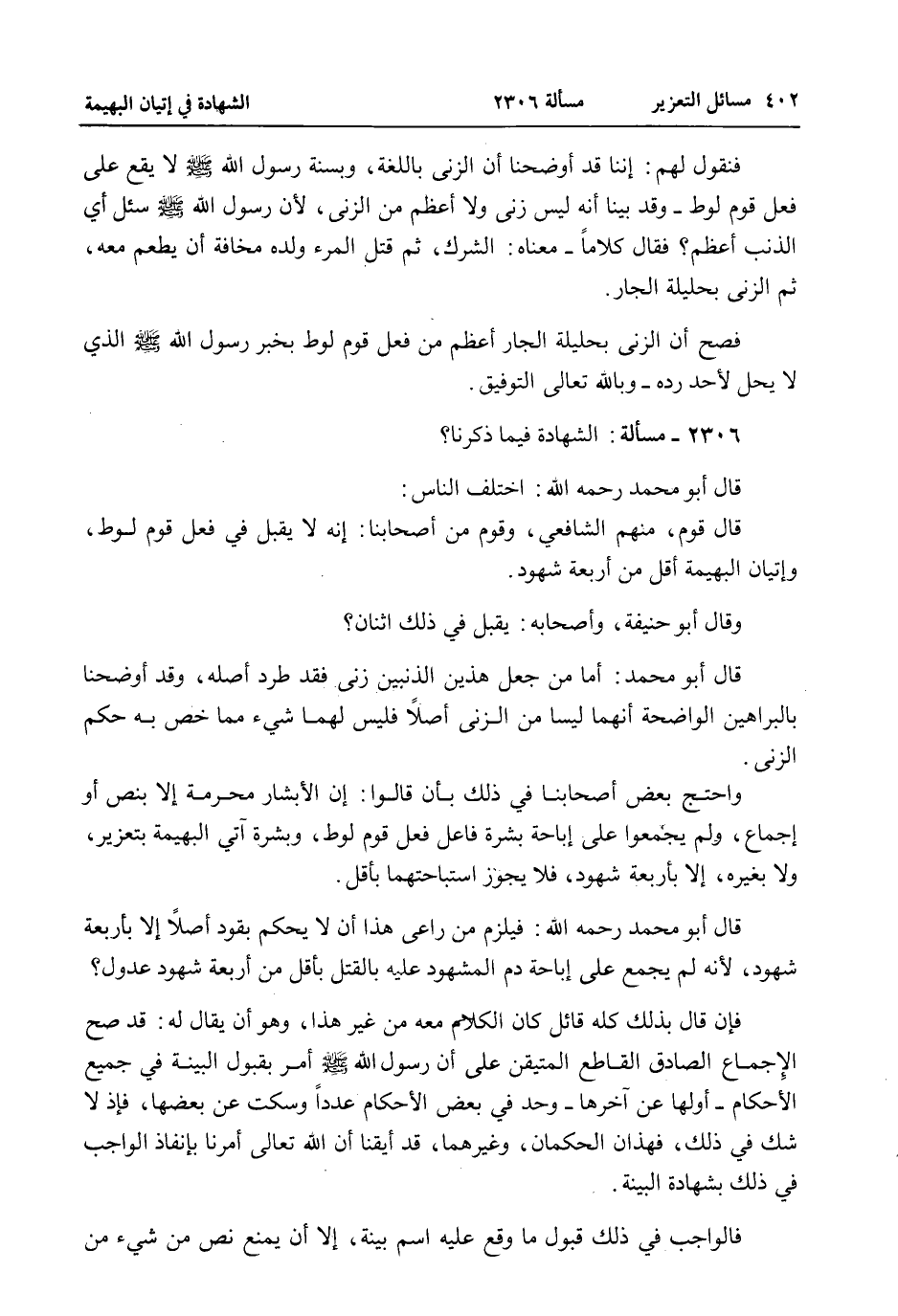 2306 -. مَسْأَلَةٌ: الشَّهَادَةُ فِيمَا ذَكَرْنَا؟ قَالَ أَبُو مُحَمَّدٍ - رَحِمَهُ اللَّهُ -: اخْتَلَفَ النَّاسُ: قَالَ قَوْم مِنْهُمْ الشَّافِعِيُّ، وَقَوْمٌ مِنْ أَصْحَابِنَا: إنَّهُ لَا يُقْبَلُ فِي فِعْلِ قَوْمِ لُوطٍ، وَإِتْيَانِ الْبَهِيمَةِ أَقَلُّ مِنْ أَرْبَعَةِ شُهُودٍ.