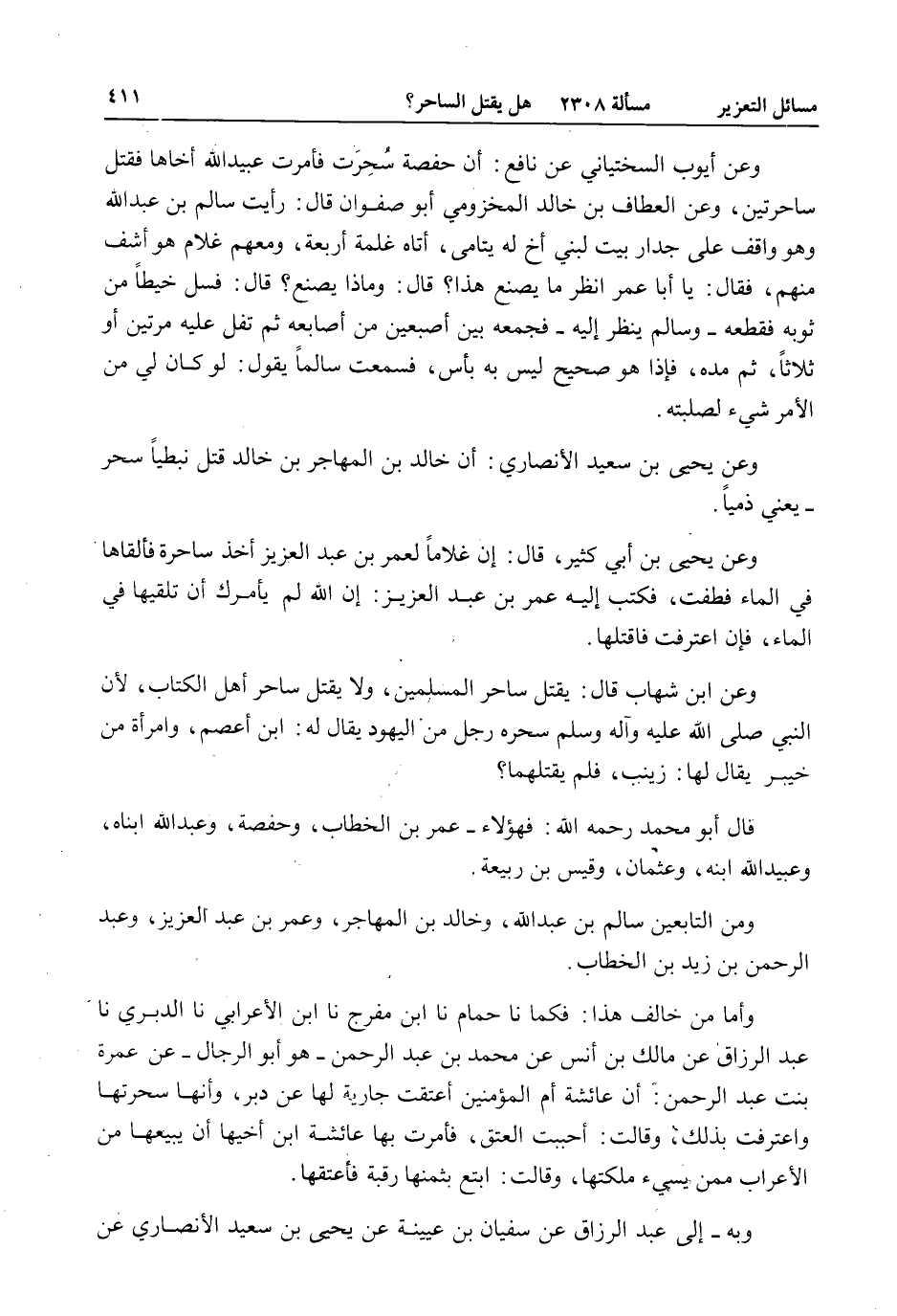 وَعَنْ أَيُّوبَ السِّخْتِيَانِيِّ عَنْ نَافِعٍ: أَنَّ حَفْصَةَ سُحِرَتْ فَأَمَرَتْ عُبَيْدَ اللَّهِ أَخَاهَا فَقَتَلَ سَاحِرَتَيْنِ، وَعَنْ الْعَطَّافِ بْنِ خَالِدٍ الْمَخْزُومِيِّ أَبُو صَفْوَانَ قَالَ: رَأَيْت سَالِمَ بْنَ عَبْدِ اللَّهِ وَهُوَ وَاقِفٌ عَلَى جِدَارِ بَيْتٍ لِبَنِي أَخٍ لَهُ يَتَامَى، أَتَاهُ غِلْمَةٌ أَرْبَعَةٌ، وَمَعَهُمْ غُلَامٌ هُوَ أَشَفُّ مِنْهُمْ، فَقَالَ: يَا أَبَا عُمَرَ اُنْظُرْ مَا يَصْنَعُ هَذَا؟ قَالَ: وَمَاذَا يَصْنَعُ؟ قَالَ: فَسَلْ خَيْطًا مِنْ ثَوْبِهِ فَقَطَعَهُ - وَسَالِمٌ يَنْظُرُ إلَيْهِ - فَجَمَعَهُ بَيْنَ أُصْبُعَيْنِ مِنْ أَصَابِعِهِ ثُمَّ تَفَلَ عَلَيْهِ مَرَّتَيْنِ أَوْ ثَلَاثًا، ثُمَّ مَدَّهُ، فَإِذَا هُوَ صَحِيحٌ لَيْسَ بِهِ بَأْسٌ، فَسَمِعْت سَالِمًا يَقُولُ: لَوْ كَانَ لِي مِنْ الْأَمْرِ شَيْءٌ لَصَلَبْتُهُ.
