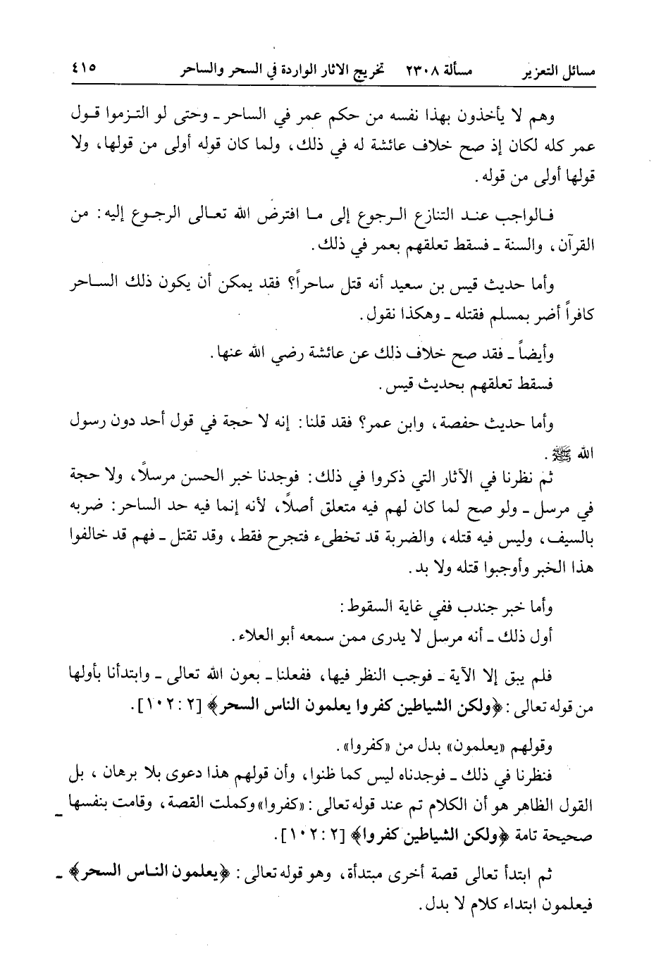 وَأَمَّا حَدِيثُ قَيْسِ بْنِ سَعِيدٍ أَنَّهُ قَتَلَ سَاحِرًا؟ فَقَدْ يُمْكِنُ أَنْ يَكُونَ ذَلِكَ السَّاحِرُ كَافِرًا أَضَرَّ بِمُسْلِمٍ فَقَتَلَهُ - وَهَكَذَا نَقُولُ.